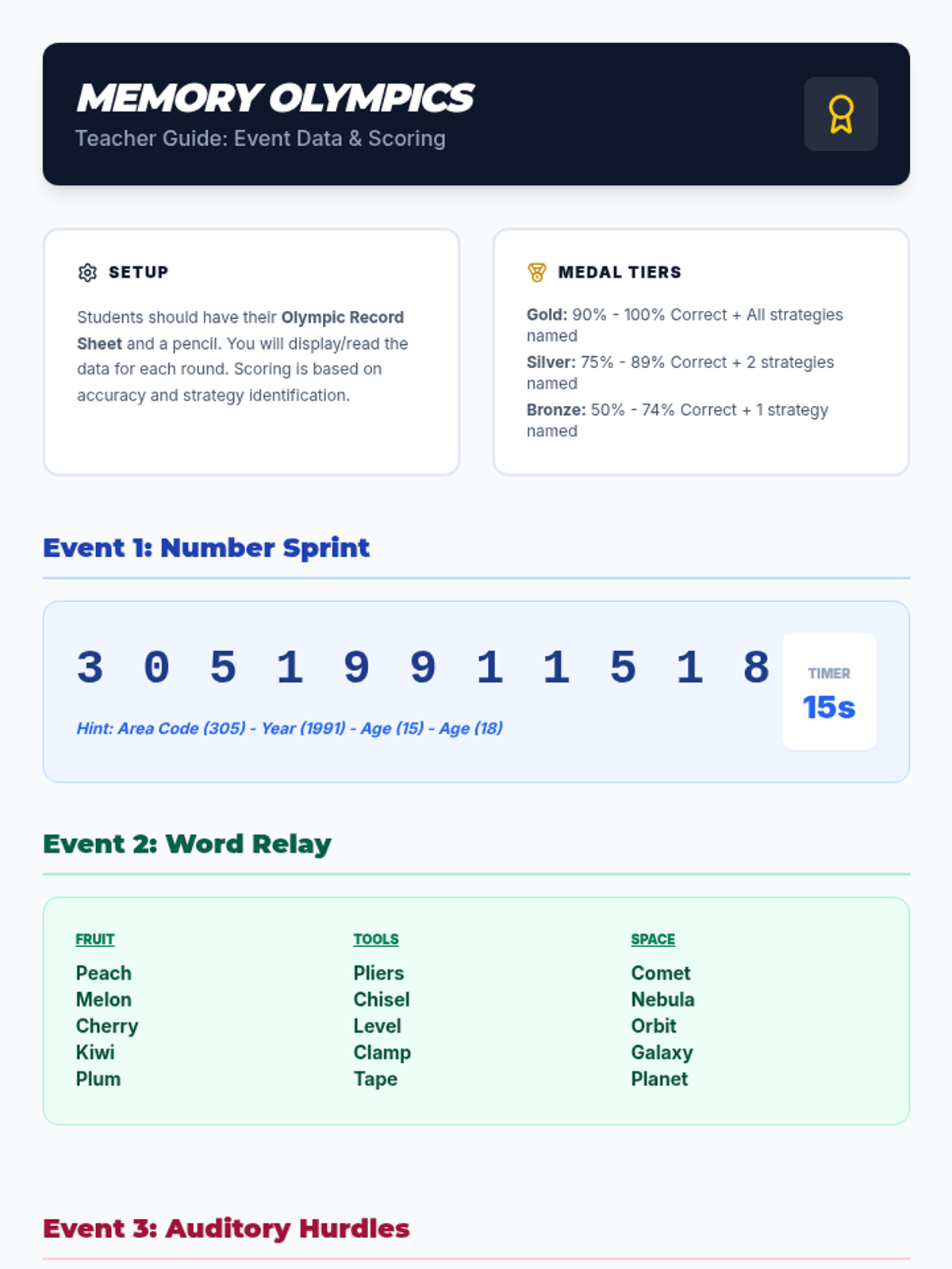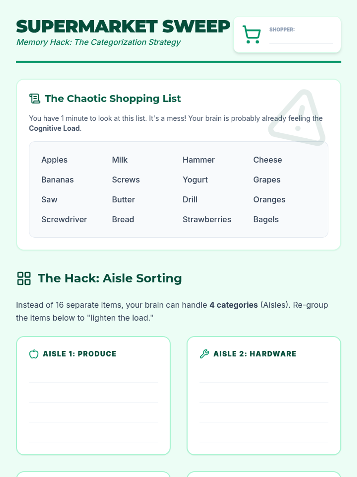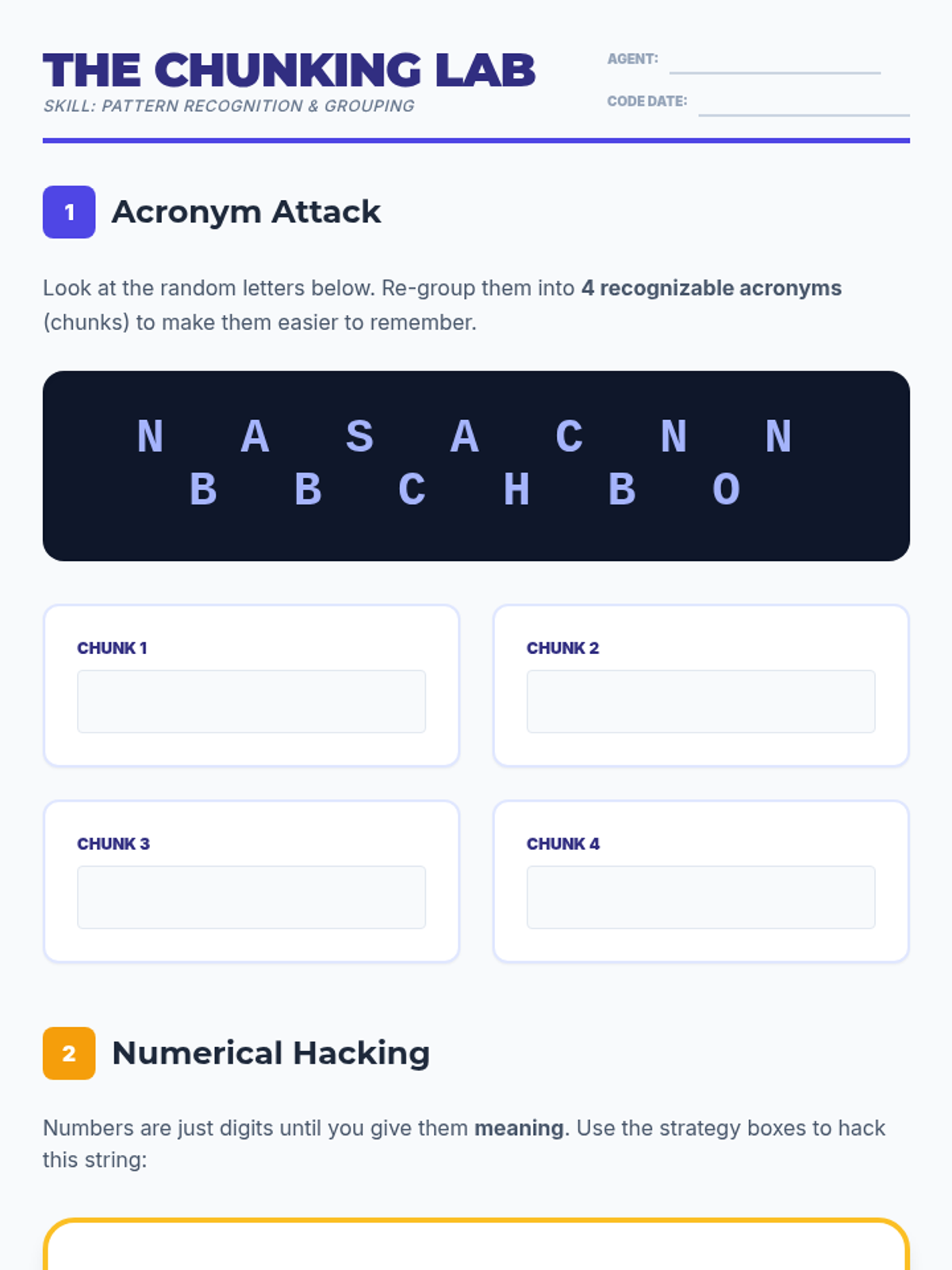 This sequence helps students understand and apply chunking and association strategies to overcome working memory limitations. Through a series of game-based lessons, students will learn to organize data into manageable patterns to increase their cognitive processing capacity.