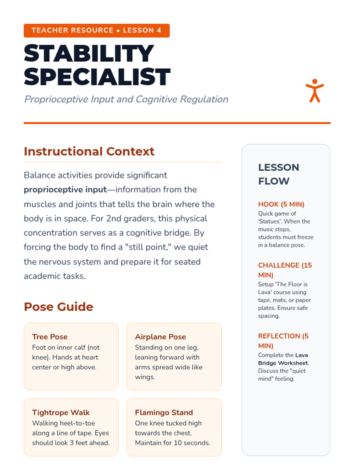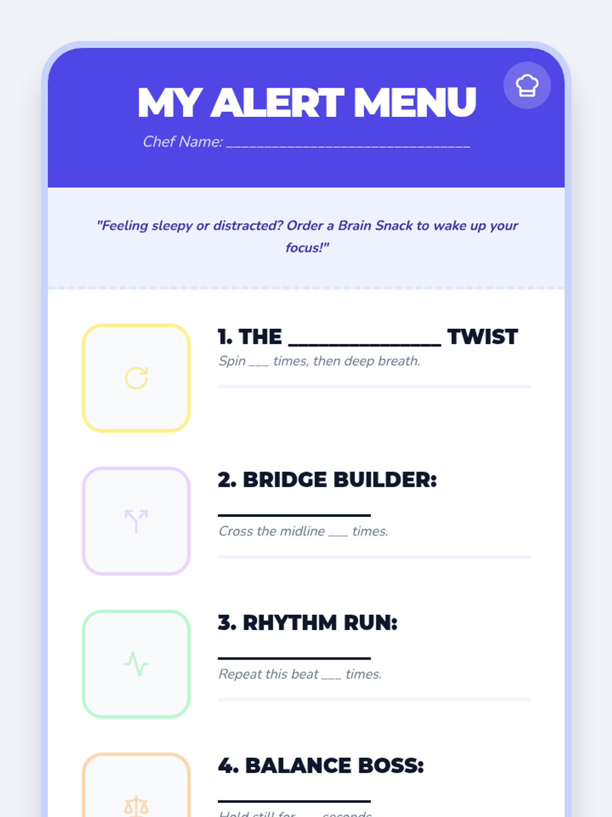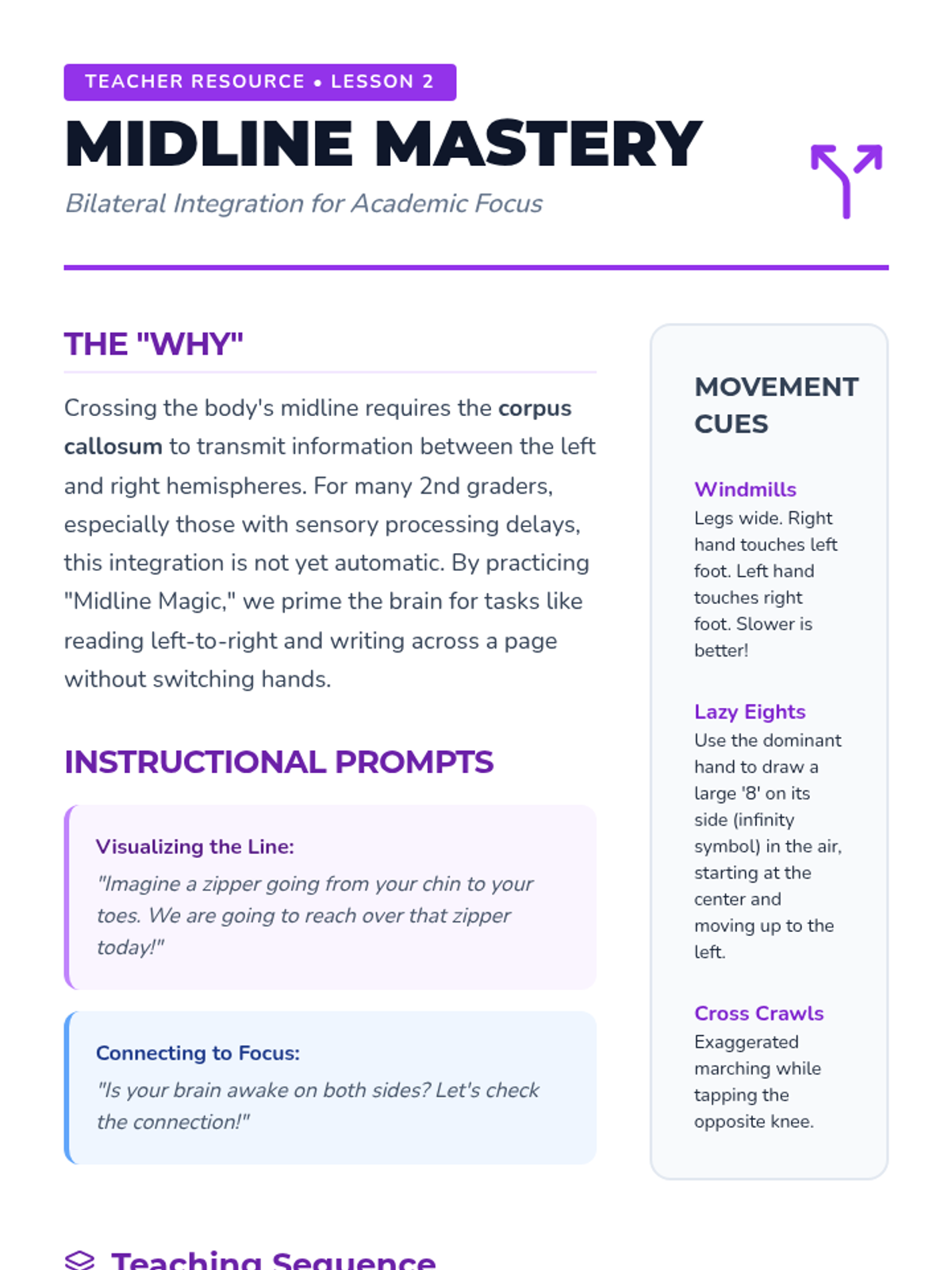 A 5-lesson sequence for 2nd graders to explore how different types of movement—vestibular, cross-lateral, rhythmic, and balance—can 'wake up' the brain. Students learn to self-regulate and culminate by creating a personalized 'Alert Menu' for focus.