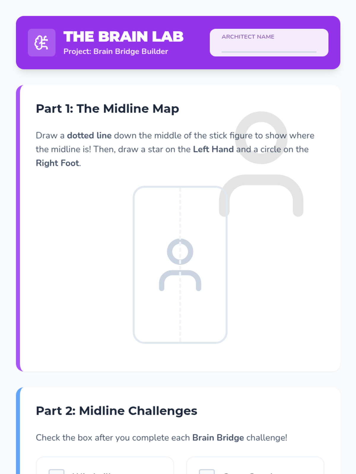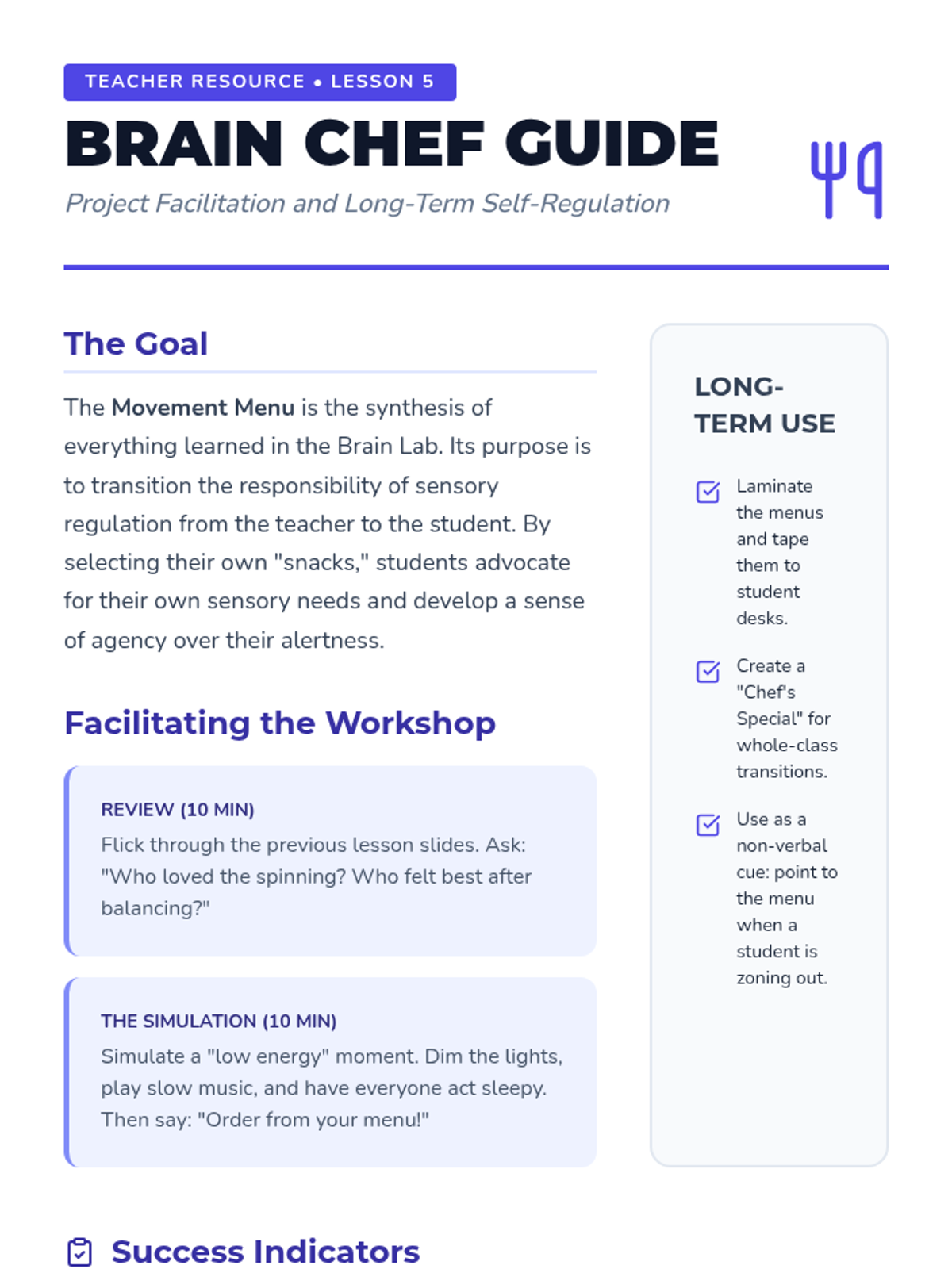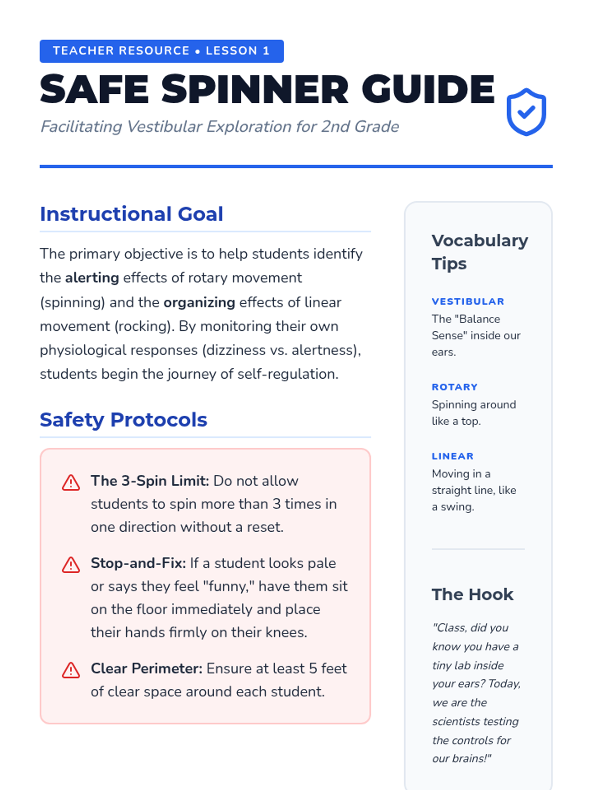 A 5-lesson sequence for 2nd graders to explore how different types of movement—vestibular, cross-lateral, rhythmic, and balance—can 'wake up' the brain. Students learn to self-regulate and culminate by creating a personalized 'Alert Menu' for focus.