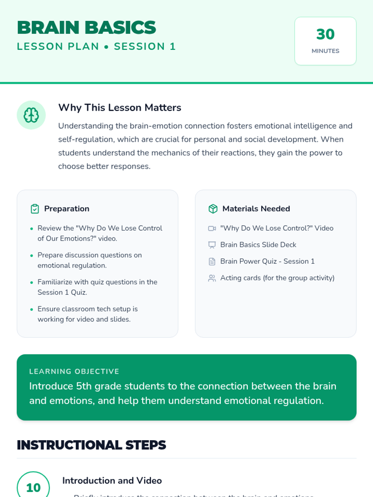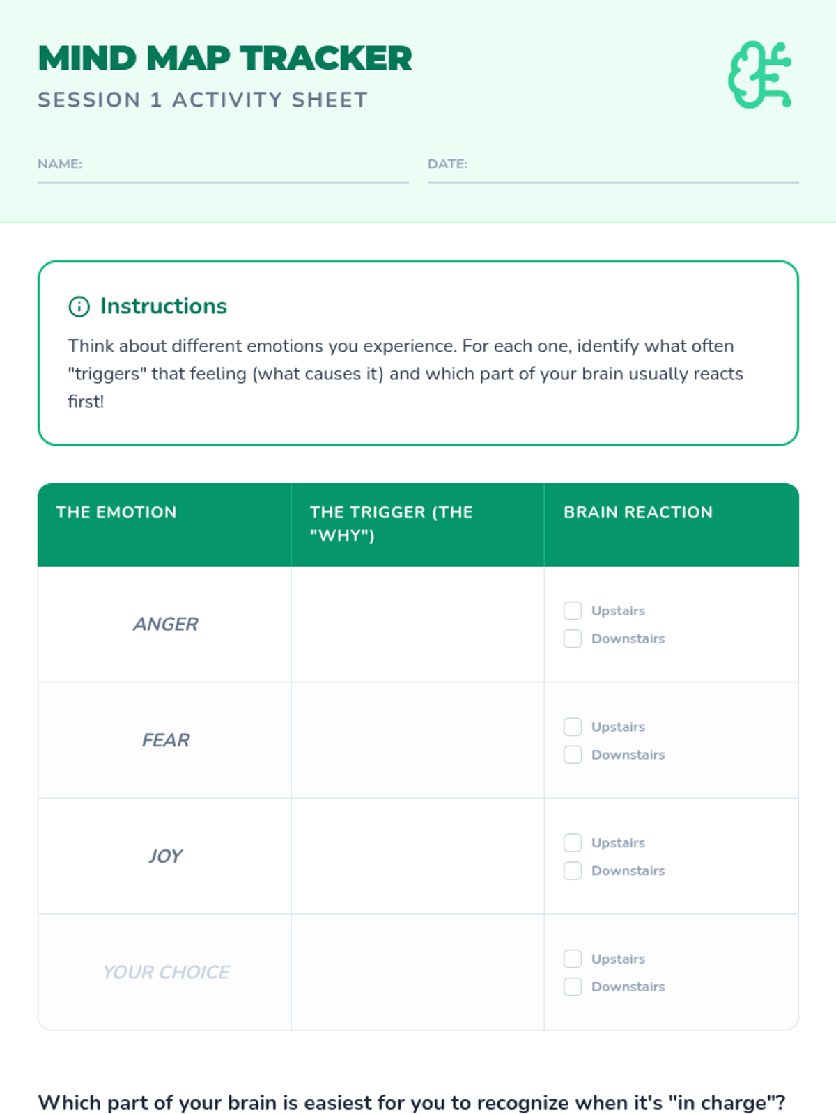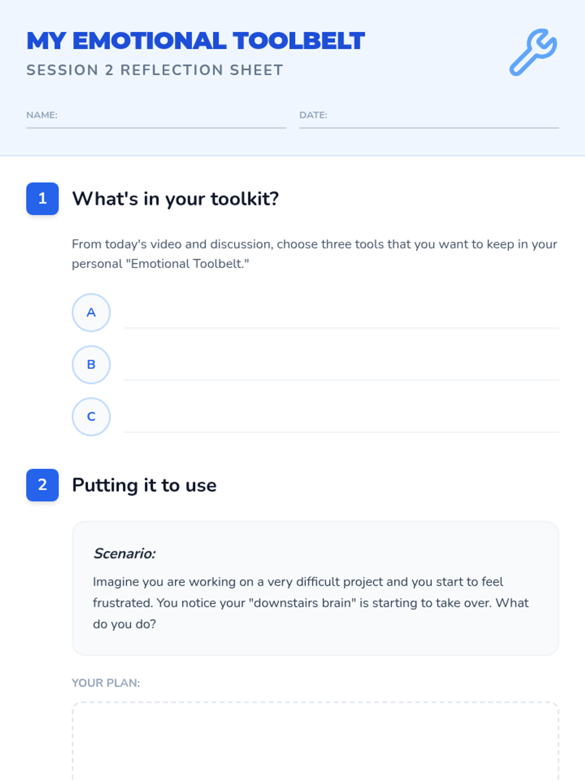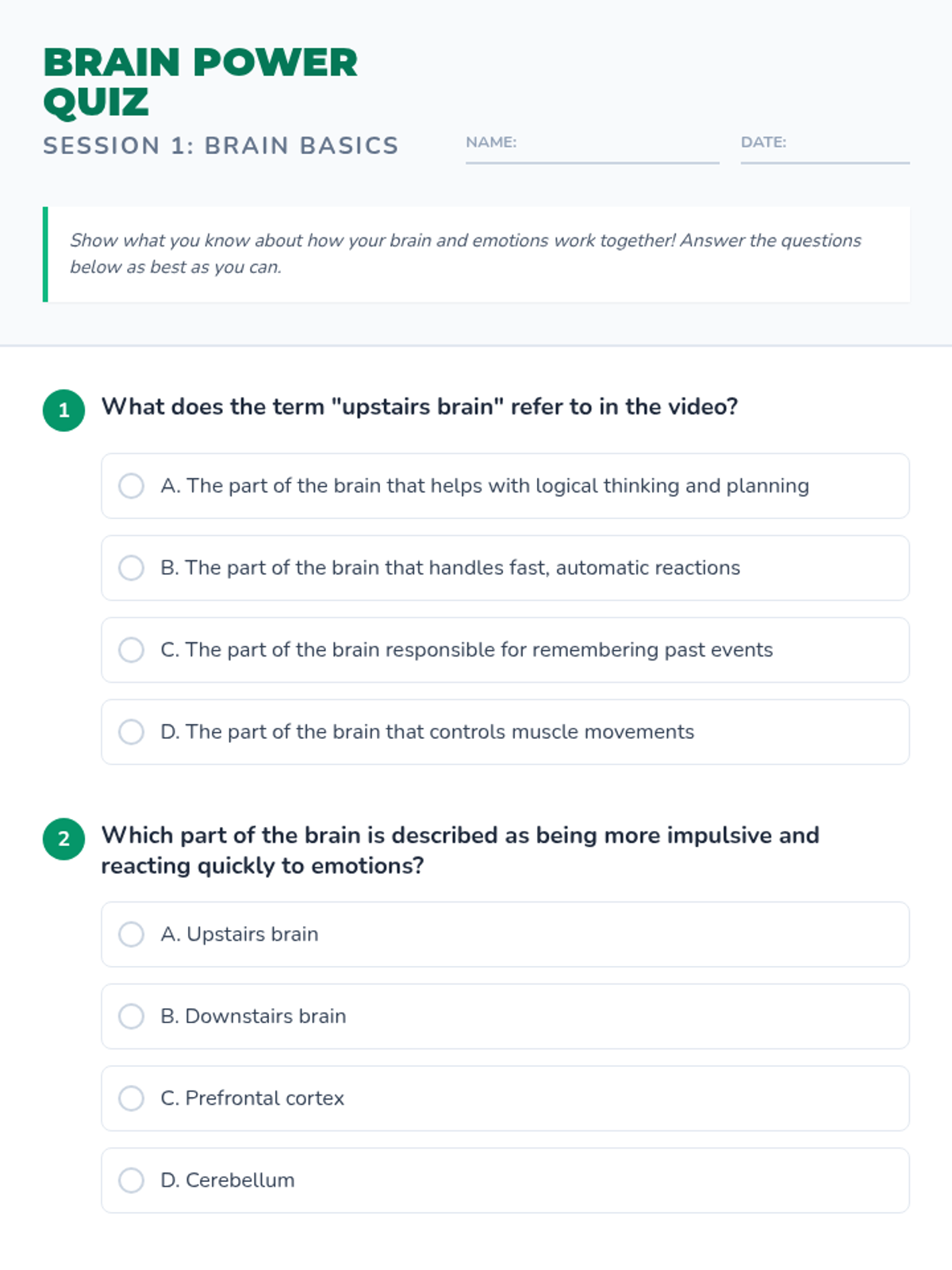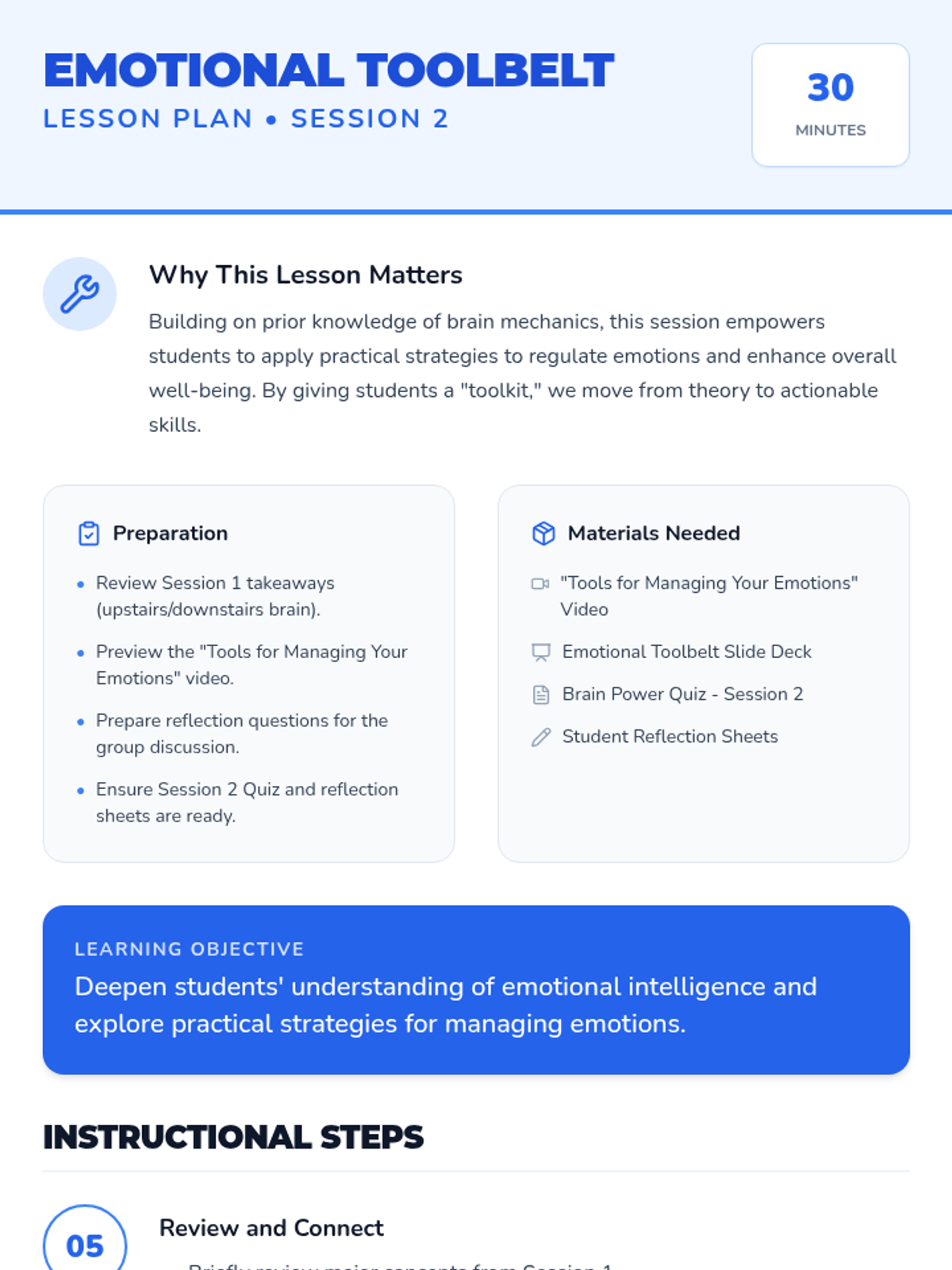 A two-session sequence for 5th graders exploring the neurological roots of emotions and practical strategies for emotional regulation. Students learn about the 'upstairs' and 'downstairs' brain and build a personal toolkit for managing big feelings.