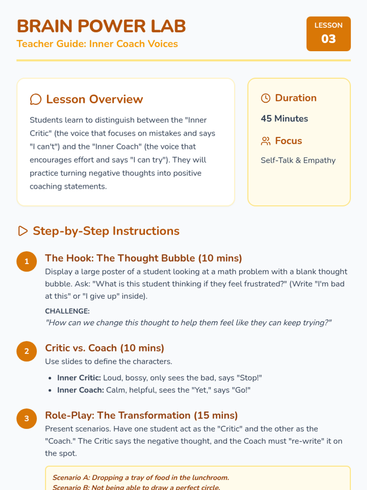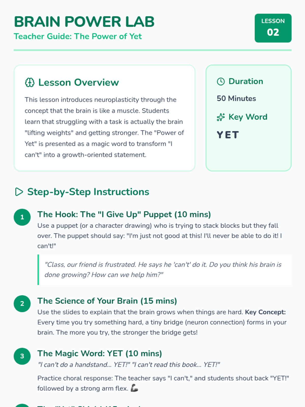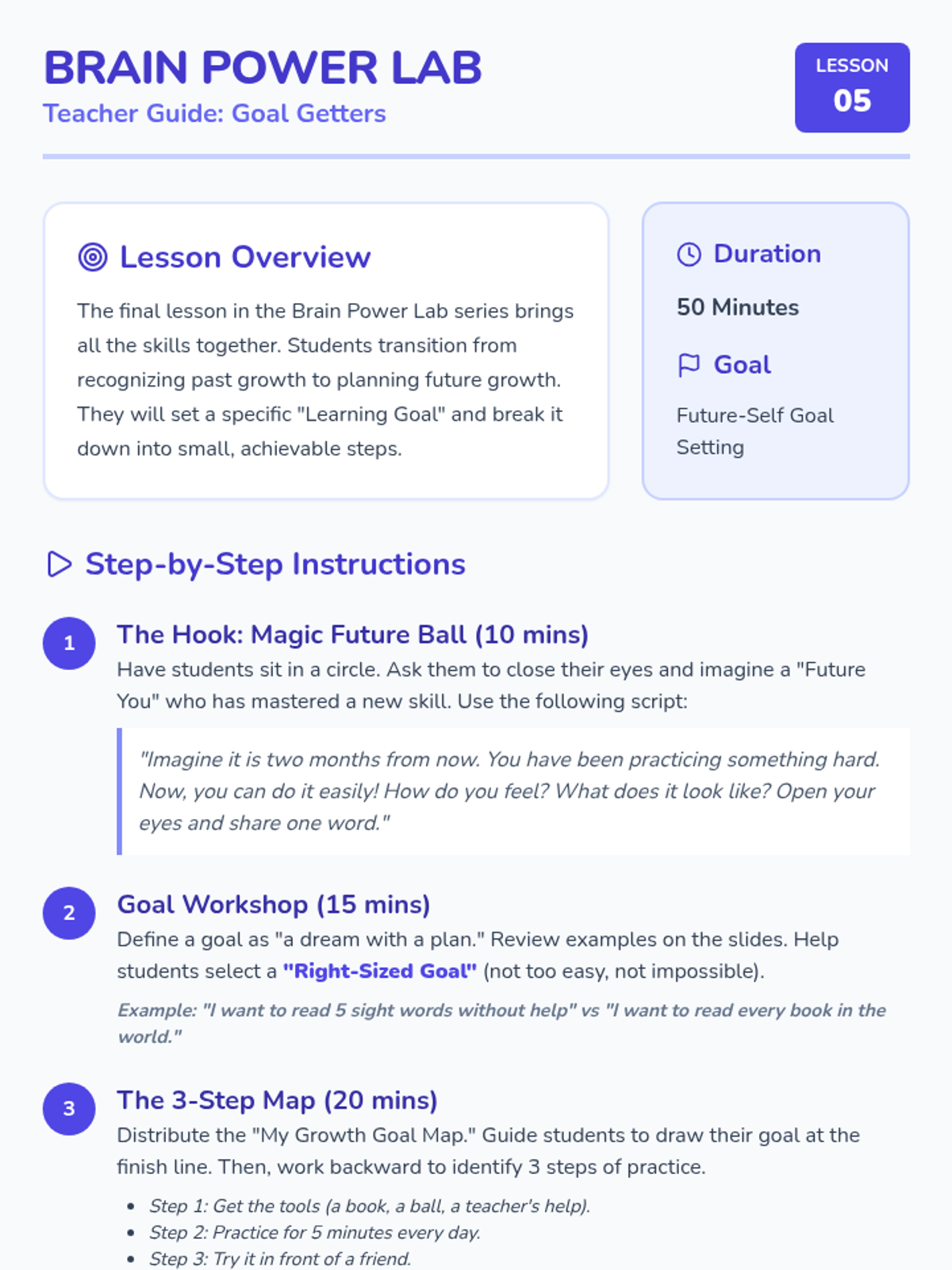 A 1st-grade sequence focused on developing self-efficacy and a growth mindset. Students learn to recognize their own growth, understand neuroplasticity through the 'Power of Yet,' practice positive self-talk, and set personal goals for the future.