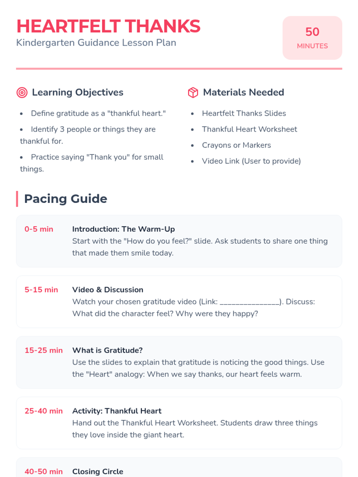 A two-lesson series for kindergarten students focusing on the concept of gratitude, identifying things they are thankful for, and practicing expressions of appreciation through creative activities.
