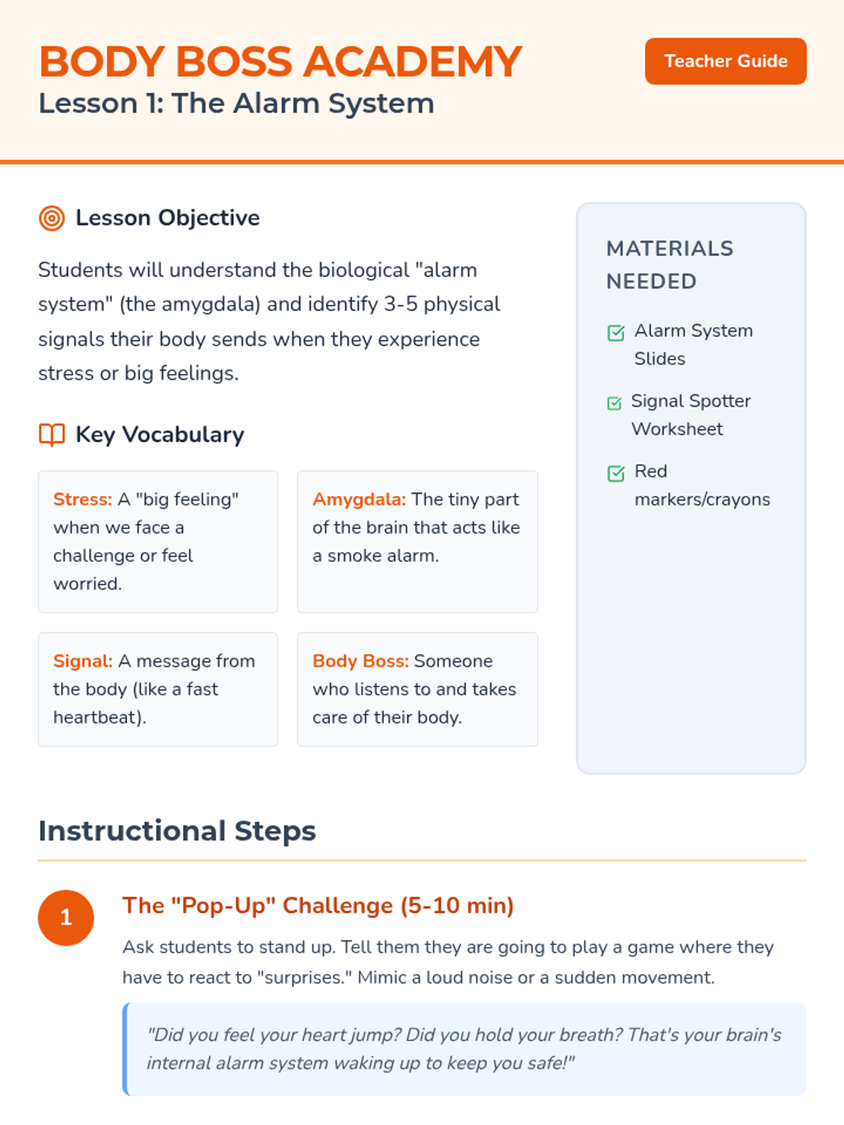 A 3-session stress management unit for elementary students that explores the body's physical response to stress and introduces positive self-talk and affirmations as tools for emotional regulation.