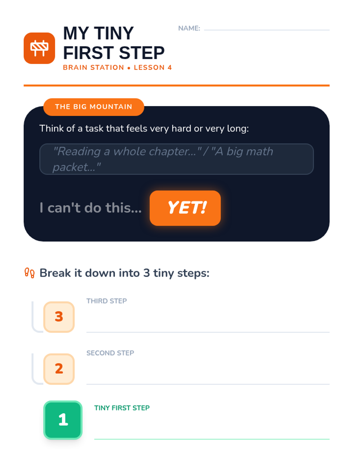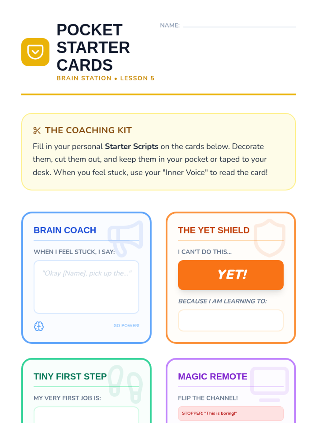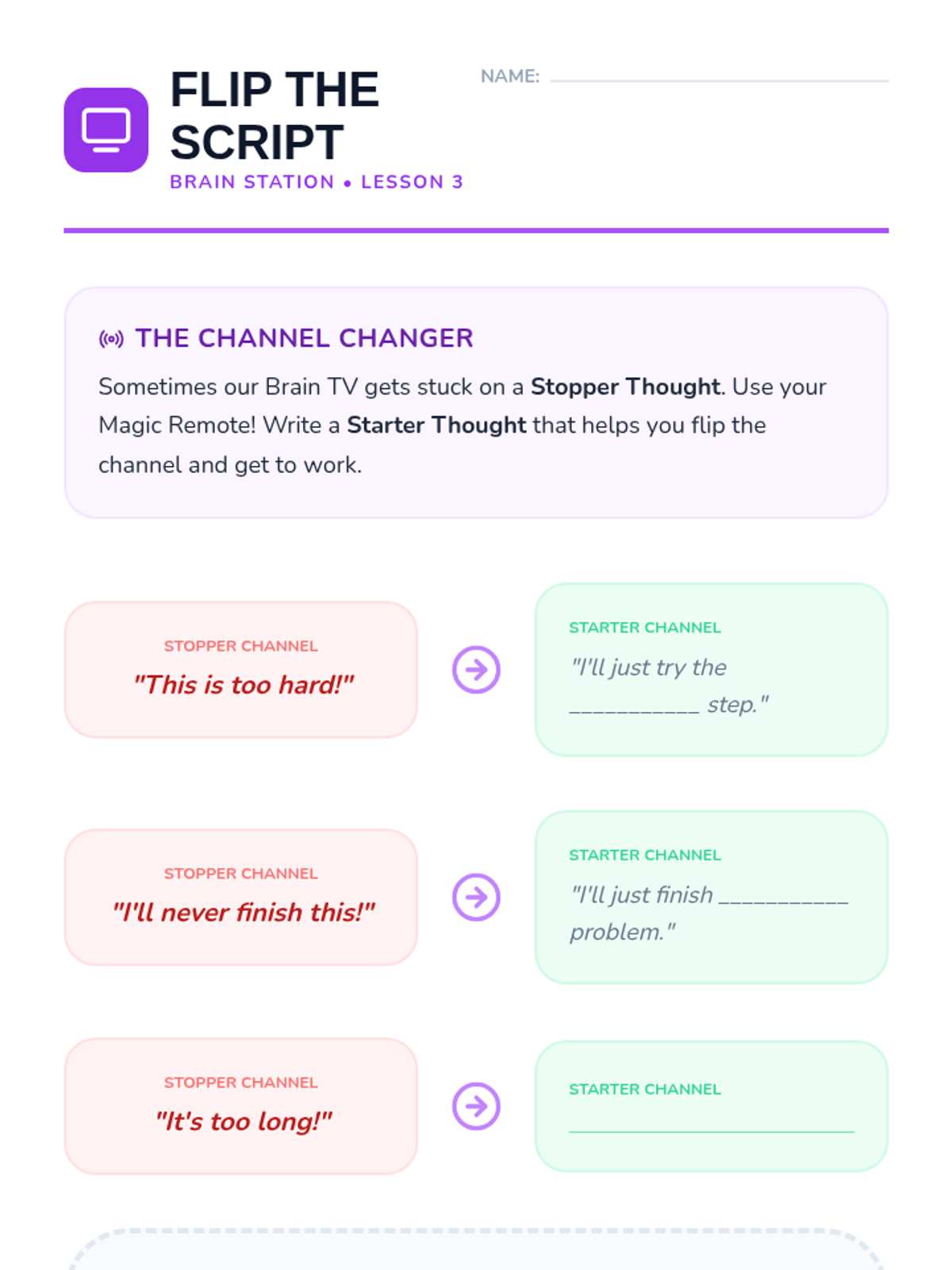 This sequence helps 2nd graders understand their 'inner voice' and use it as a tool for task initiation. Students learn to identify 'stopper' thoughts and replace them with 'starter' thoughts to overcome resistance and get to work.