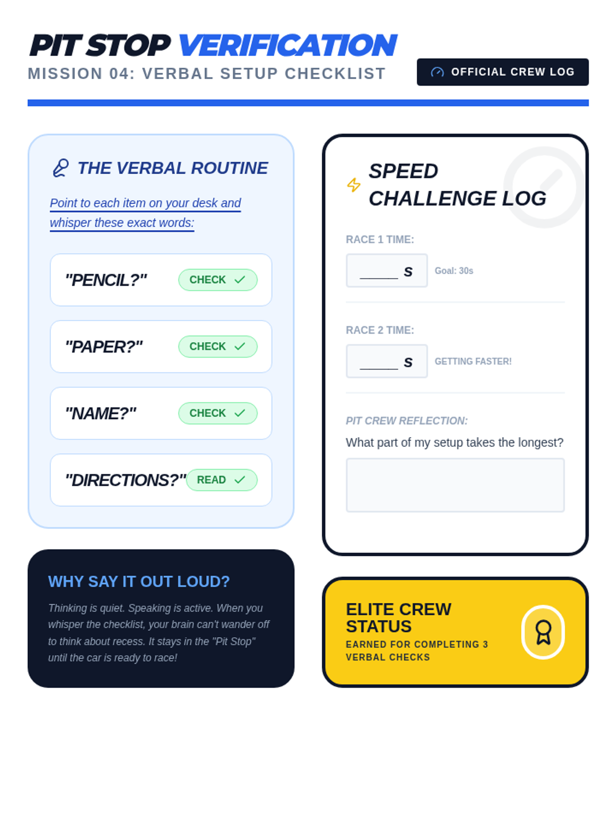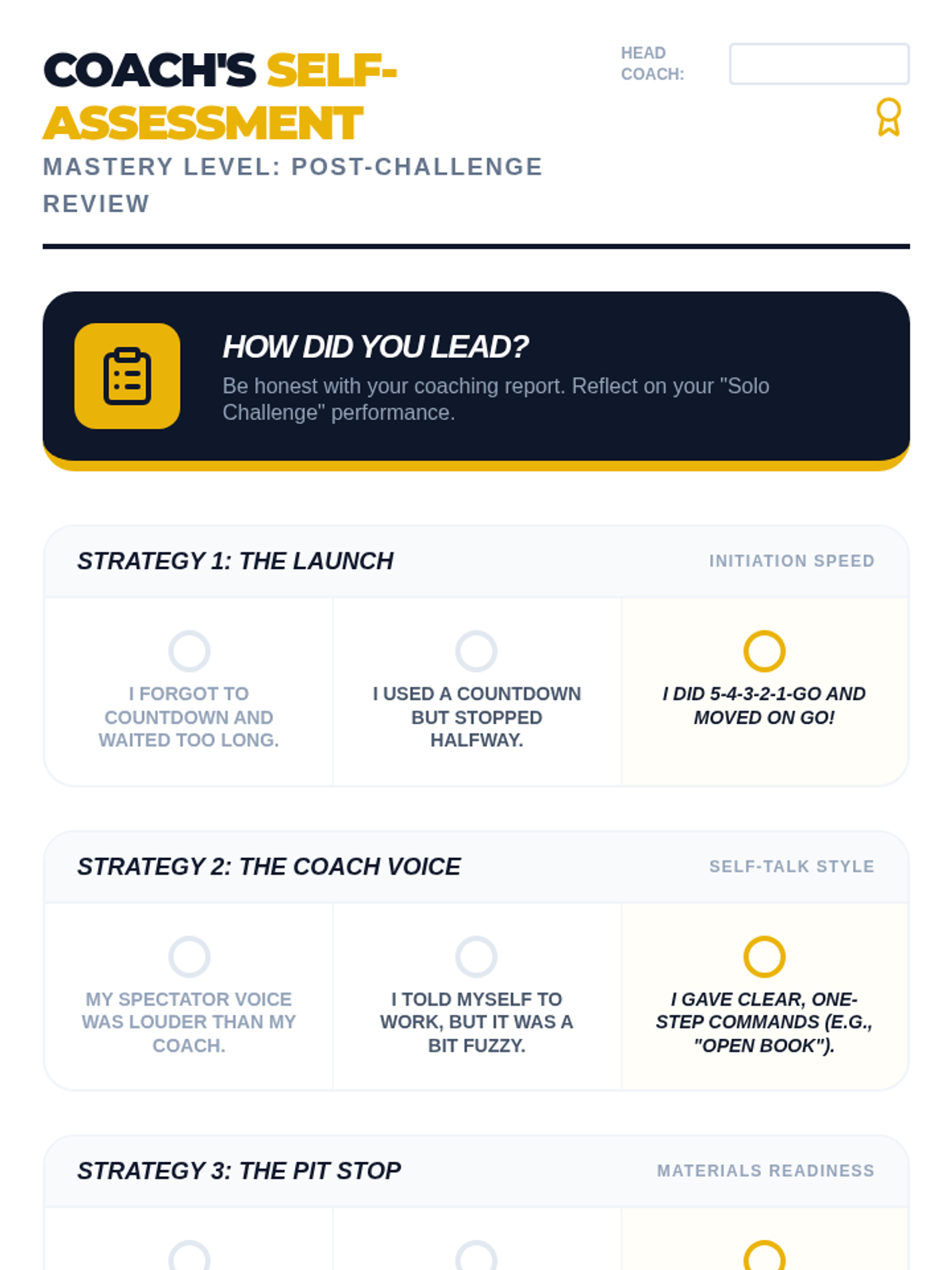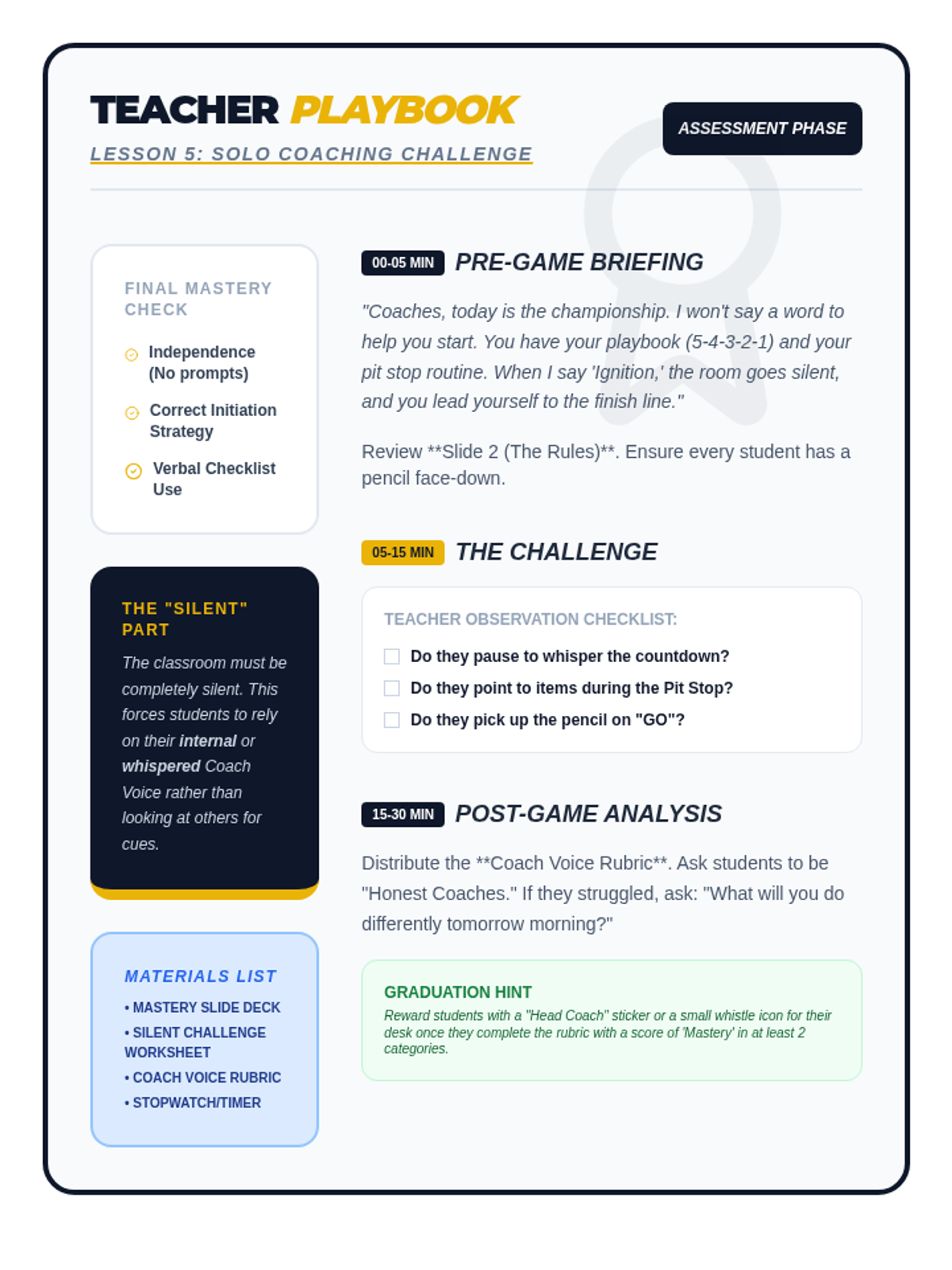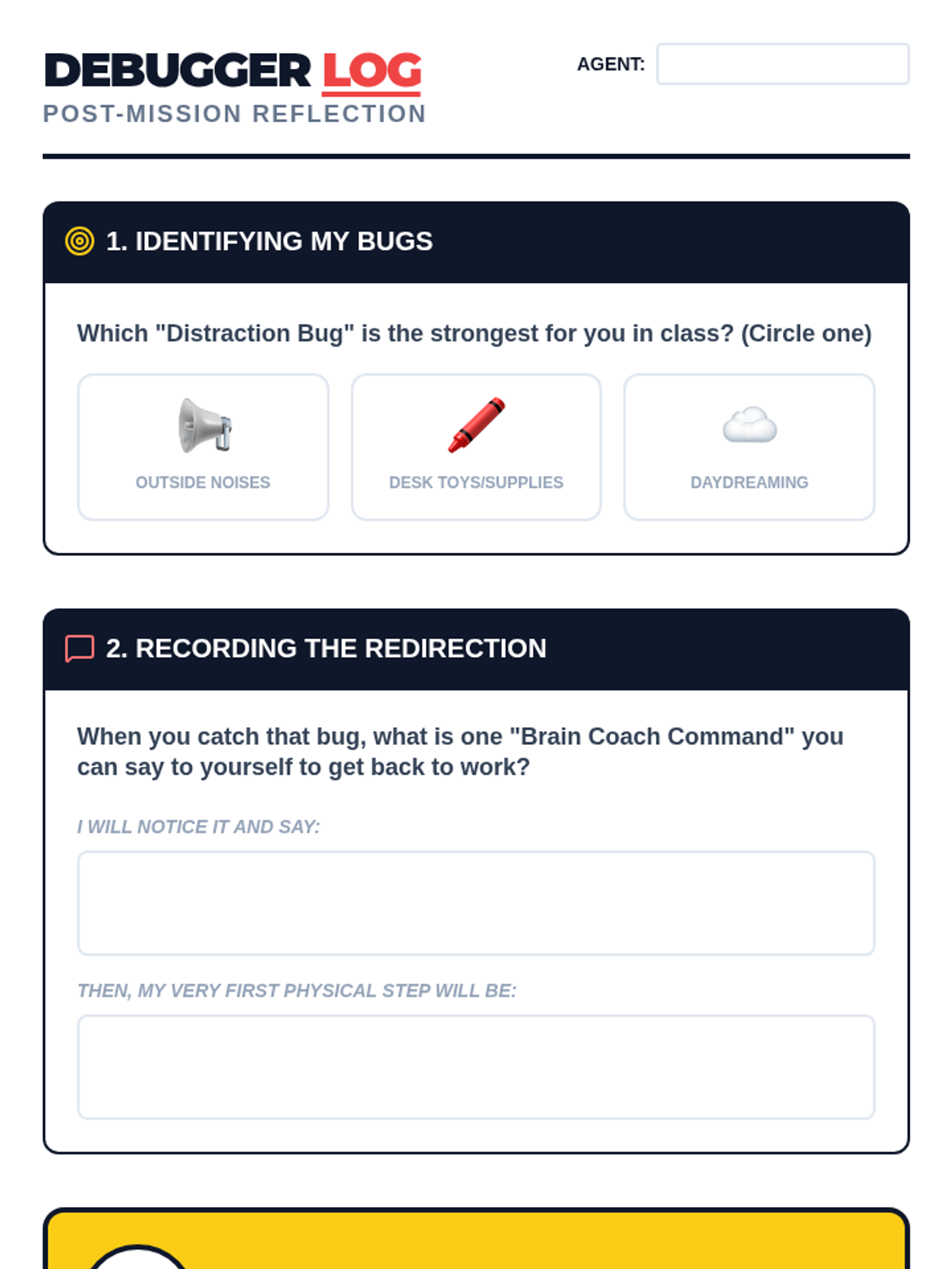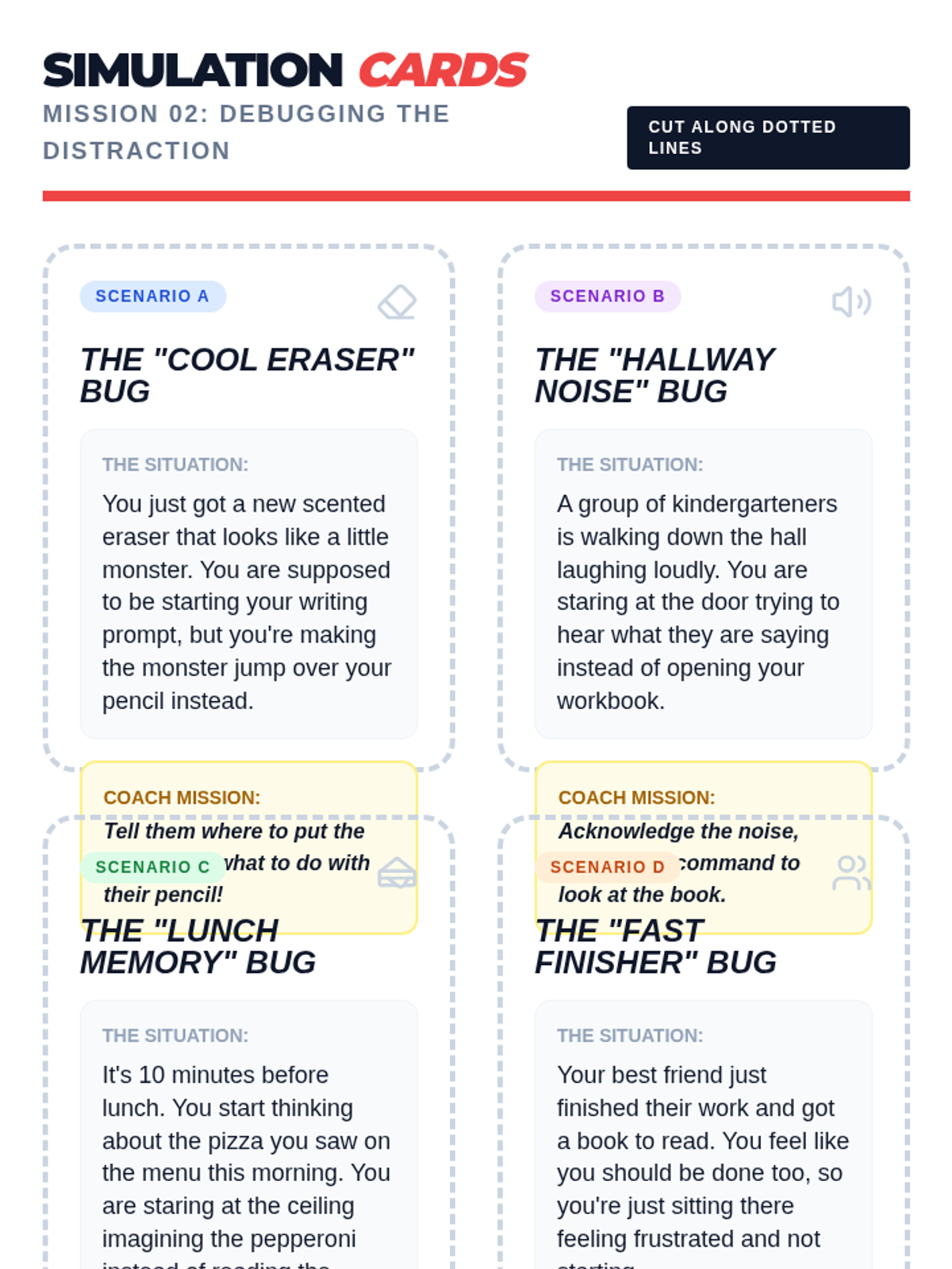 A sequence for 3rd graders to master self-talk strategies for task initiation. Students take on the role of 'Brain Coaches' to externalize executive function challenges and build a toolkit for overcoming procrastination through role-play, games, and simulations.