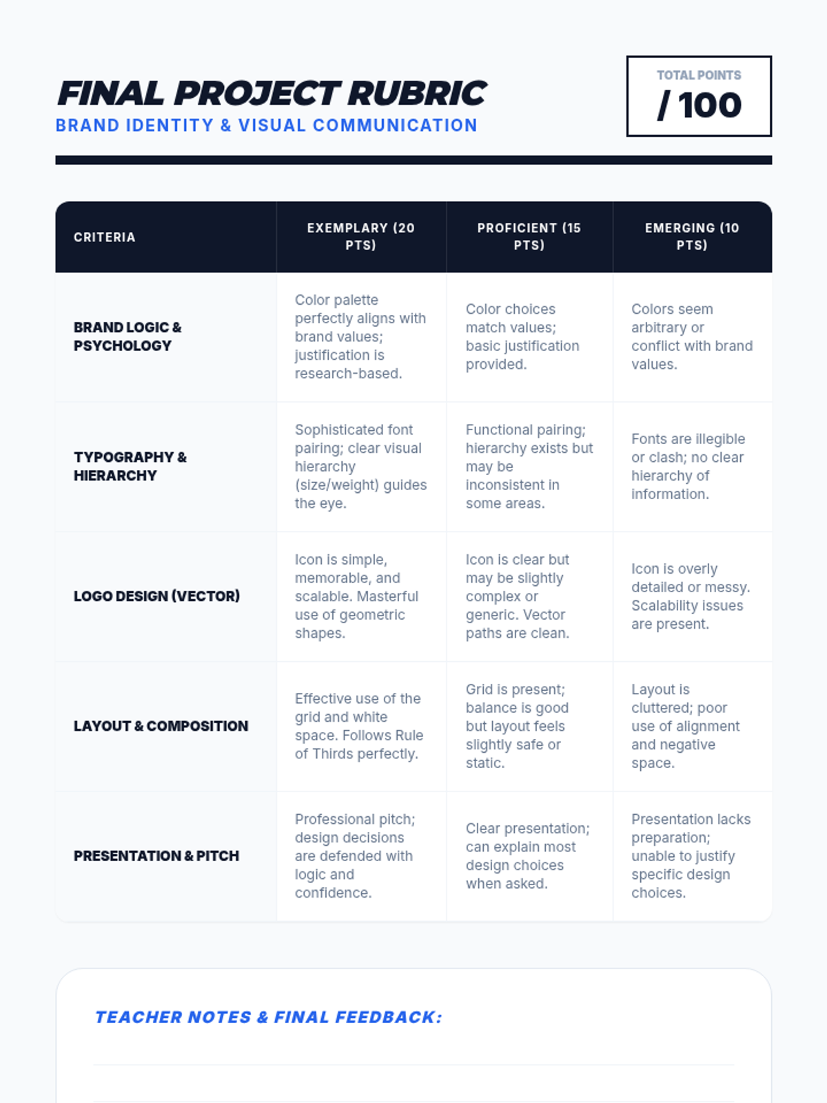A comprehensive introduction to graphic design where students build a cohesive brand identity from the ground up. Over five lessons, students master color psychology, typography, logo creation, and layout principles, culminating in a professional-style brand pitch.