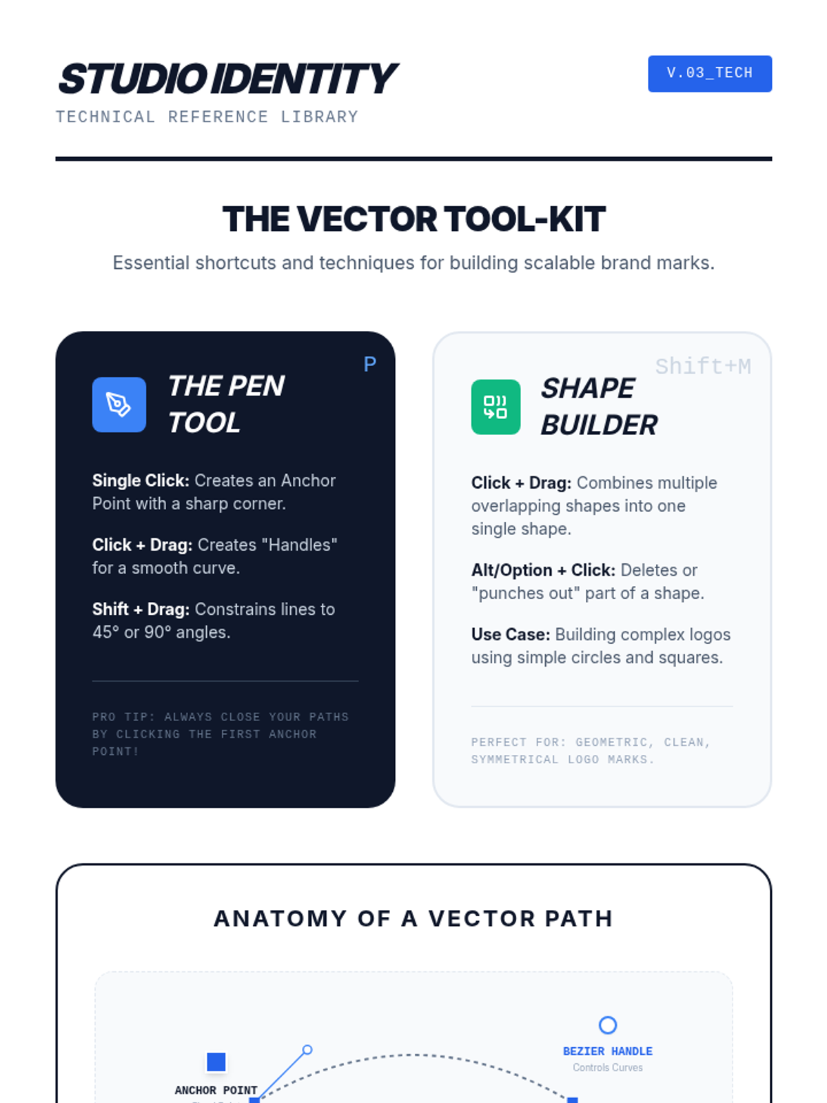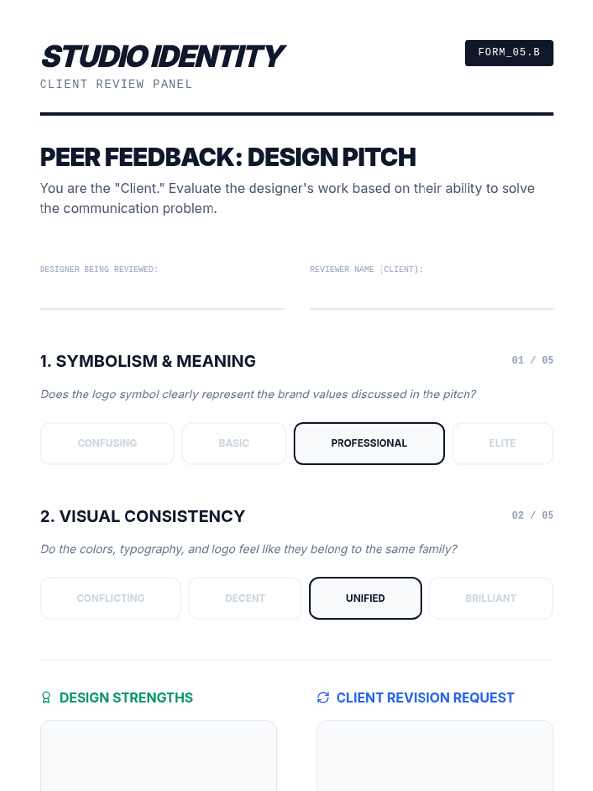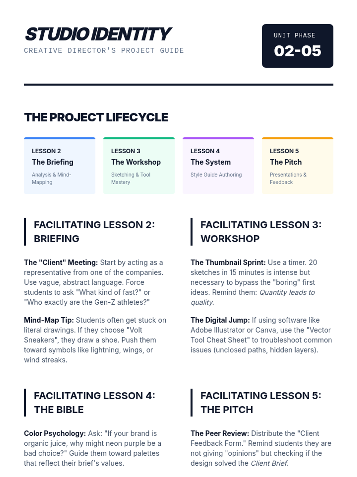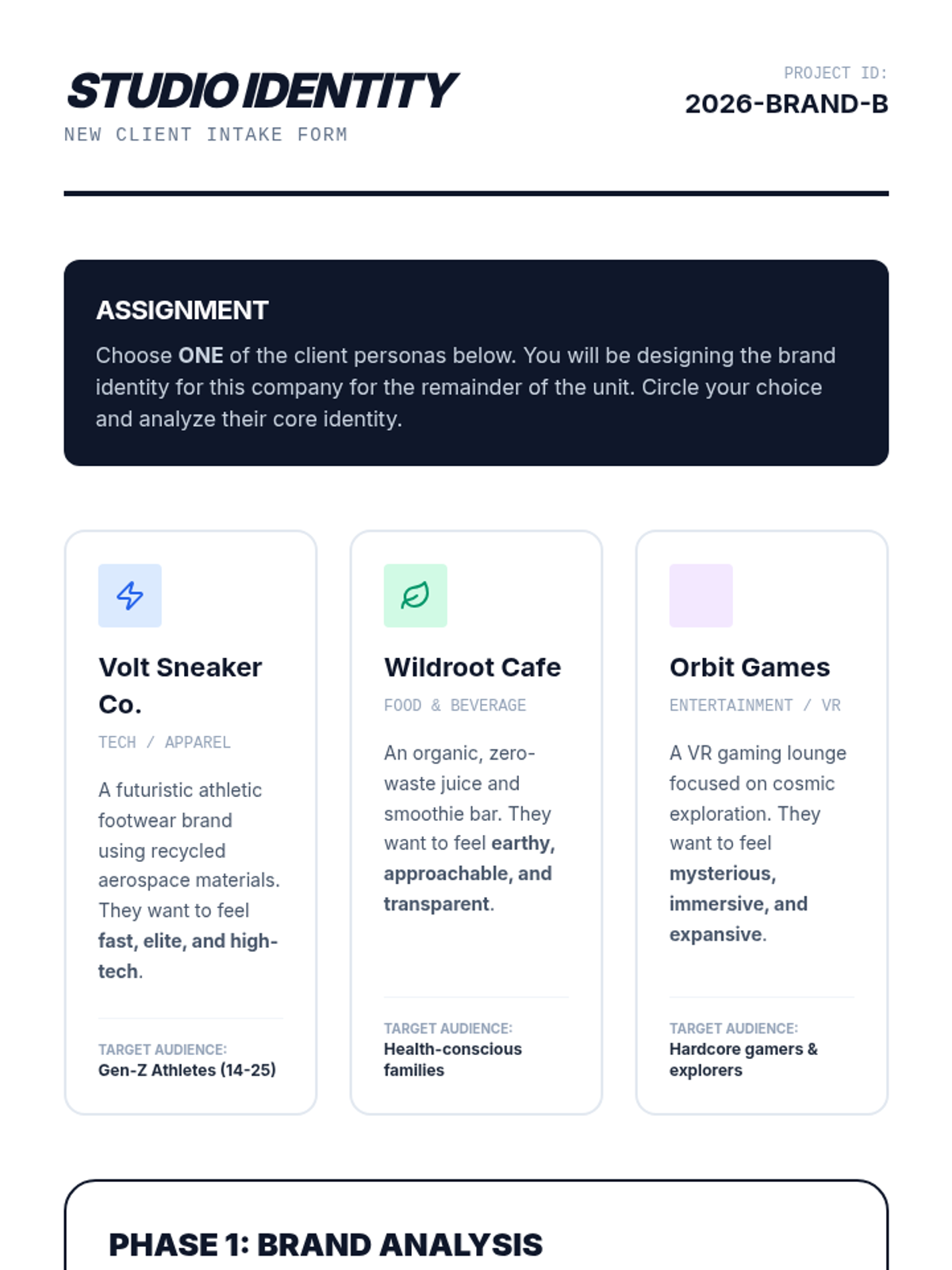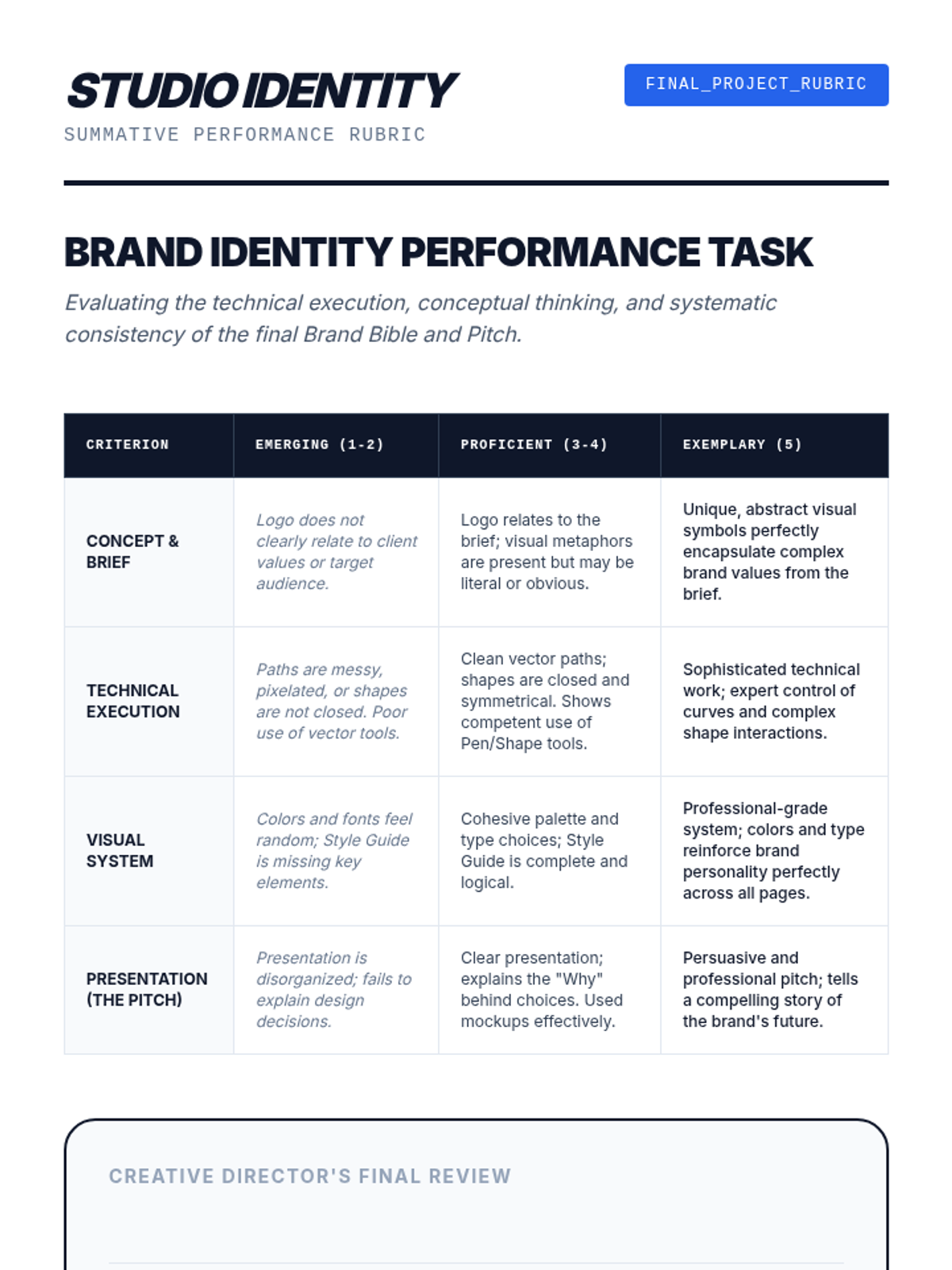 A comprehensive graphic design simulation where students act as a design agency to develop a full brand identity. They progress from analyzing logo symbolism and interpreting client briefs to digital vectorization and presenting a professional brand style guide.
