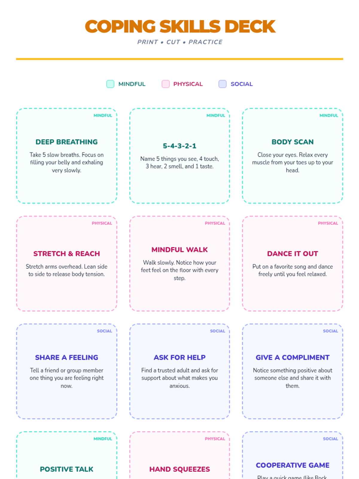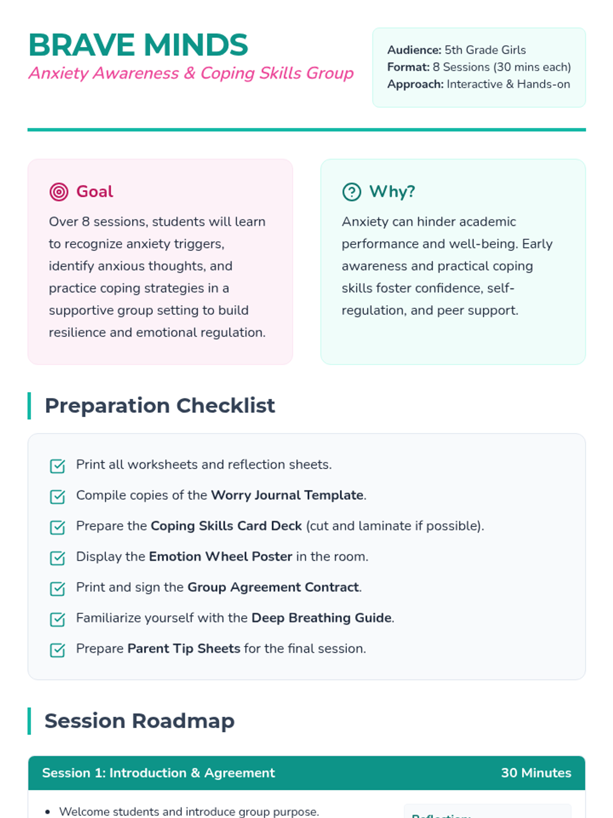 An 8-week empowerment group for 5th grade girls focused on identifying anxiety triggers, understanding physical responses, and building a toolkit of practical coping strategies.