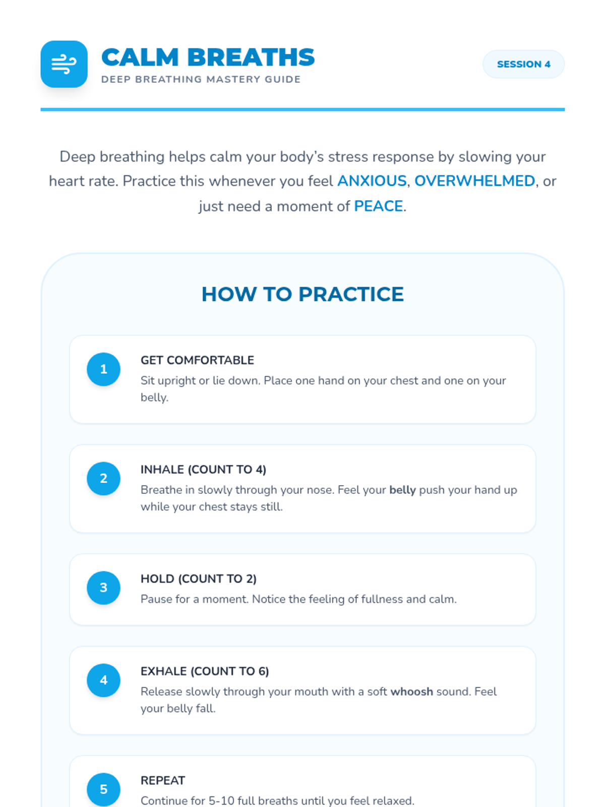 A 6-session counseling group designed to help students identify triggers, understand physical symptoms of anxiety, and build a personalized toolkit of coping strategies through a 'Calm Explorer' theme.