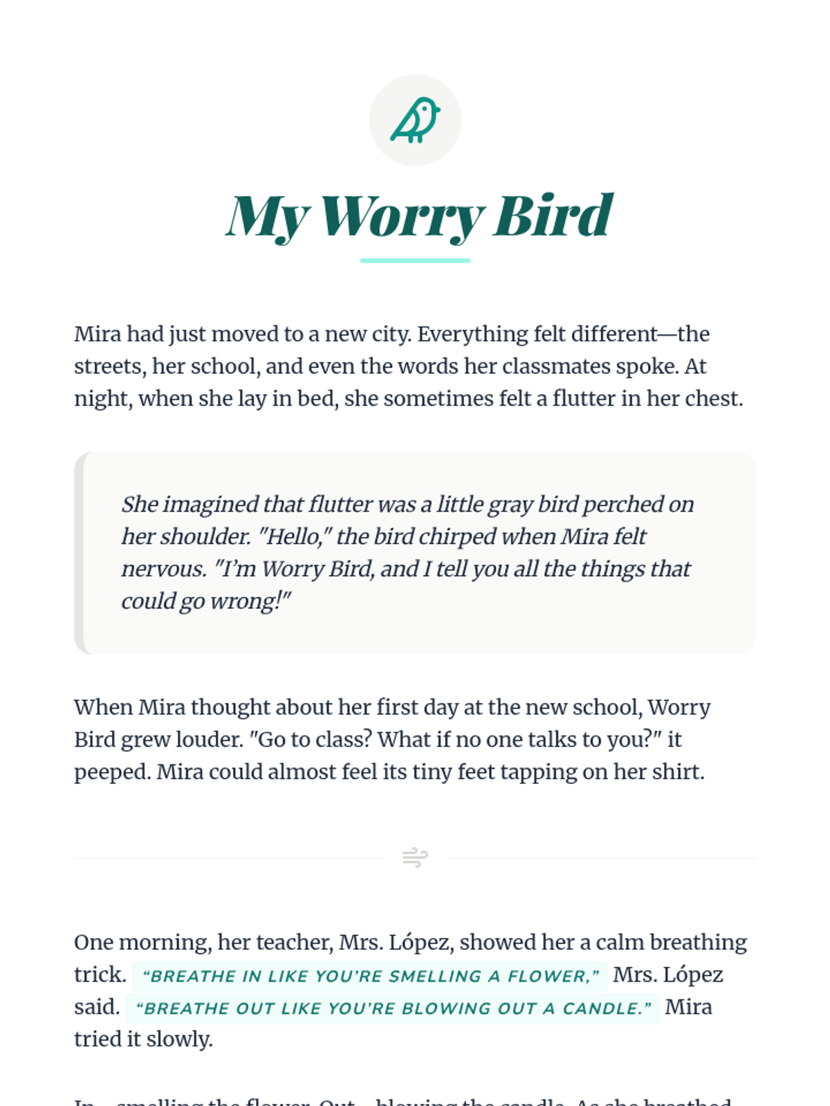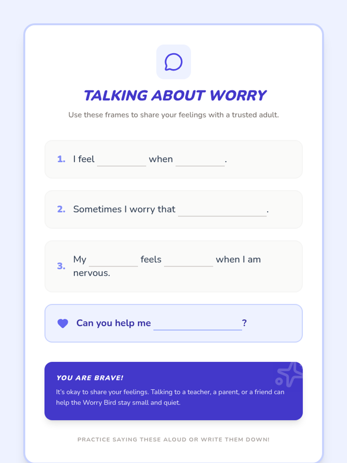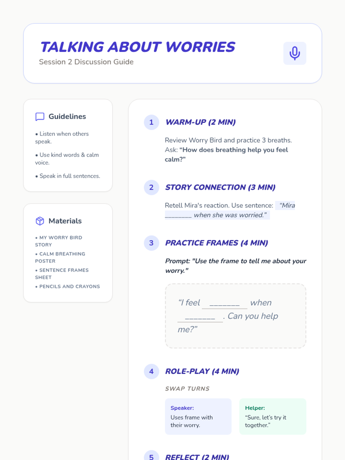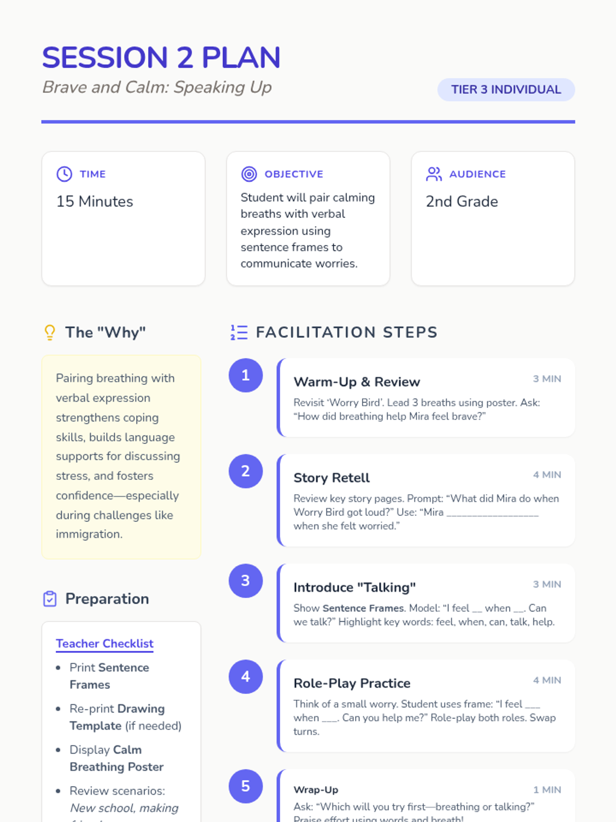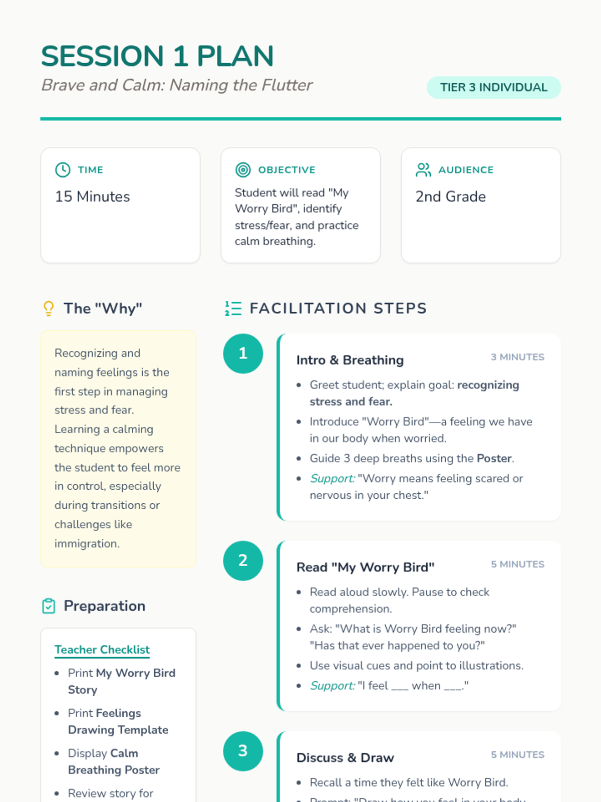 A 2-session individual Tier 3 lesson sequence for second graders to identify and manage stress and fear through the 'Worry Bird' metaphor and coping strategies like deep breathing and verbal expression.