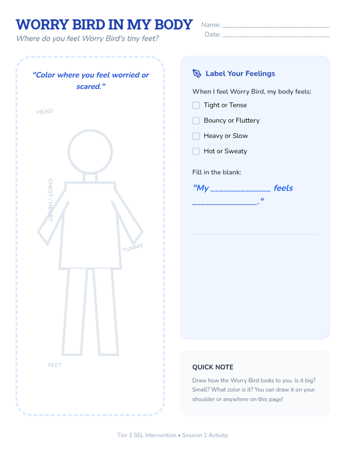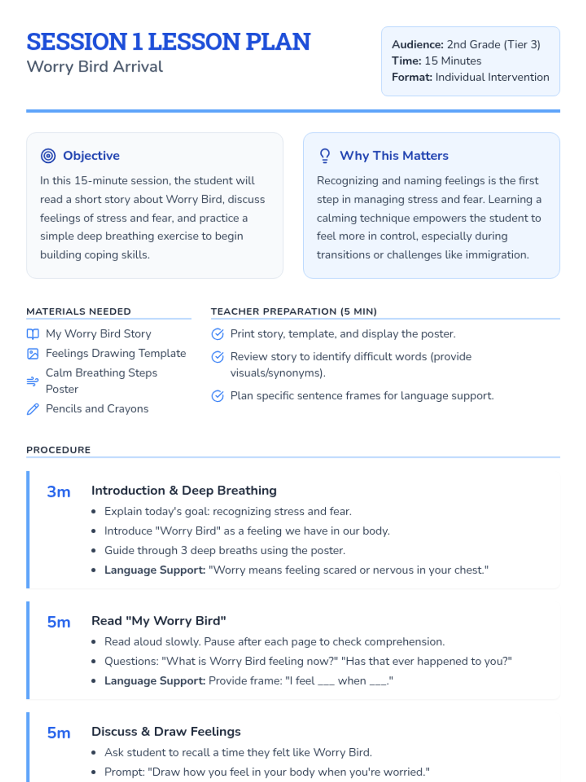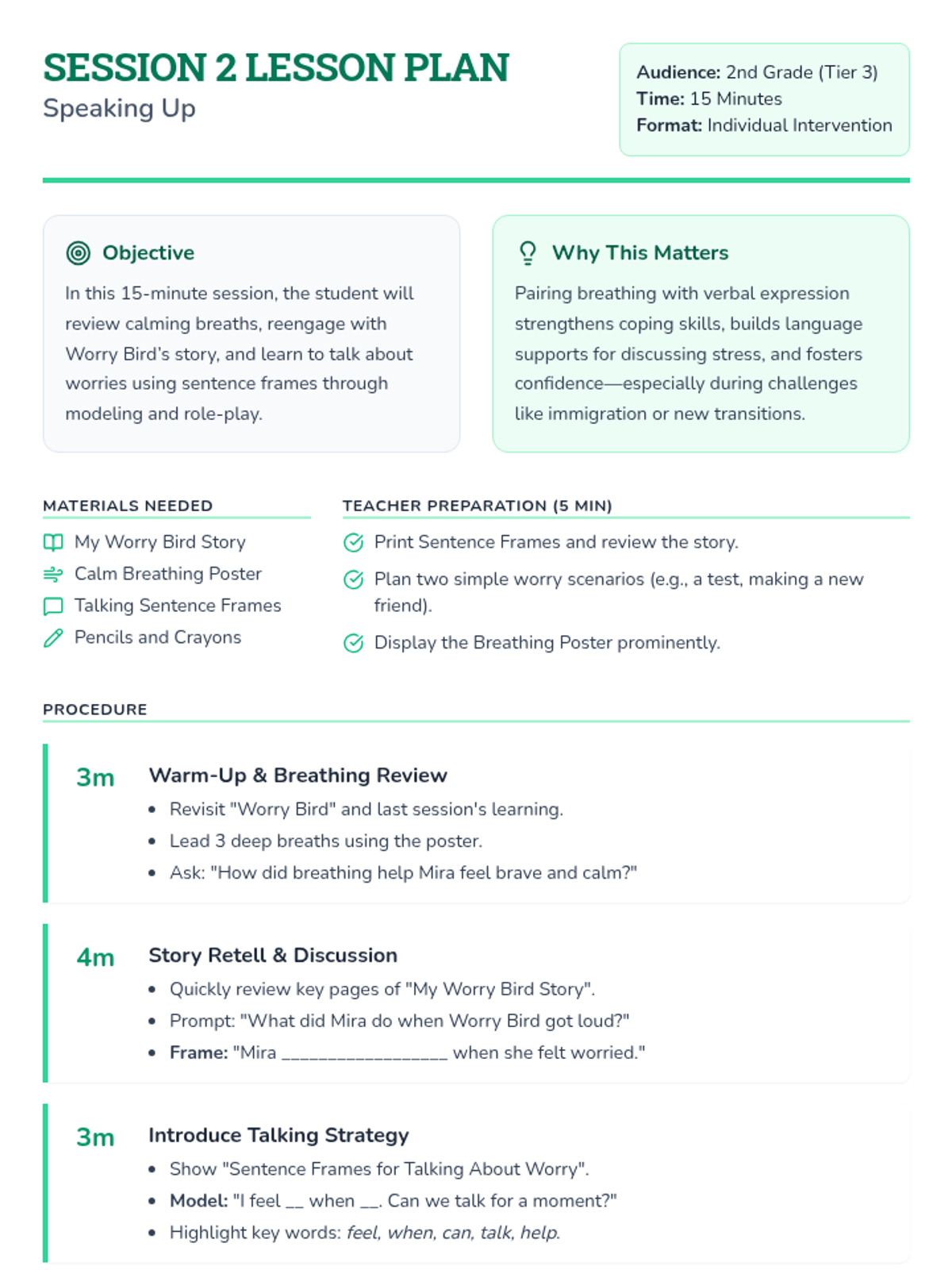 A 2-session Tier 3 intervention for 2nd graders to help them recognize stress and fear through the metaphor of a 'Worry Bird' and practice coping strategies like deep breathing and verbal expression.