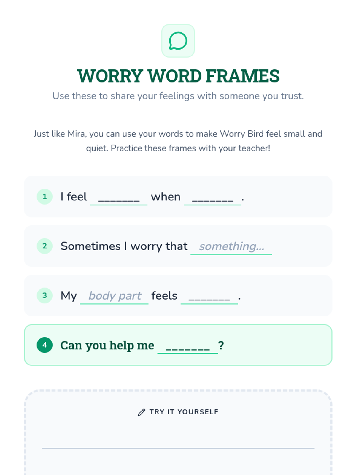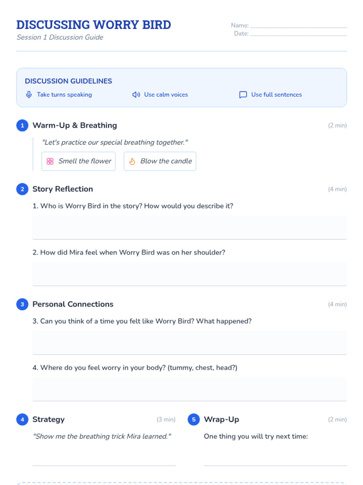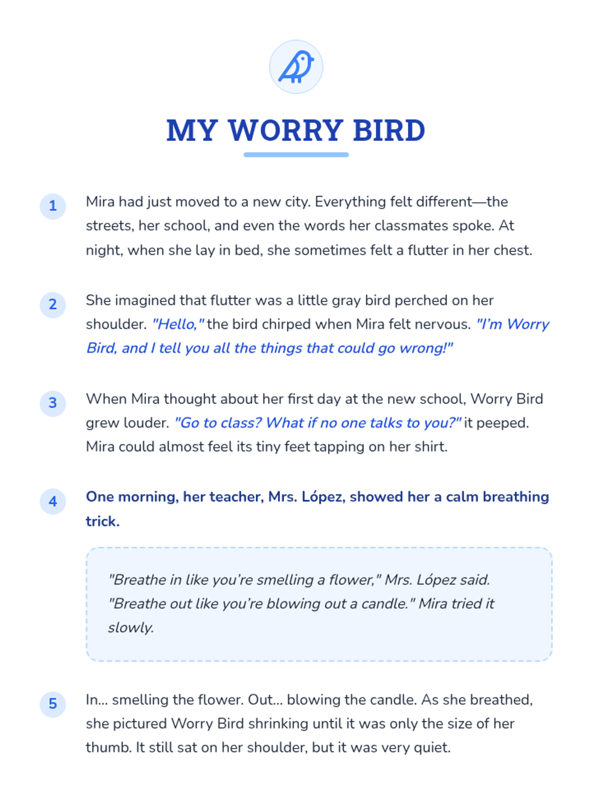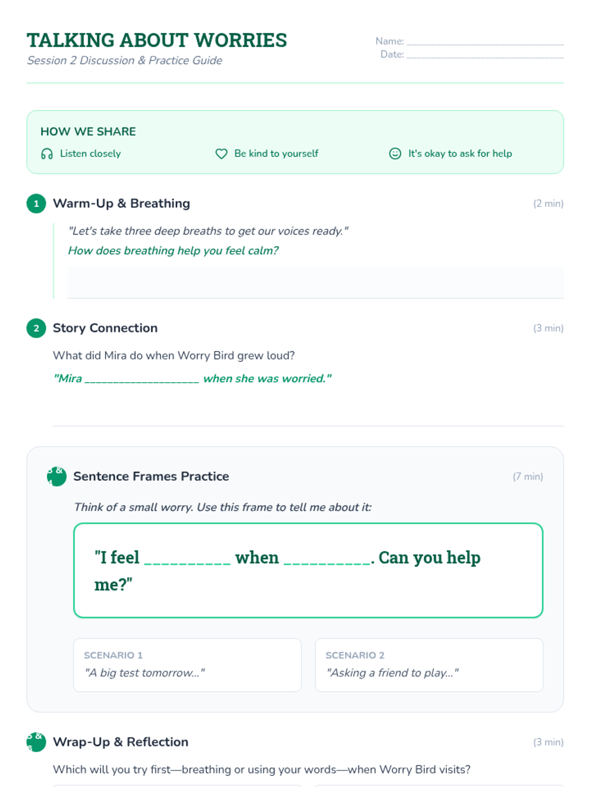 A 2-session Tier 3 intervention for 2nd graders to help them recognize stress and fear through the metaphor of a 'Worry Bird' and practice coping strategies like deep breathing and verbal expression.