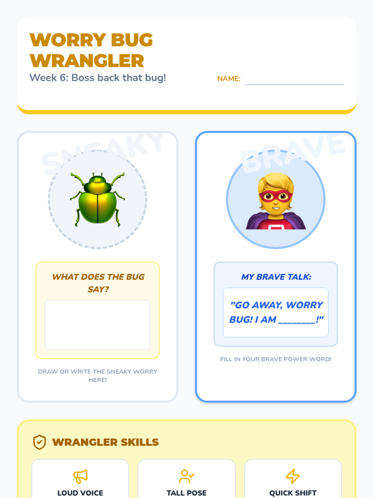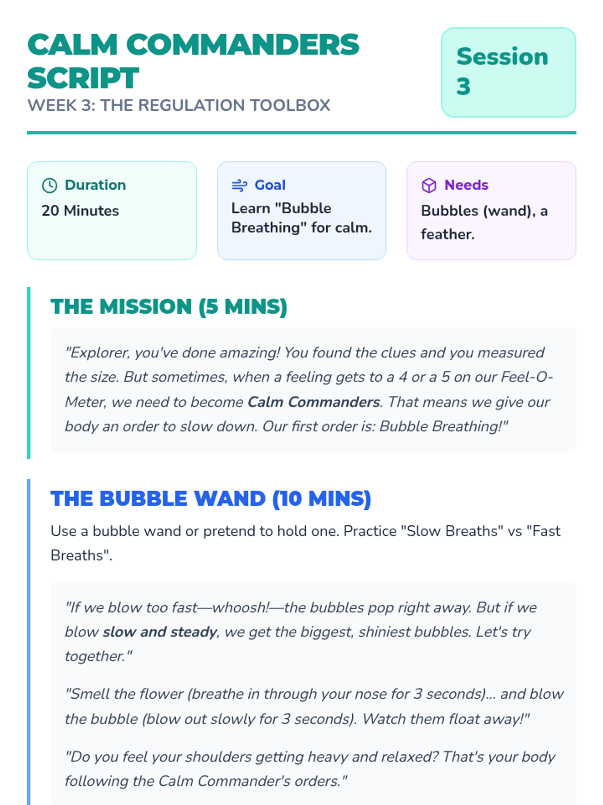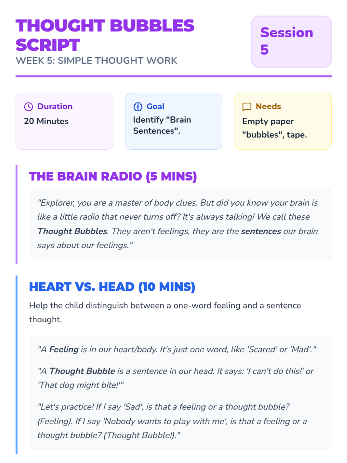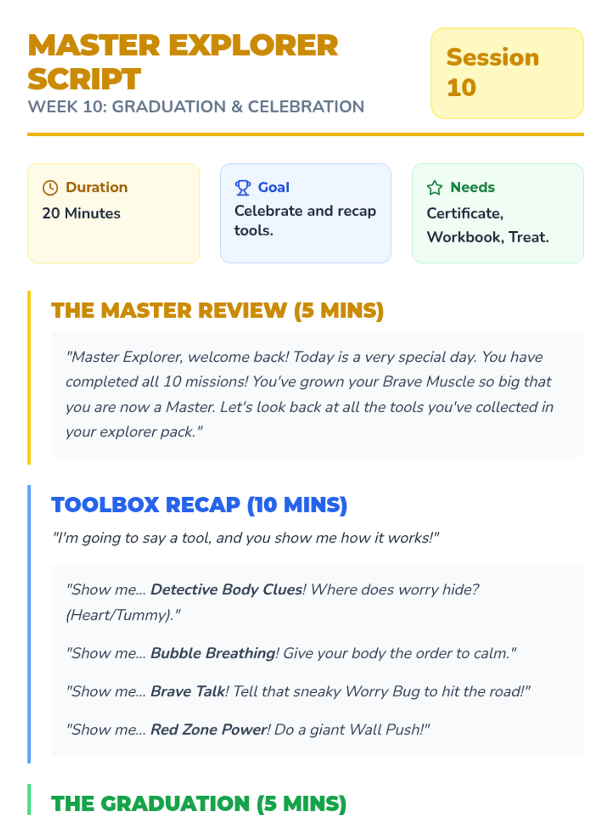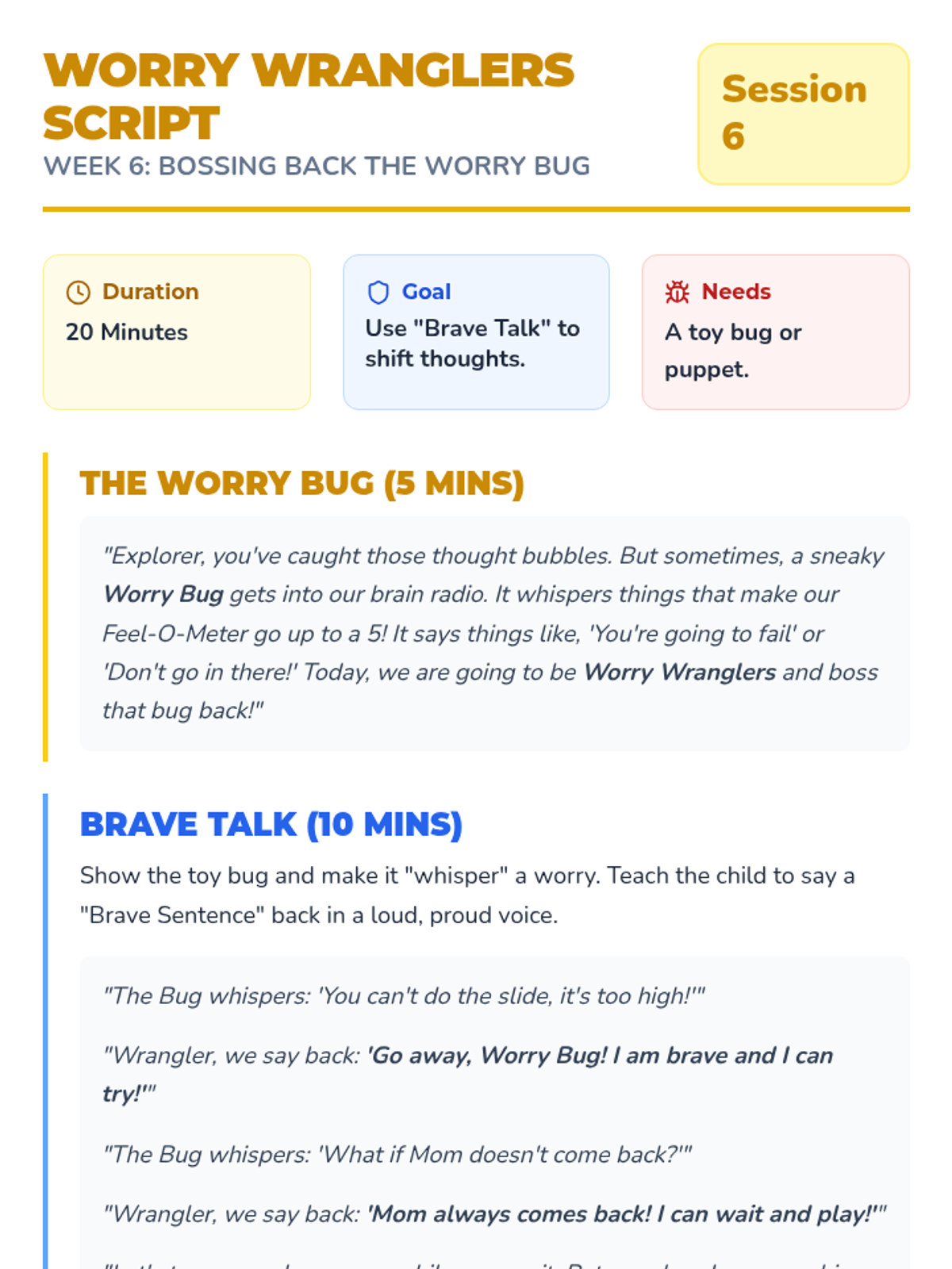 A 10-week CBT program for 6-year-olds combining play therapy, emotional awareness, body regulation, and exposure-lite skills. This sequence includes scripted sessions, parent coaching guides, and a visual student workbook designed for concrete learners.
