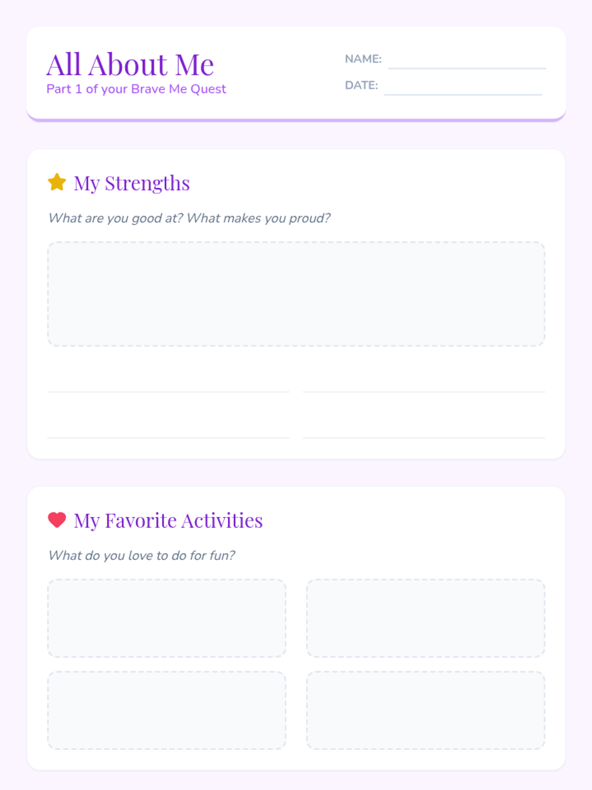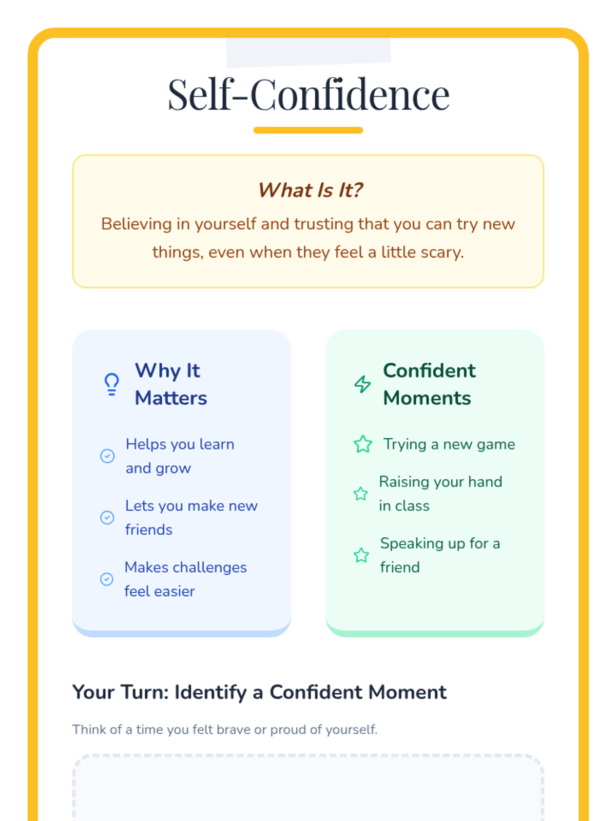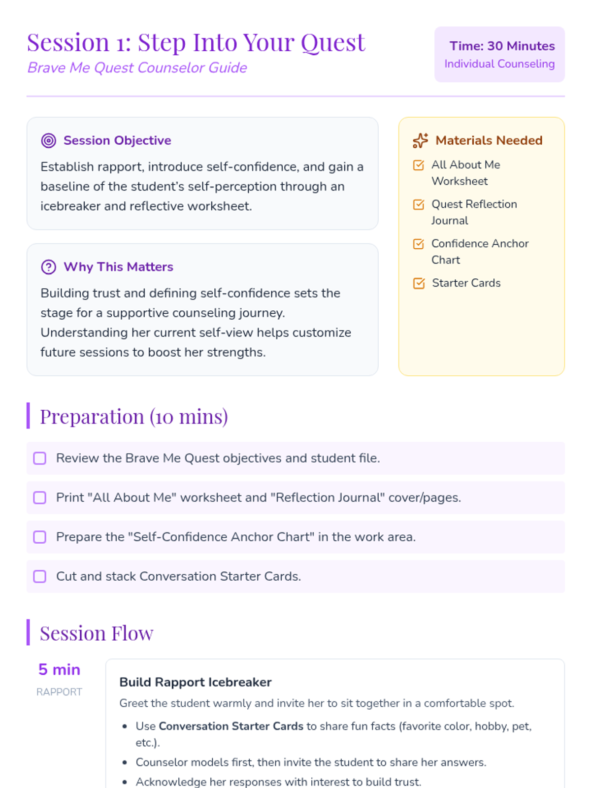 An 8-session individual counseling journey designed to help a 3rd grade girl build self-confidence and a positive self-perception. Through interactive activities, reflection, and supportive dialogue, each 30-minute session empowers her to recognize strengths, face challenges, and celebrate progress.
