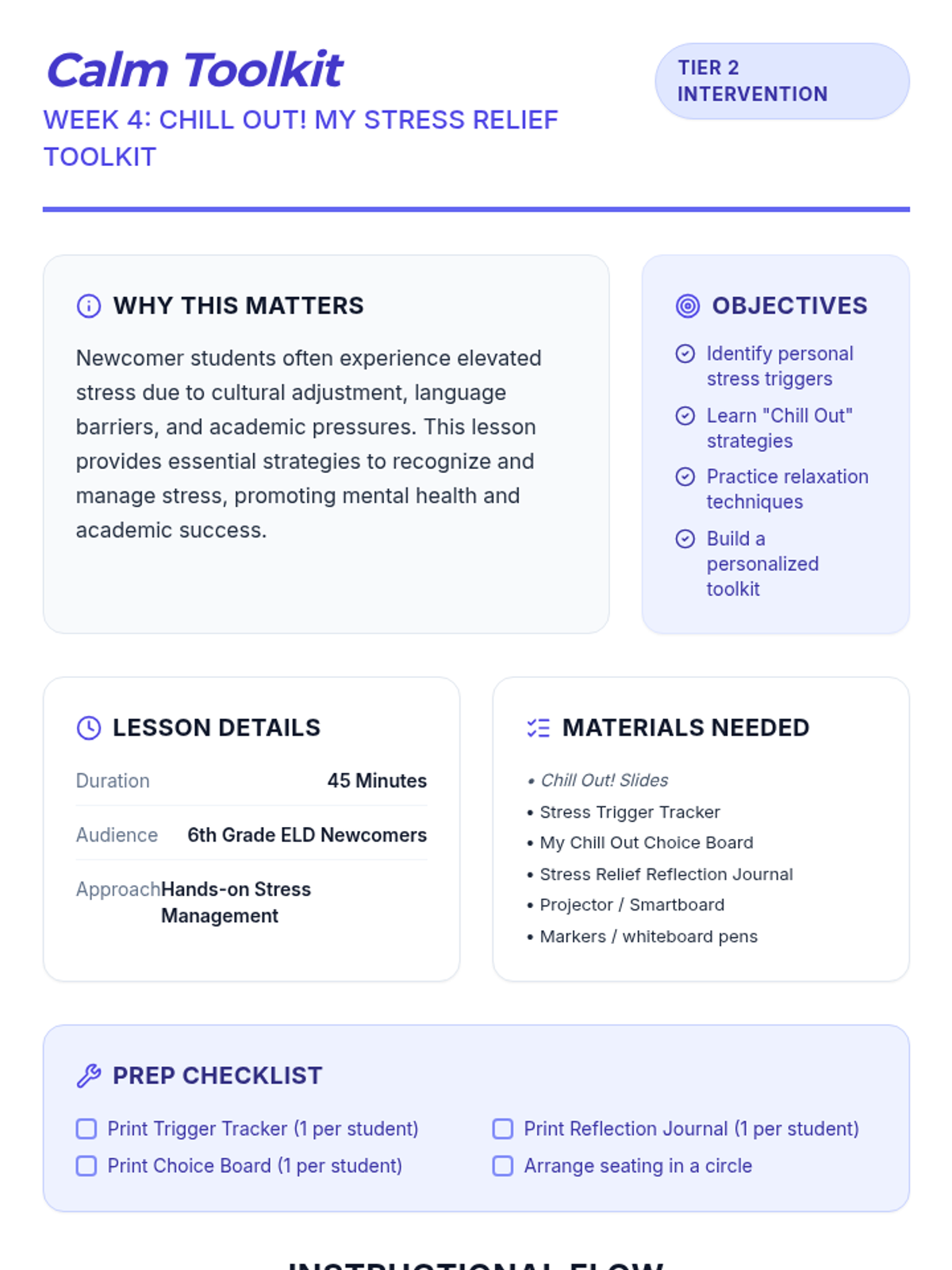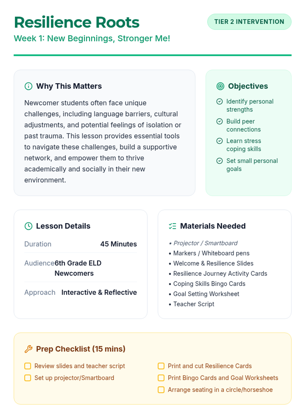 A four-week Tier 2 intervention designed for 6th-grade ELD newcomer students to build resilience, foster belonging, and develop essential coping and problem-solving skills for their new school environment.