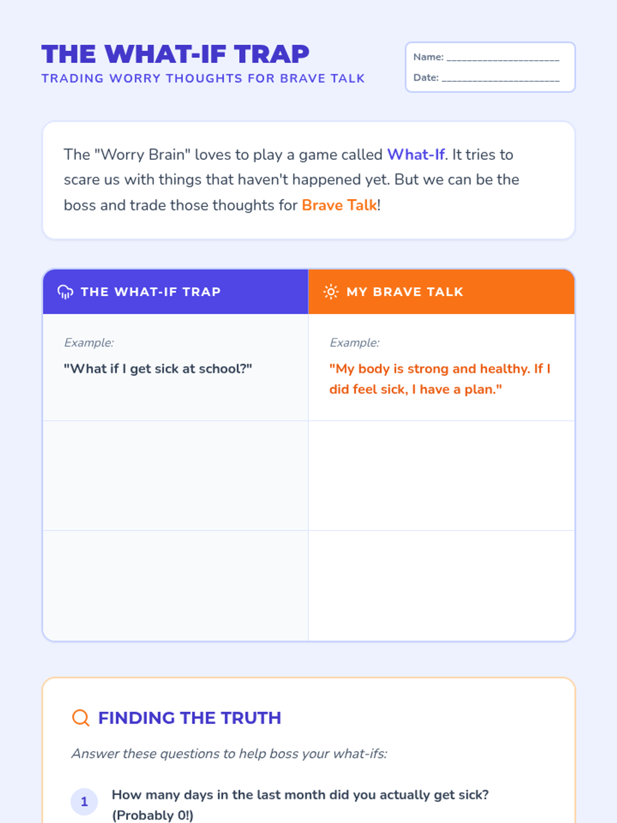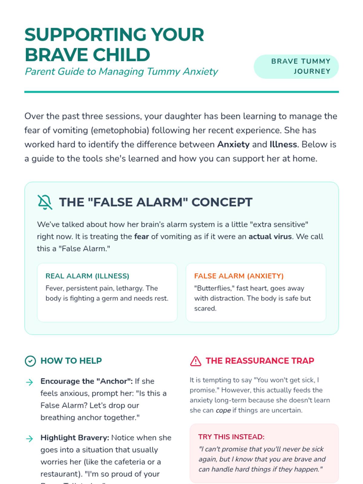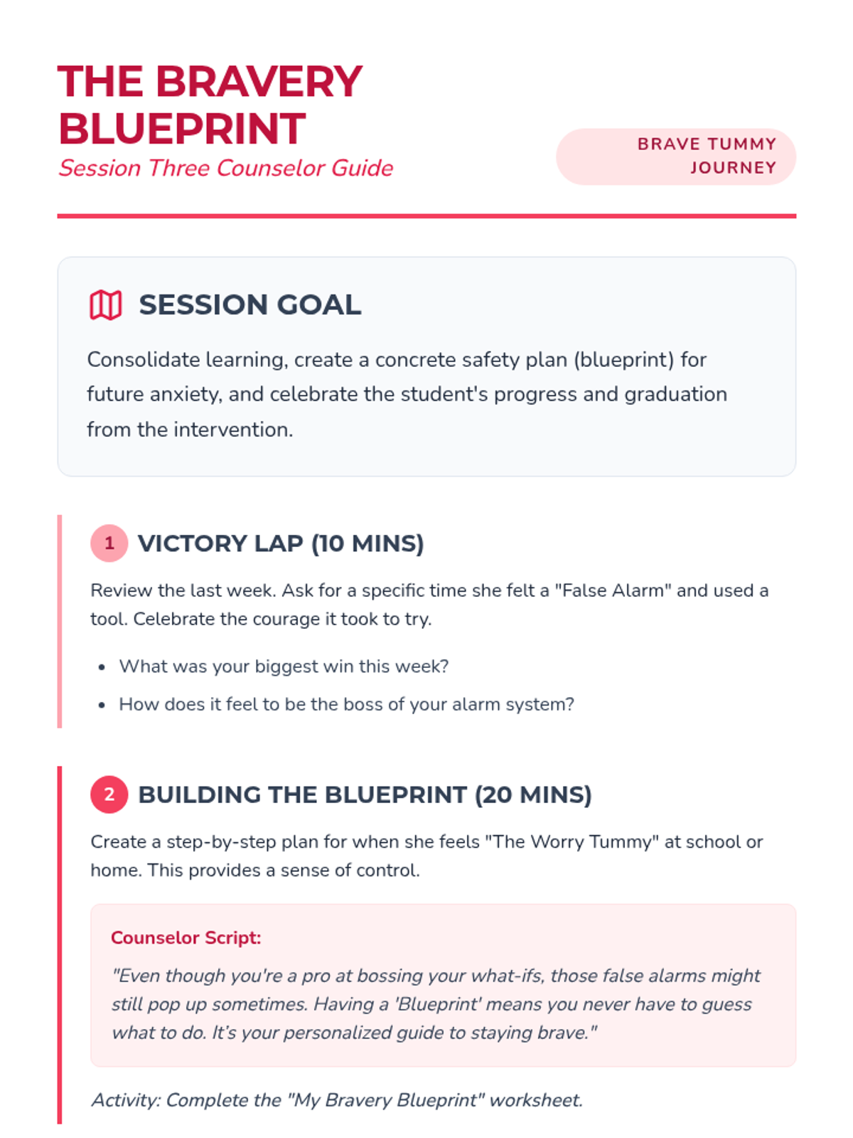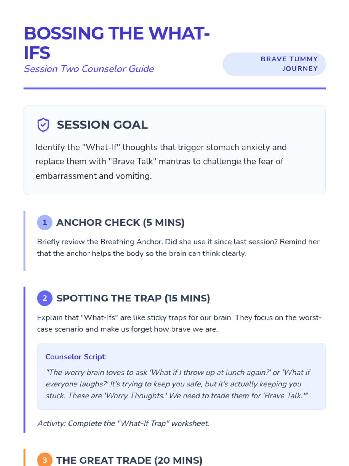 A 3-session individual counseling intervention designed for a 5th-grade girl struggling with emetophobia (fear of vomiting) following an embarrassing incident. The sequence uses cognitive-behavioral strategies, somatic grounding, and cognitive reframing to build resilience and reduce avoidance.