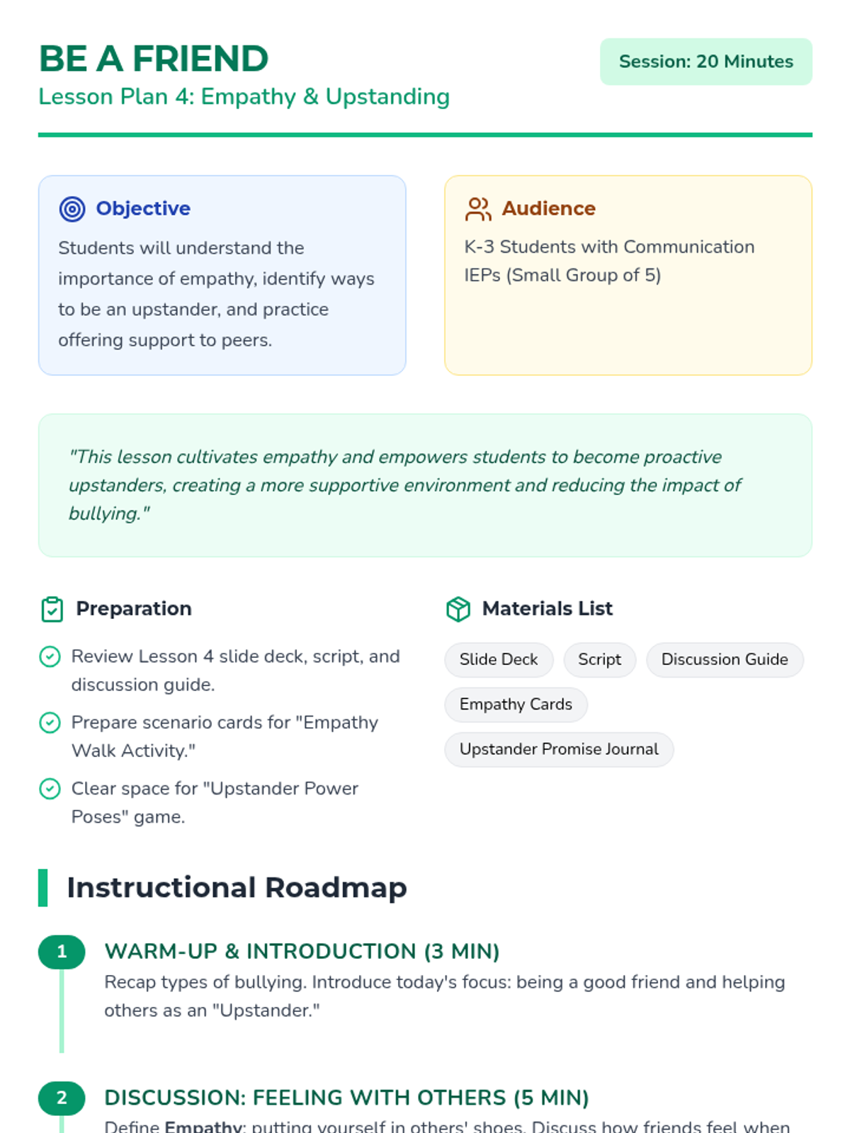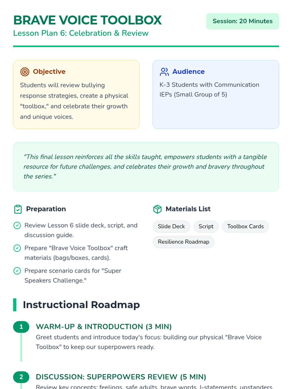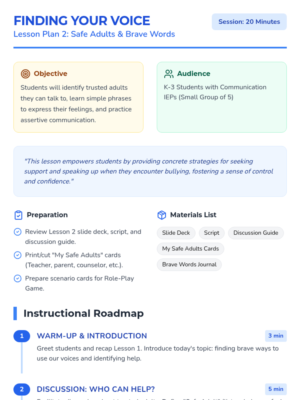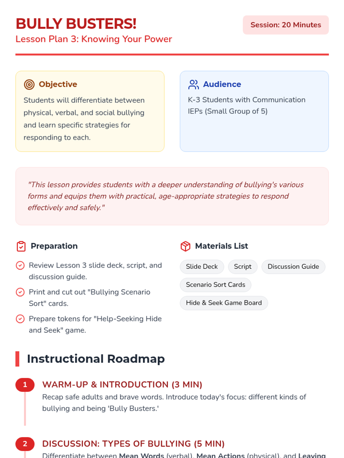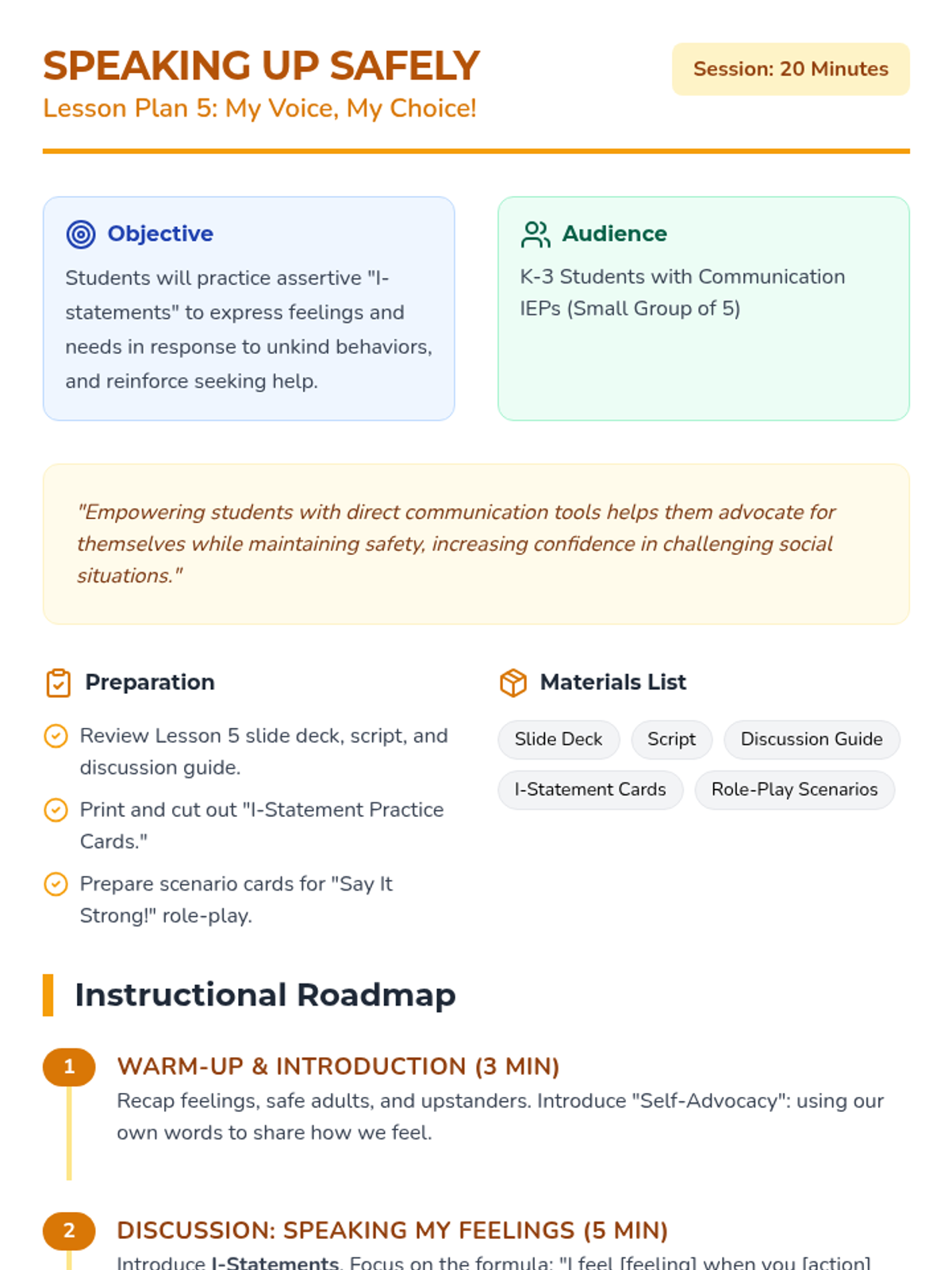 A six-lesson series for K-3 students with communication IEPs, specifically those who stutter. The sequence focuses on defining bullying, identifying feelings, building self-advocacy through brave words and I-statements, and fostering empathy to become upstanders.