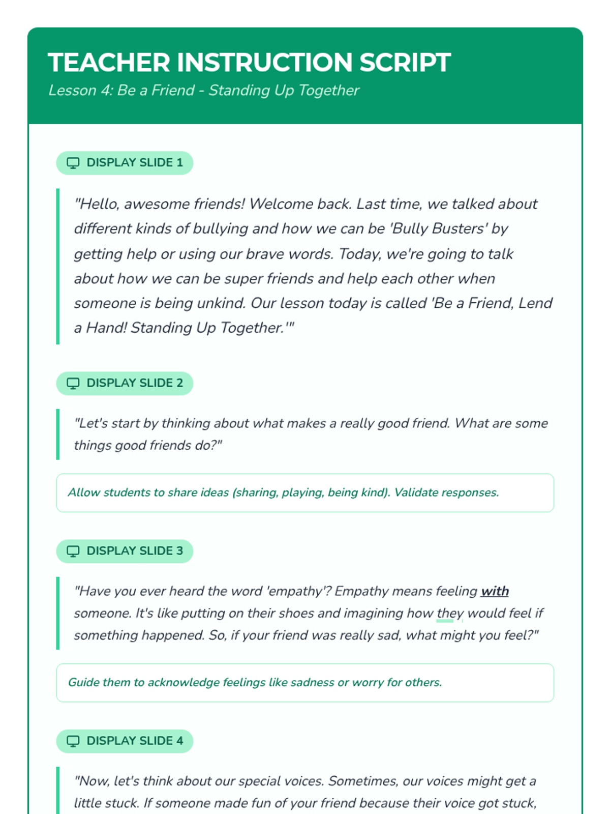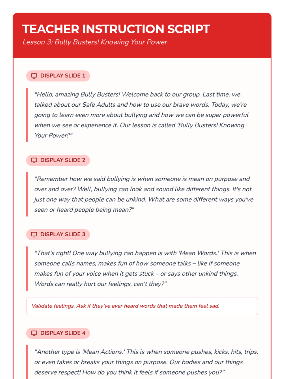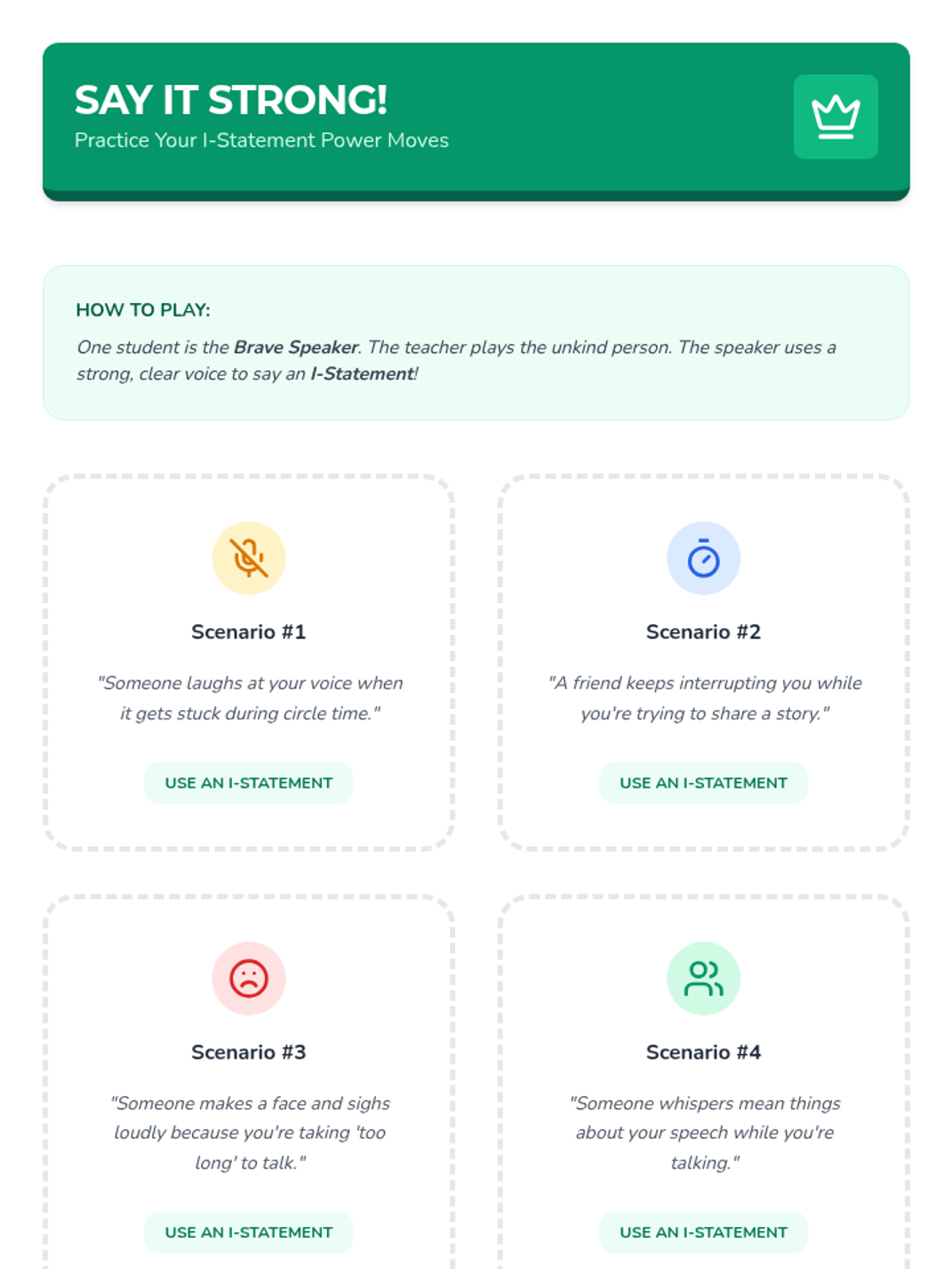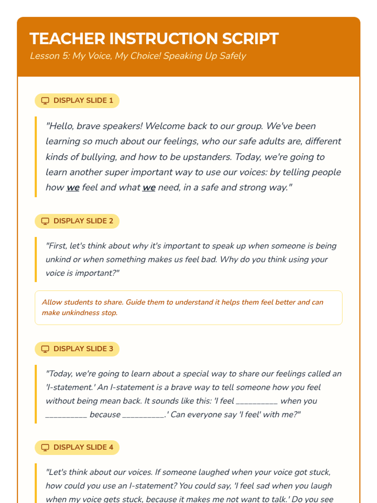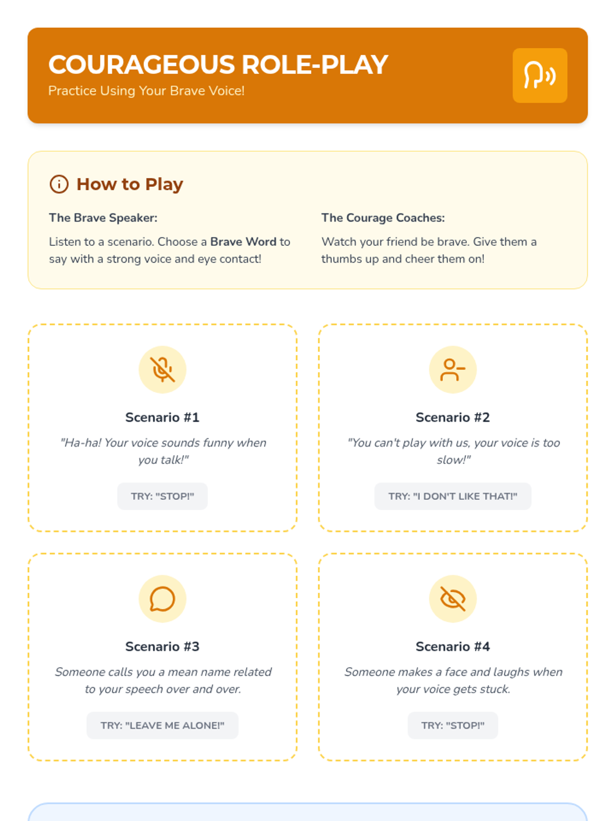 A six-lesson series for K-3 students with communication IEPs, specifically those who stutter. The sequence focuses on defining bullying, identifying feelings, building self-advocacy through brave words and I-statements, and fostering empathy to become upstanders.