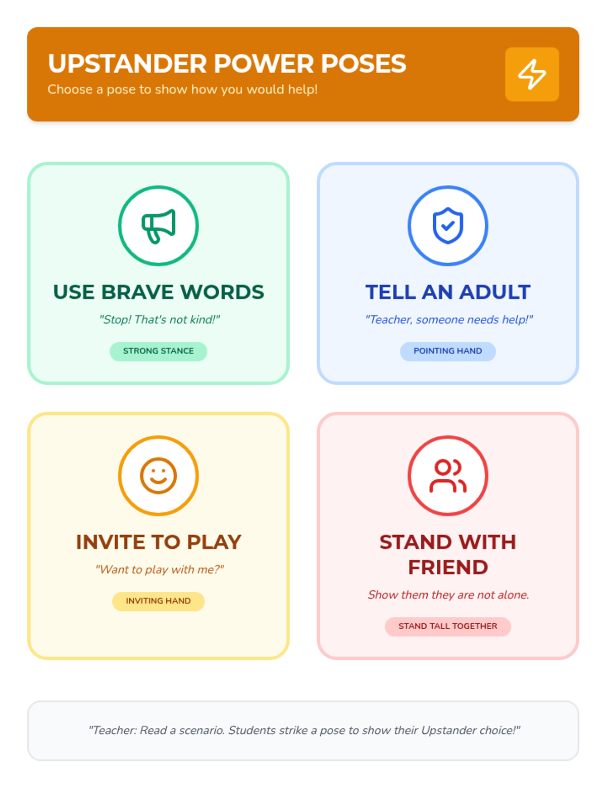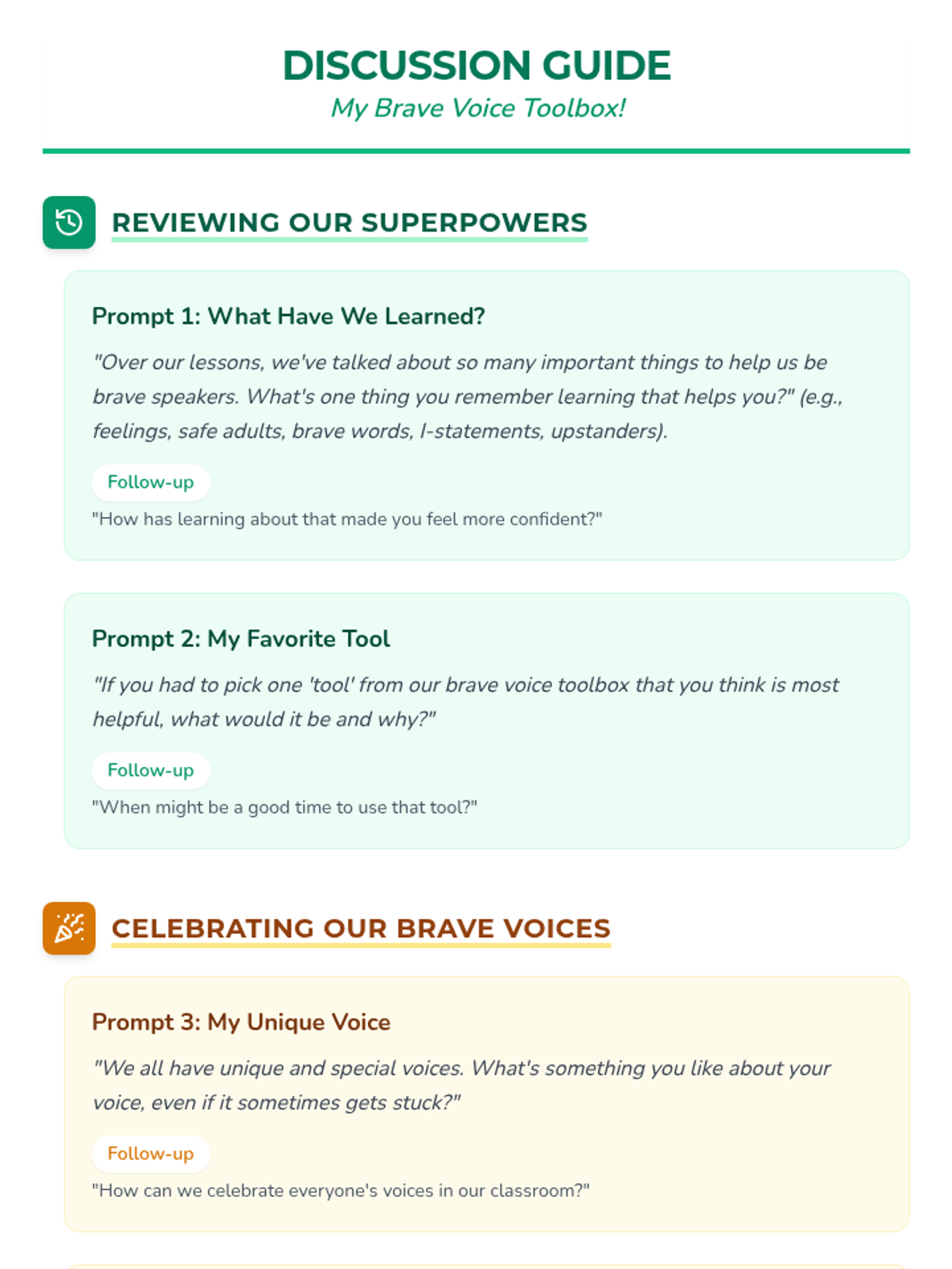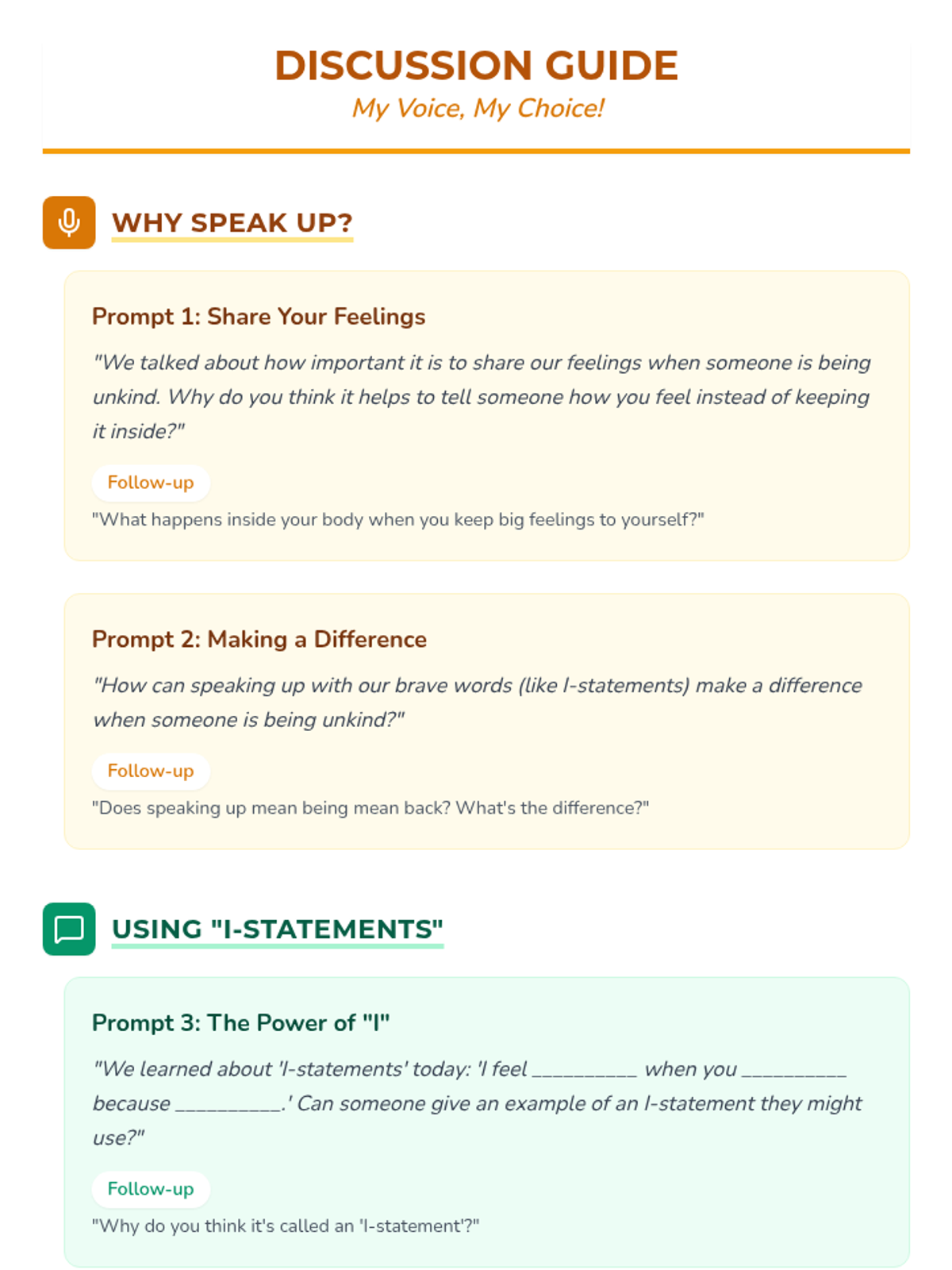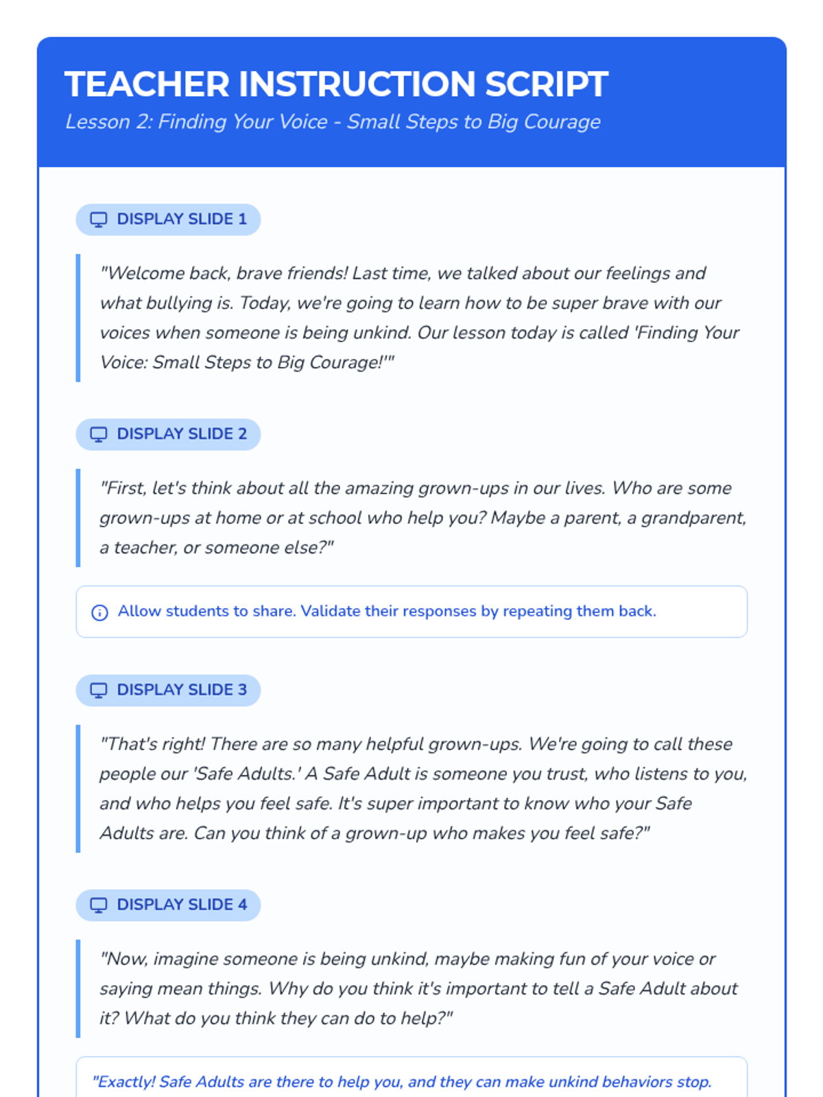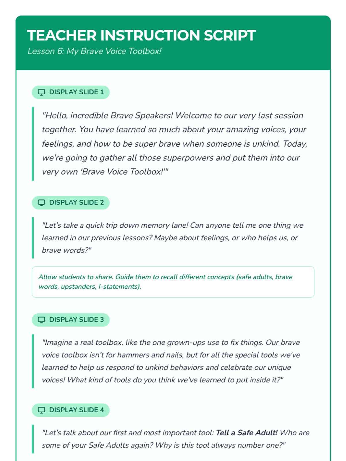 A six-lesson series for K-3 students with communication IEPs, specifically those who stutter. The sequence focuses on defining bullying, identifying feelings, building self-advocacy through brave words and I-statements, and fostering empathy to become upstanders.