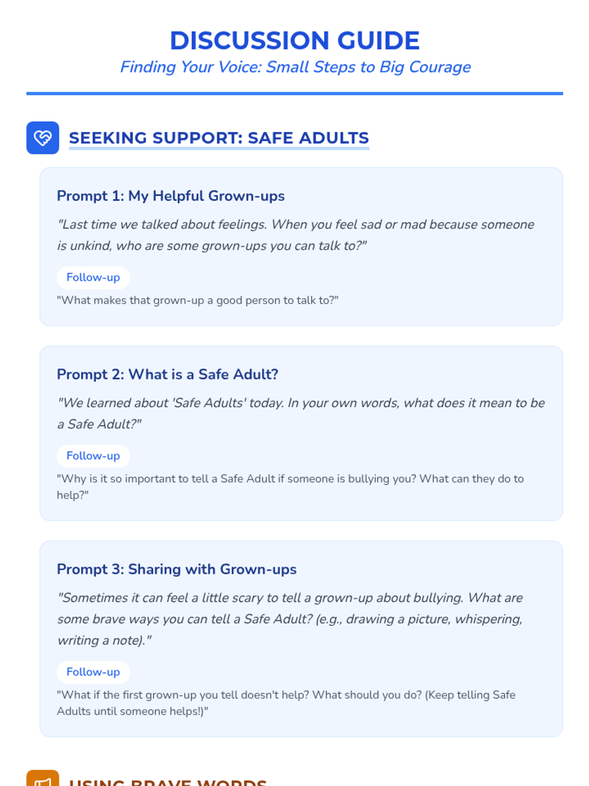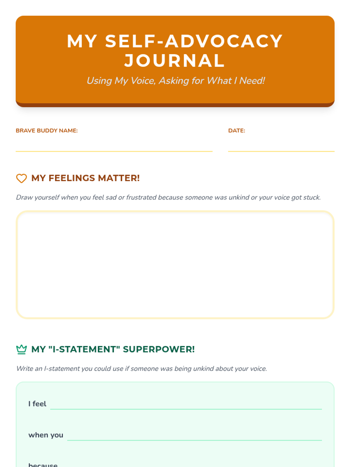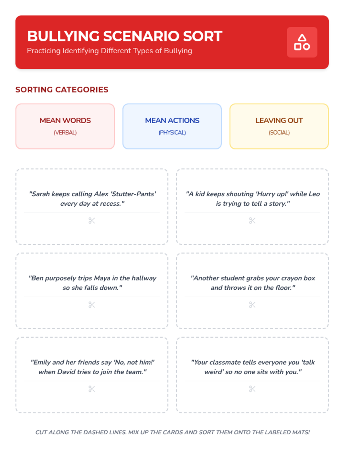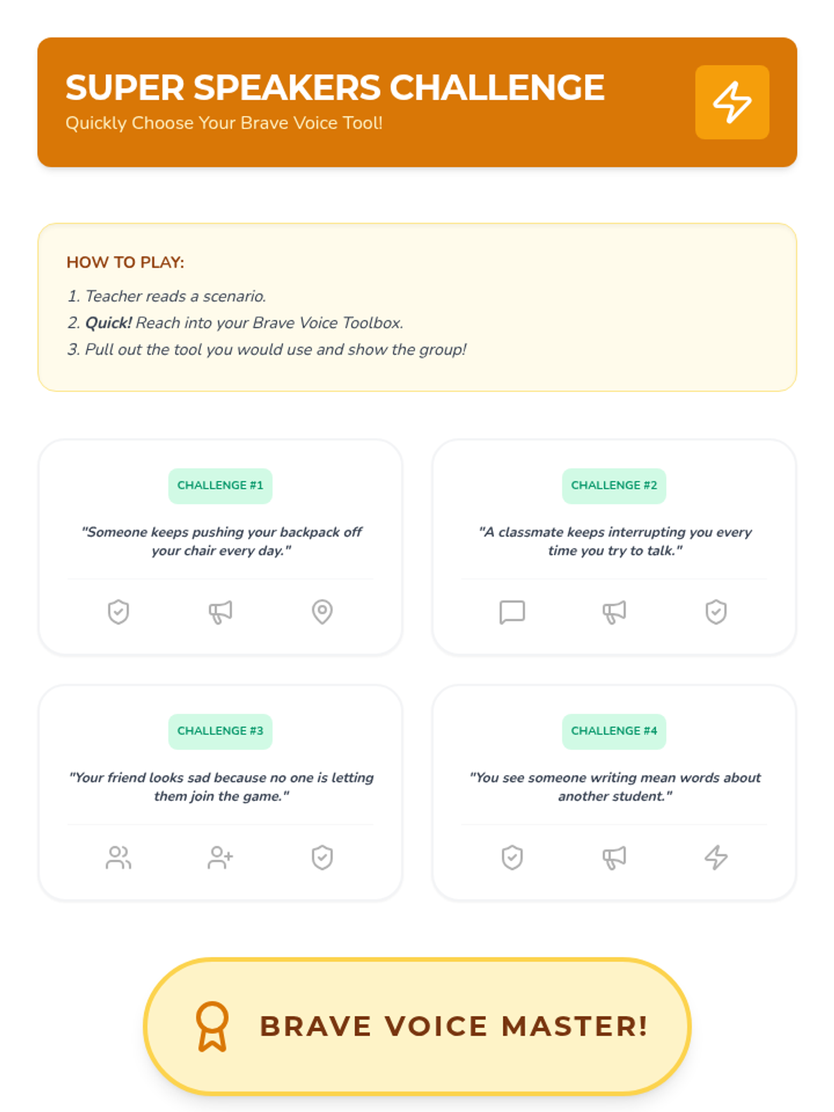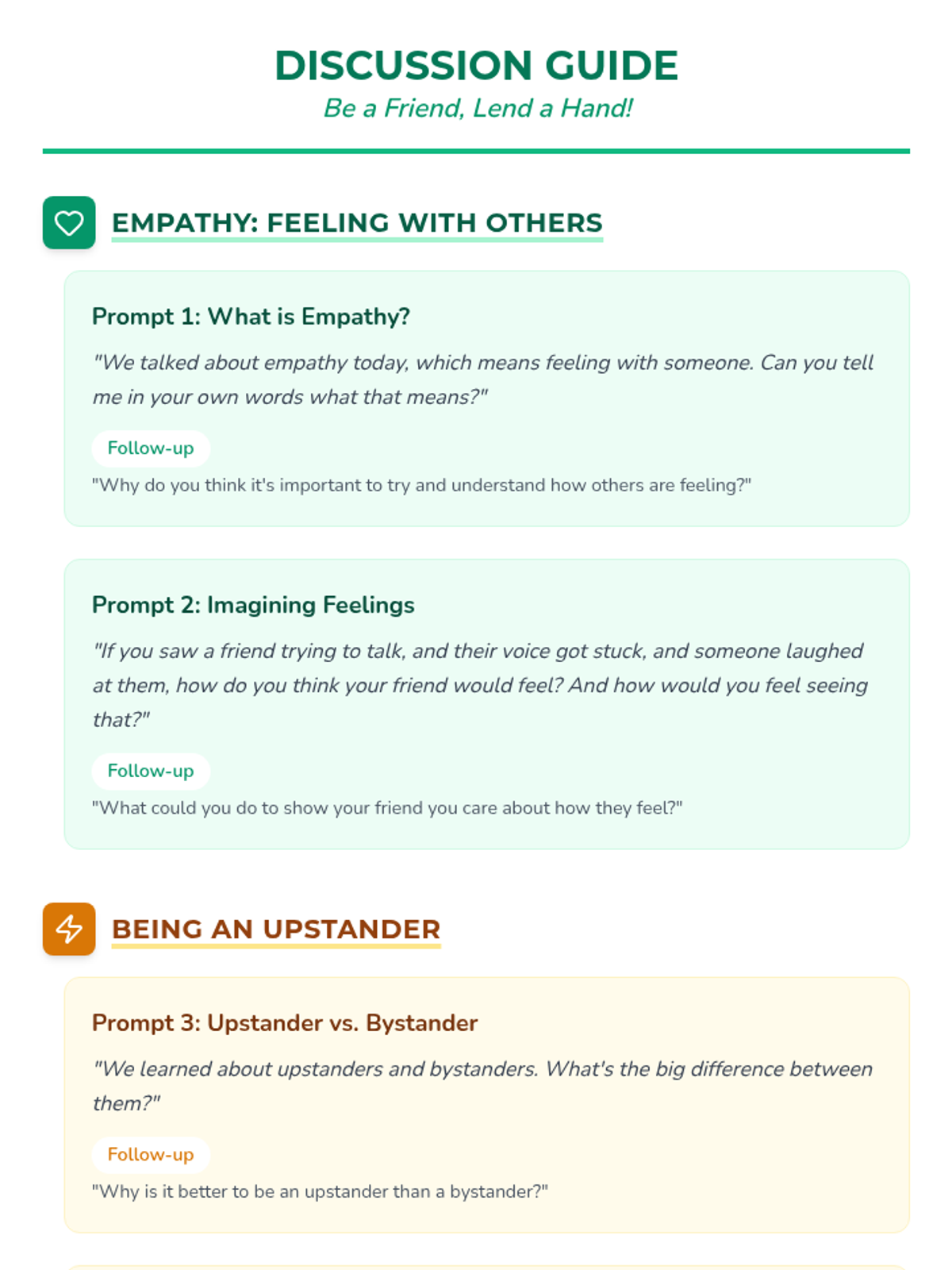 A six-lesson series for K-3 students with communication IEPs, specifically those who stutter. The sequence focuses on defining bullying, identifying feelings, building self-advocacy through brave words and I-statements, and fostering empathy to become upstanders.