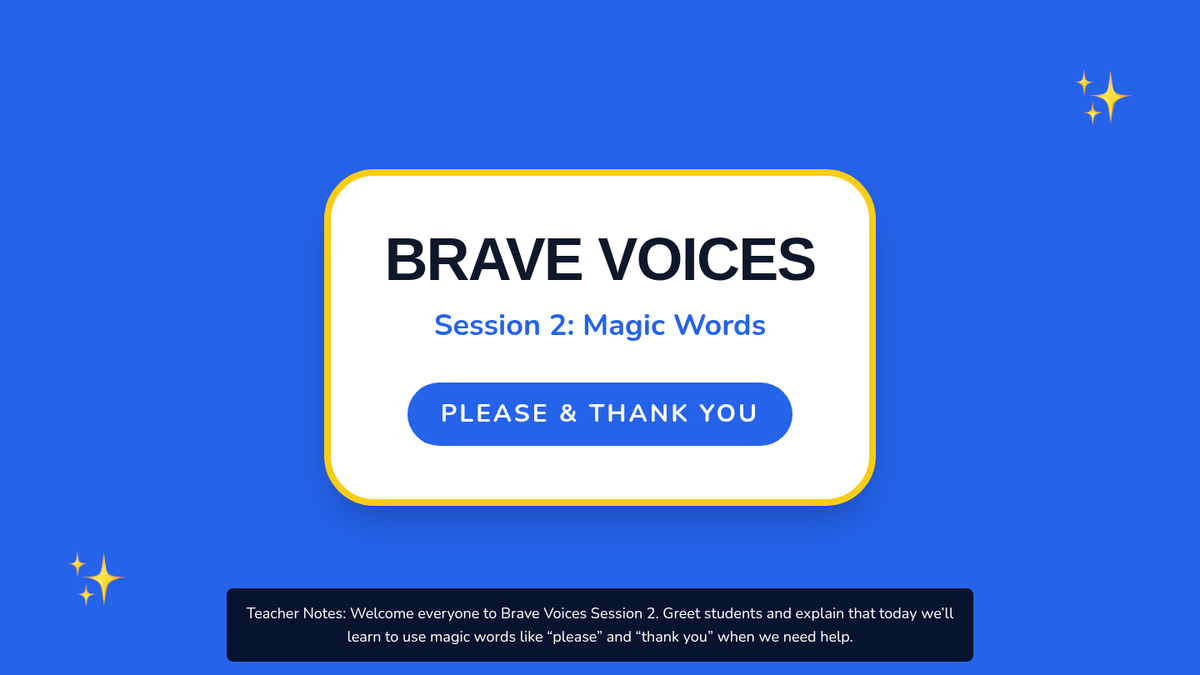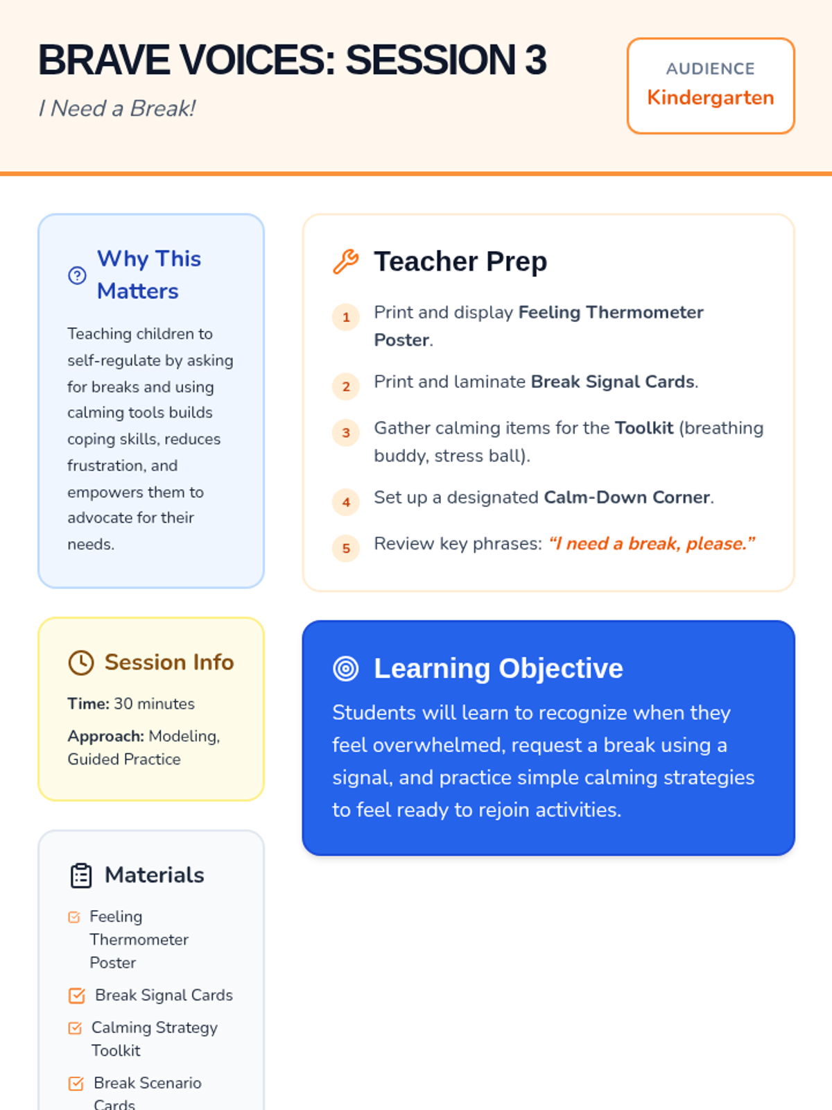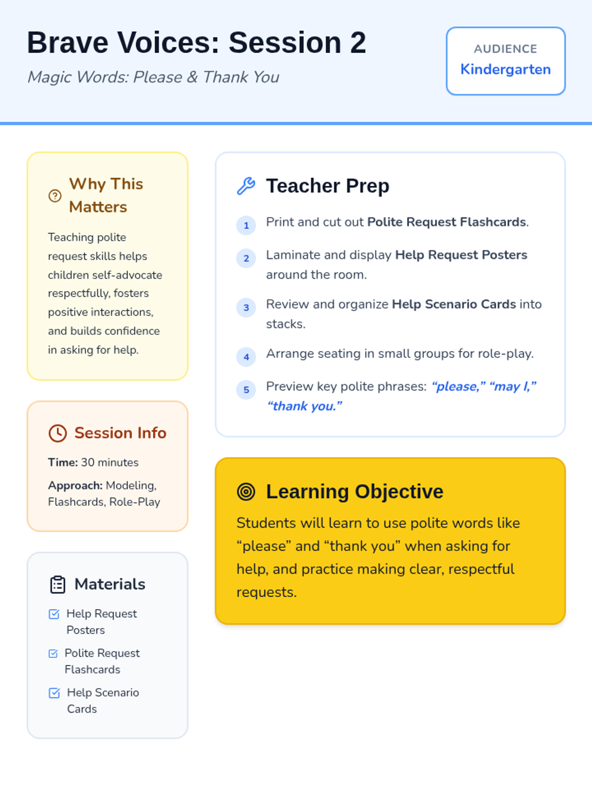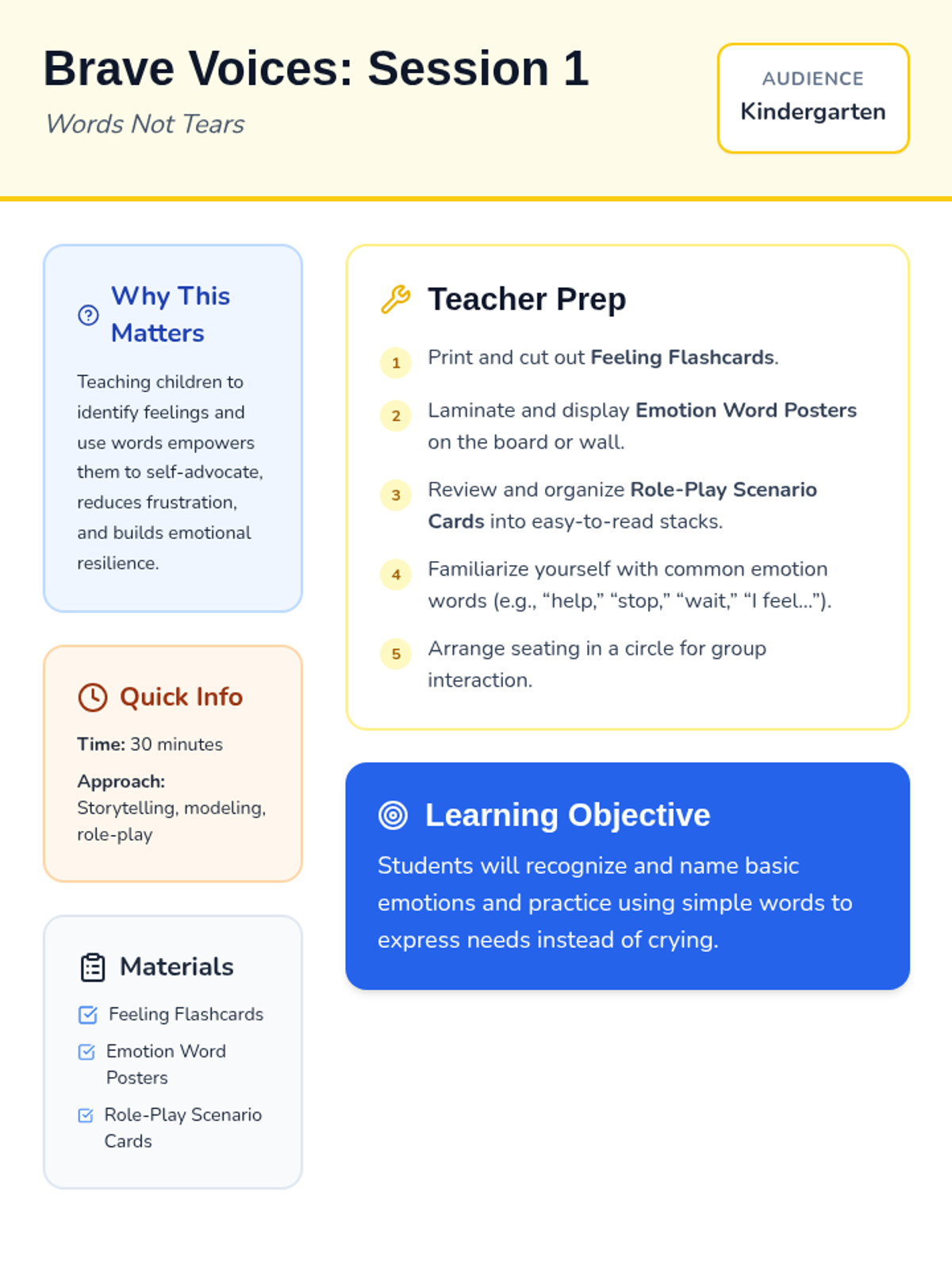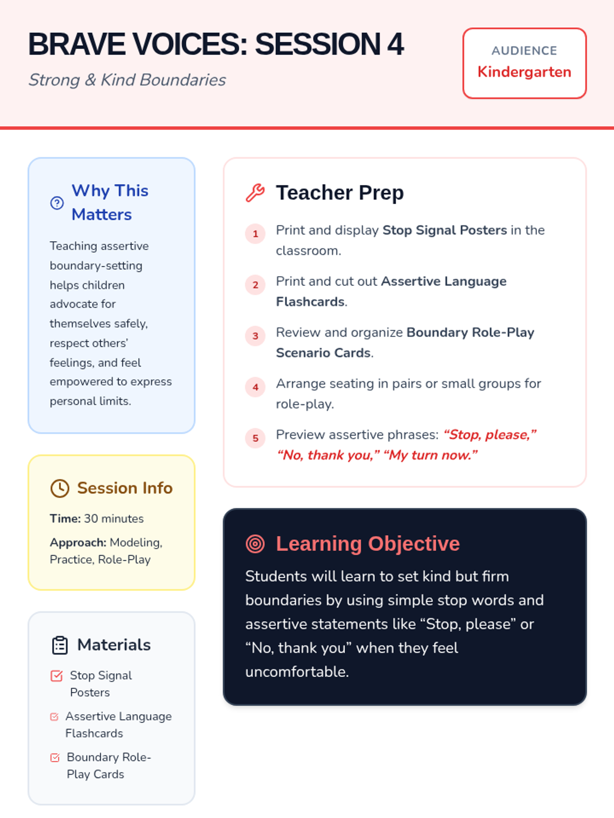 A 4-session kindergarten unit empowering students to advocate for themselves when challenges arise, teaching them to use words instead of tears. Students build self-advocacy skills and emotional resilience through play and role-play.