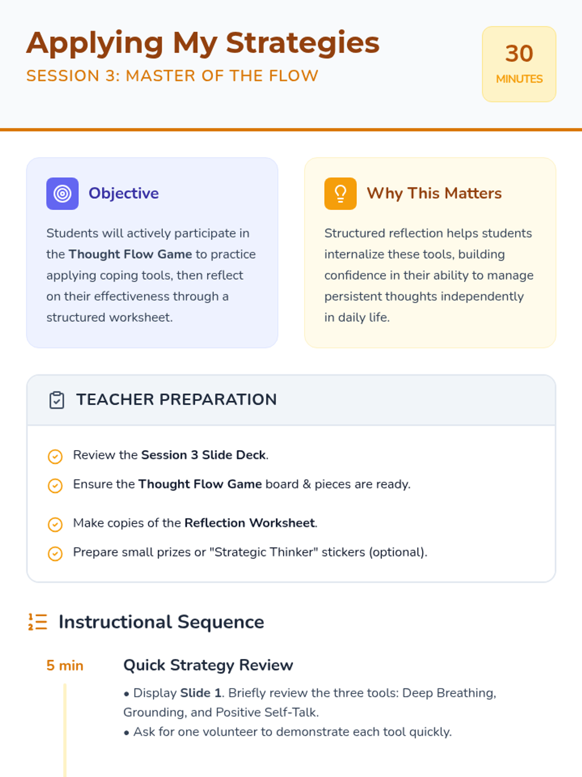 A 3-session series for middle school students with autism to identify perseverative thoughts and apply practical coping strategies to build cognitive flexibility.