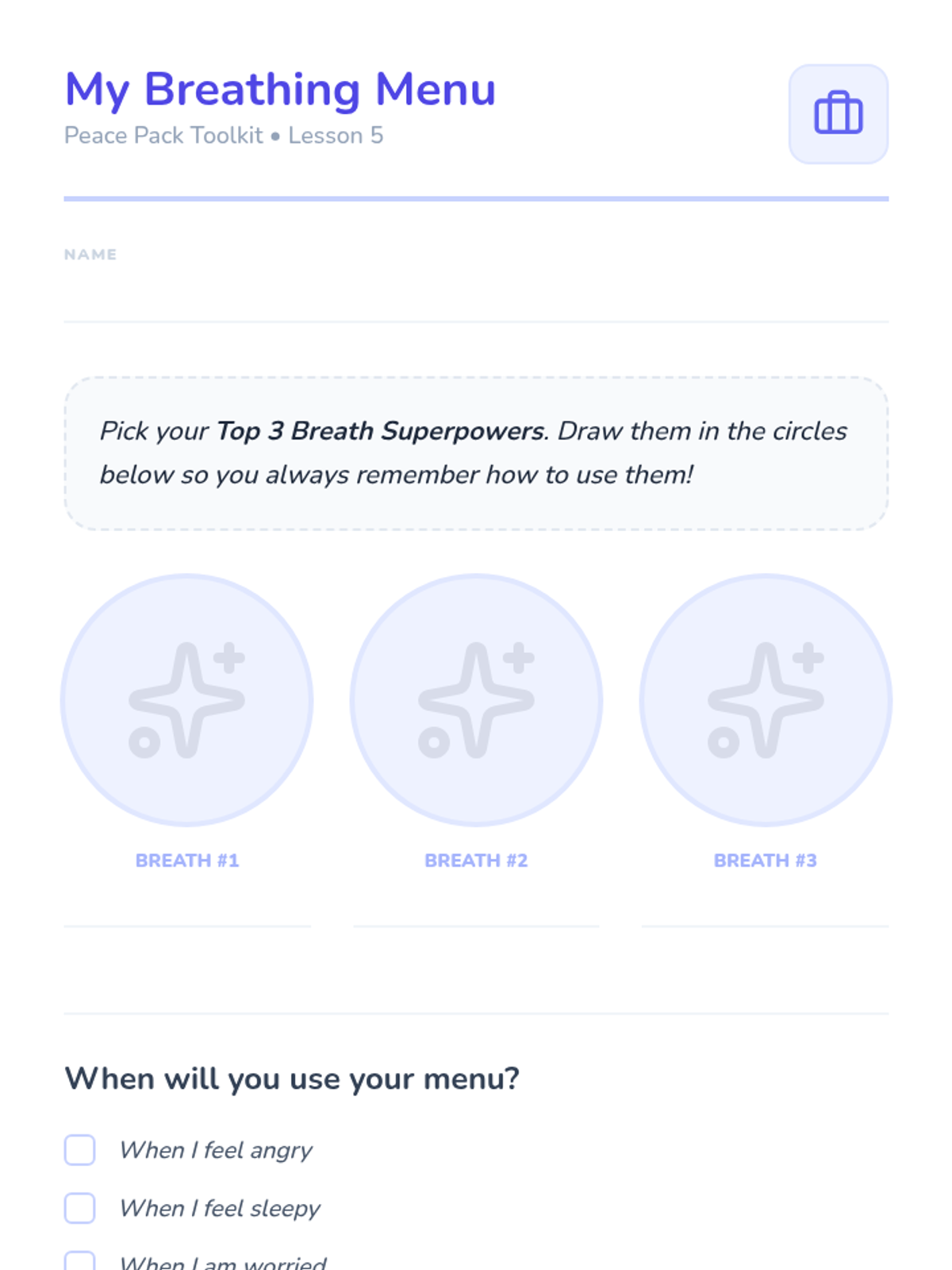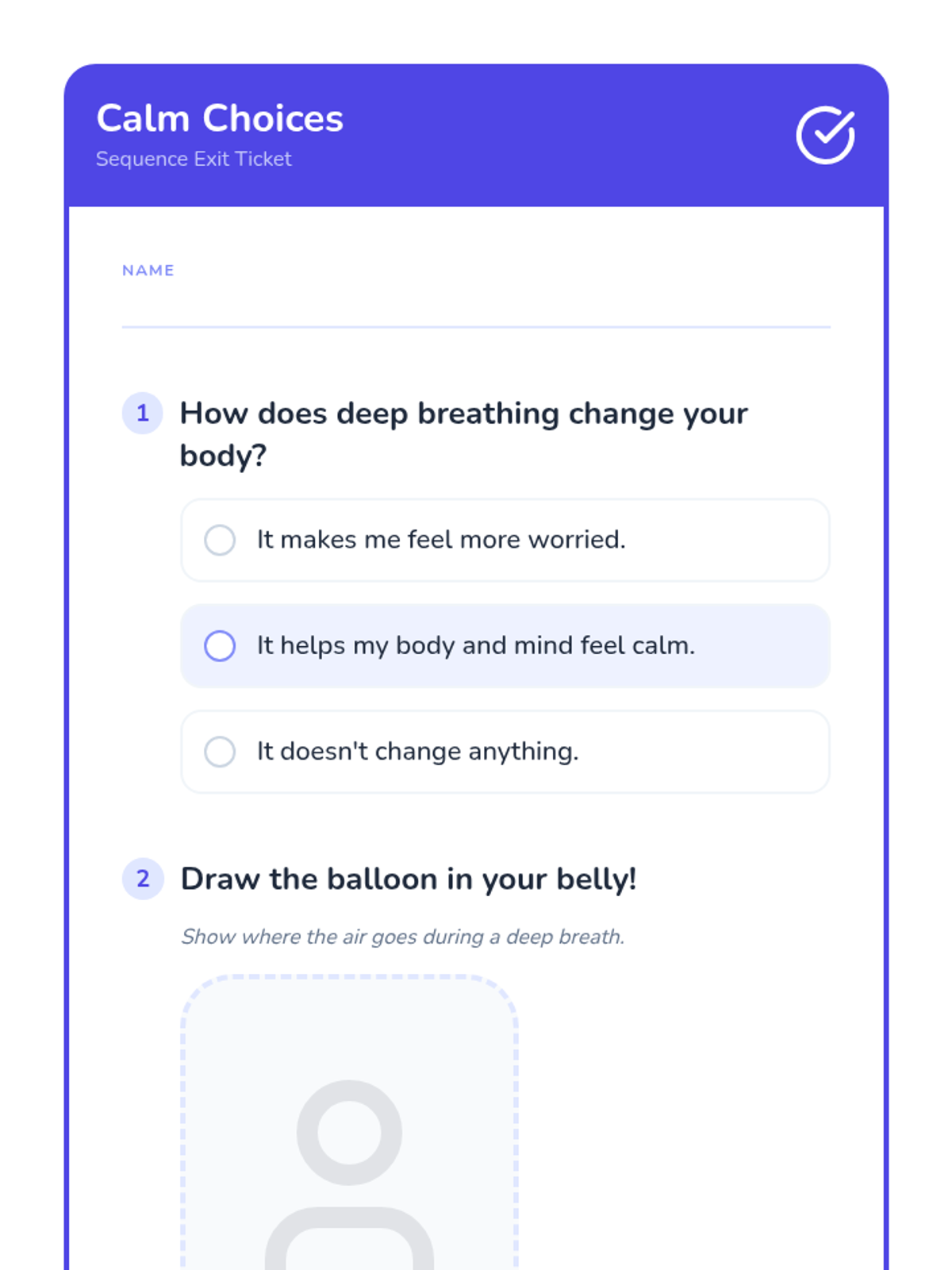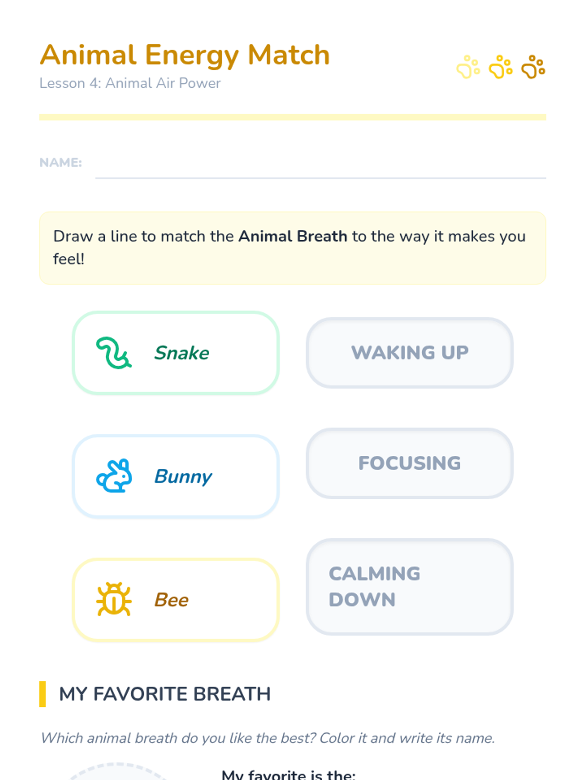 This sequence introduces 1st grade students to the fundamental mechanics of breath as a tool for calming the nervous system. Students explore natural rhythms, practice diaphragmatic breathing with 'belly buddies,' learn tactile hand-tracing techniques, and experiment with animal-themed breaths for energy regulation.