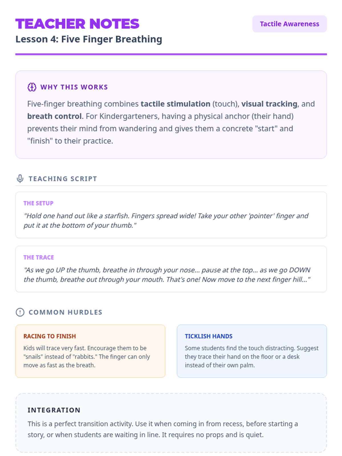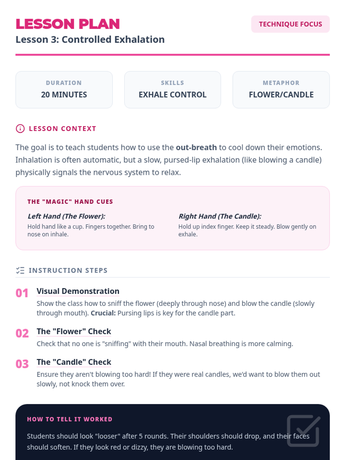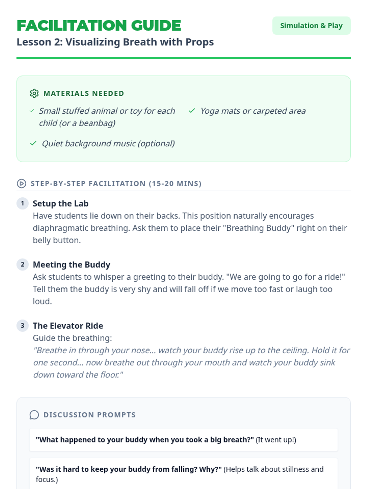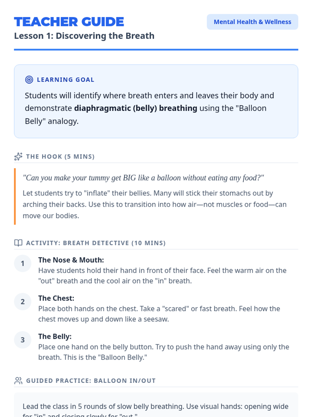 This sequence introduces Kindergarten students to the fundamental mechanics of breath as a tool for self-regulation. Students move from automatic breathing to conscious control, learning specific techniques like 'belly breathing' and controlled exhalation through tactile feedback and visual metaphors.