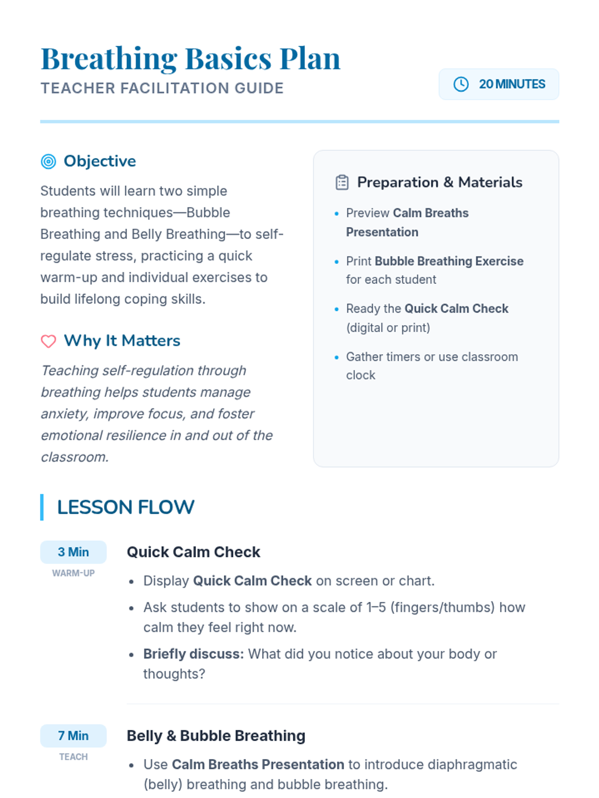 A series of short lessons focused on teaching elementary students foundational mindfulness and self-regulation skills through controlled breathing and awareness.