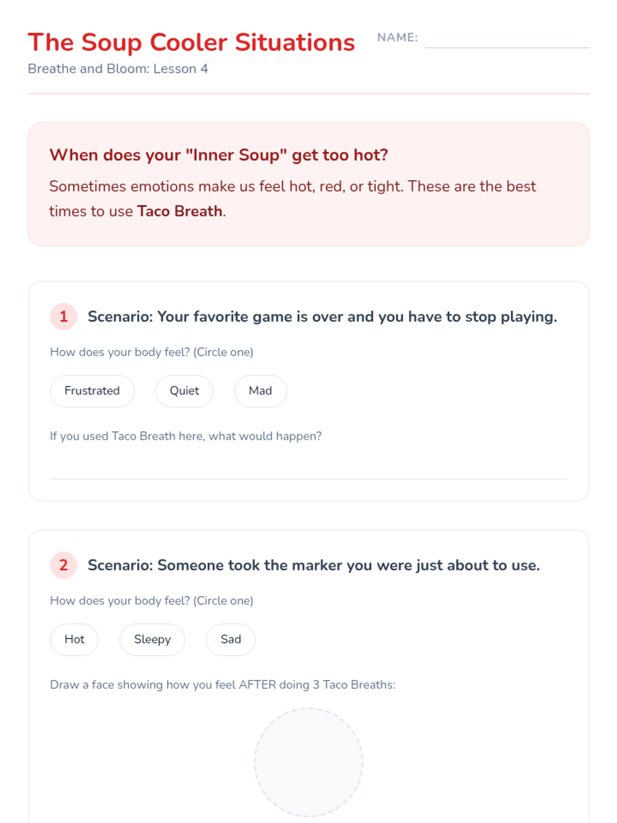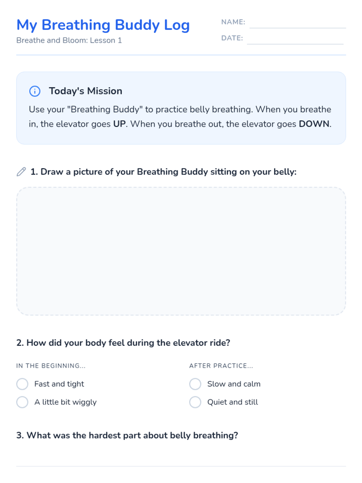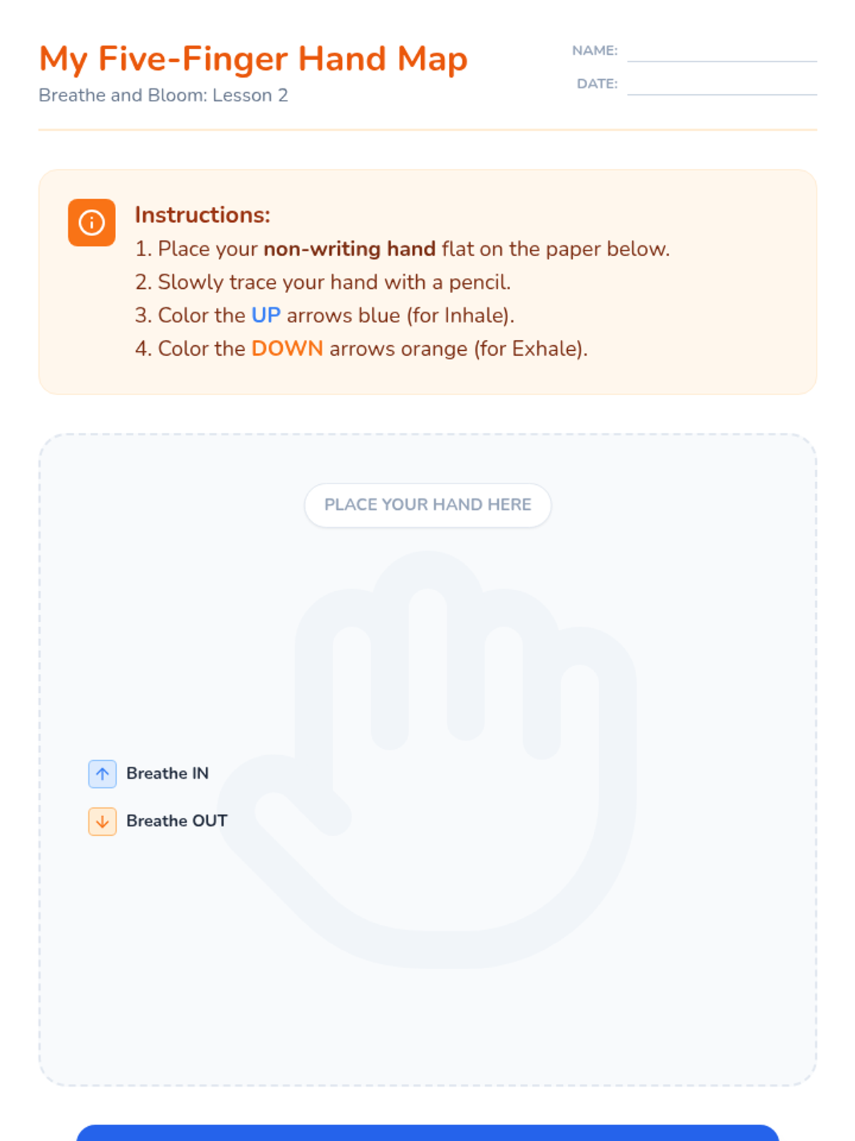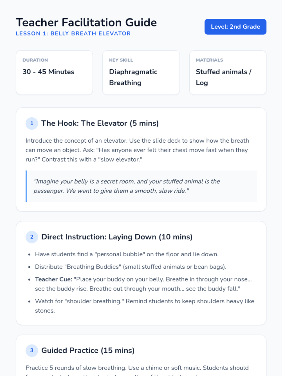 A foundational 5-lesson sequence for 2nd graders to discover the power of focused breathing for emotional regulation and body awareness. Students explore diaphragmatic breathing, rhythmic patterns, and sensory-guided techniques to build a personal toolkit for calmness.