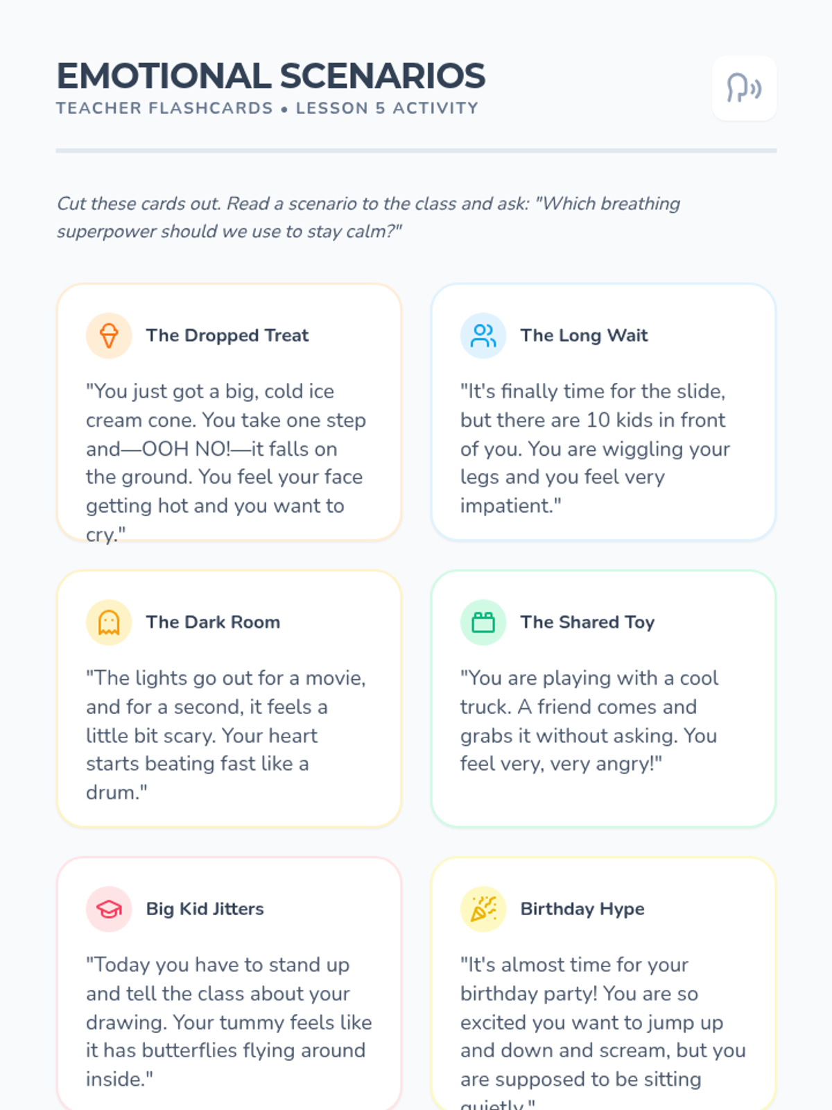 This Kindergarten sequence teaches foundational conscious breathing as a tool for emotional regulation. Students progress from noticing their breath to mastering specific techniques like Flower and Candle, Belly Breathing, and Five-Finger Breathing, eventually applying these to manage 'big feelings' throughout the school day.