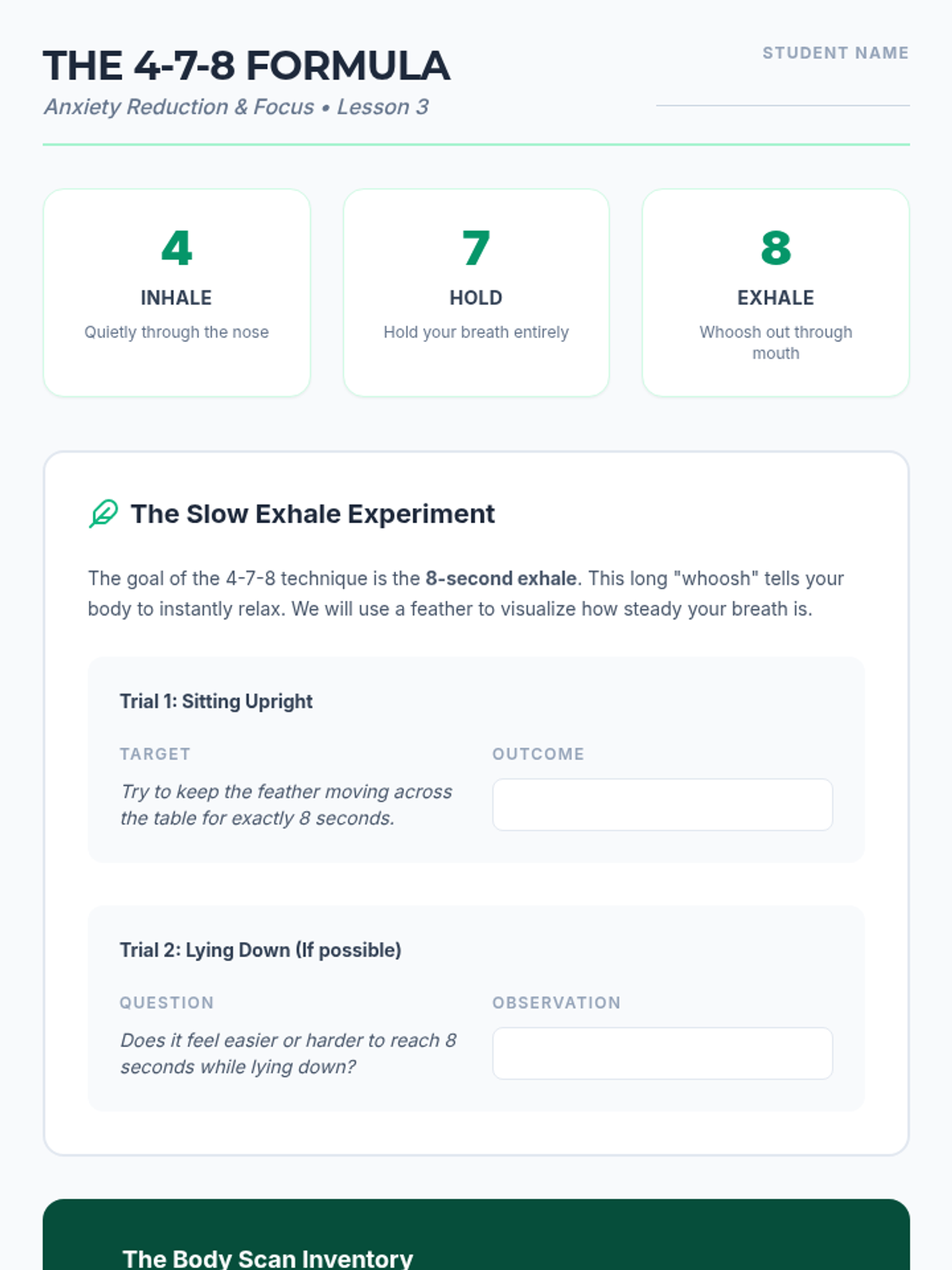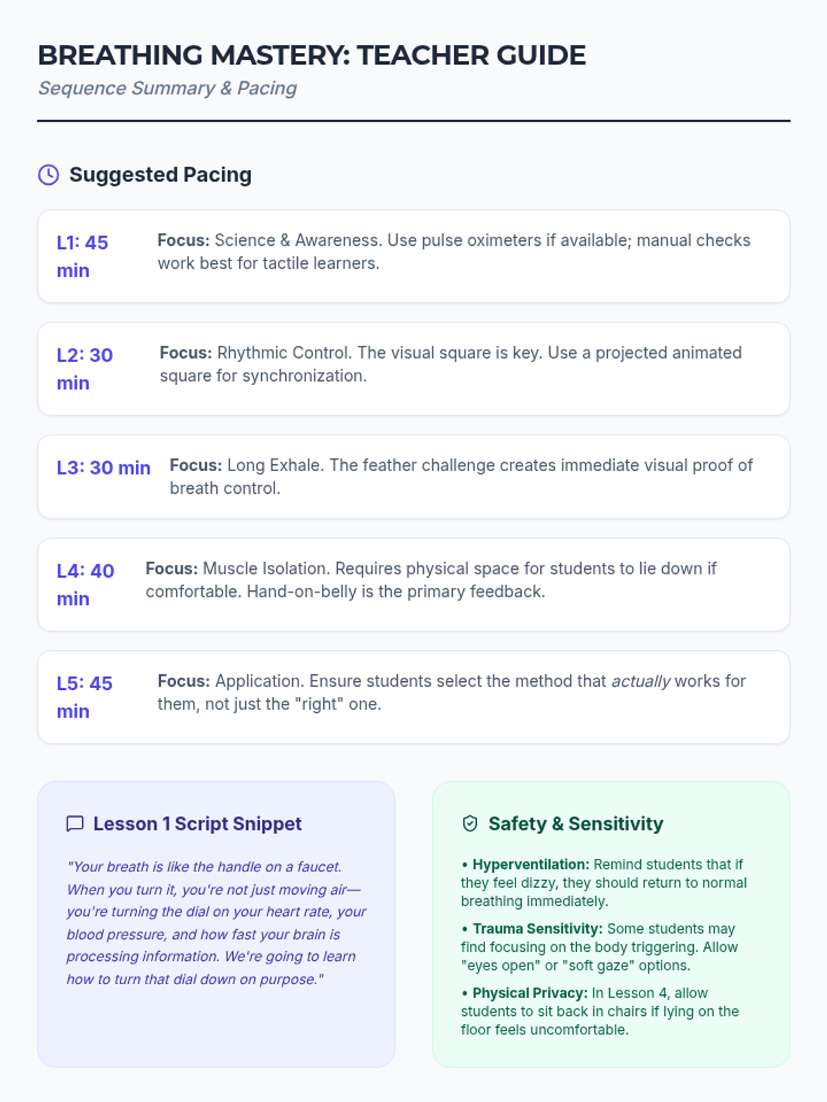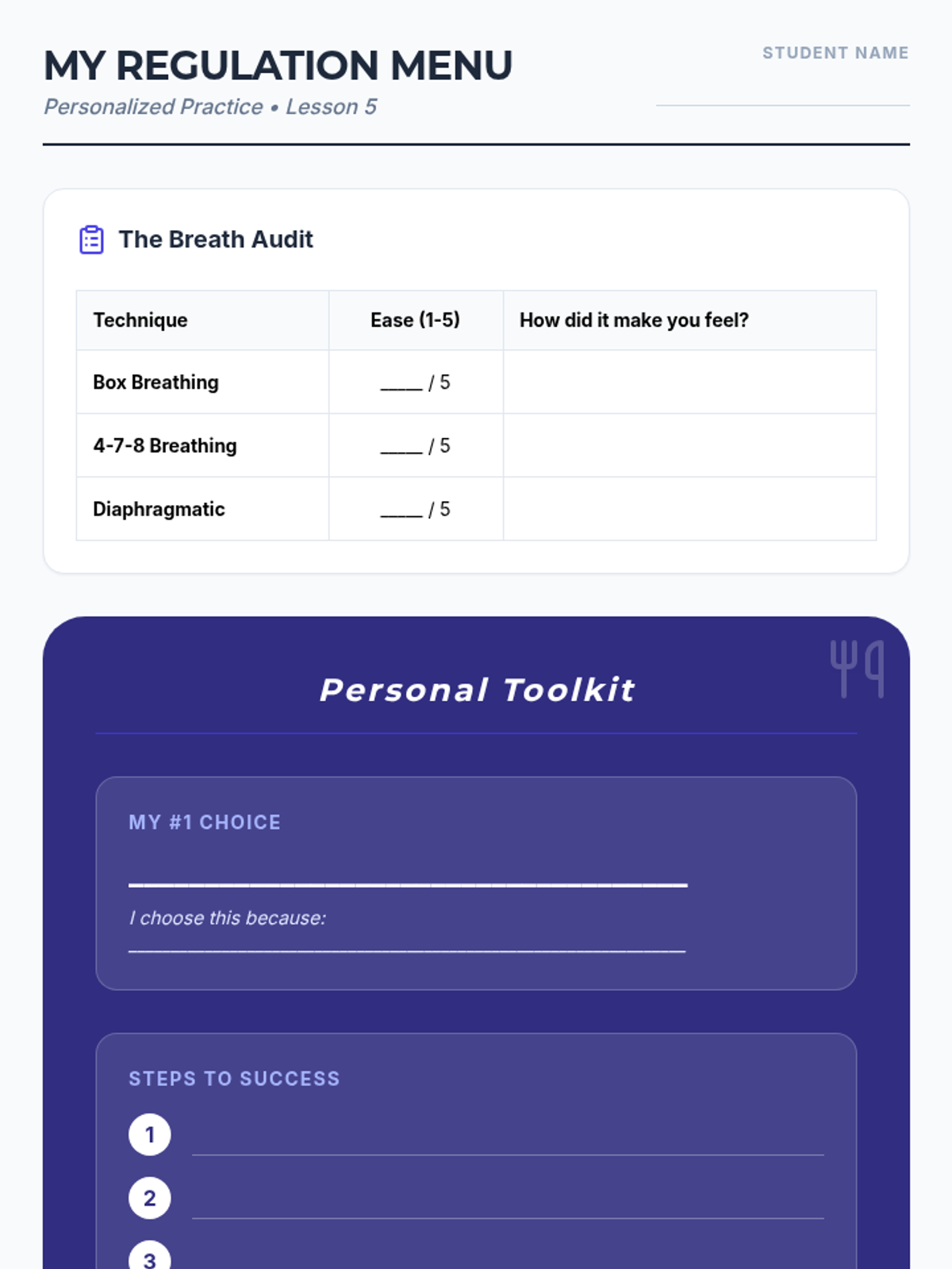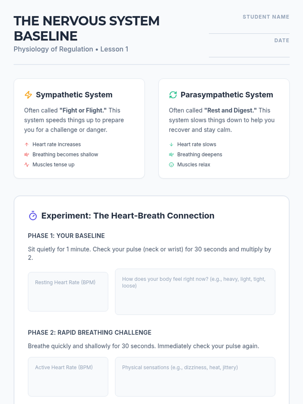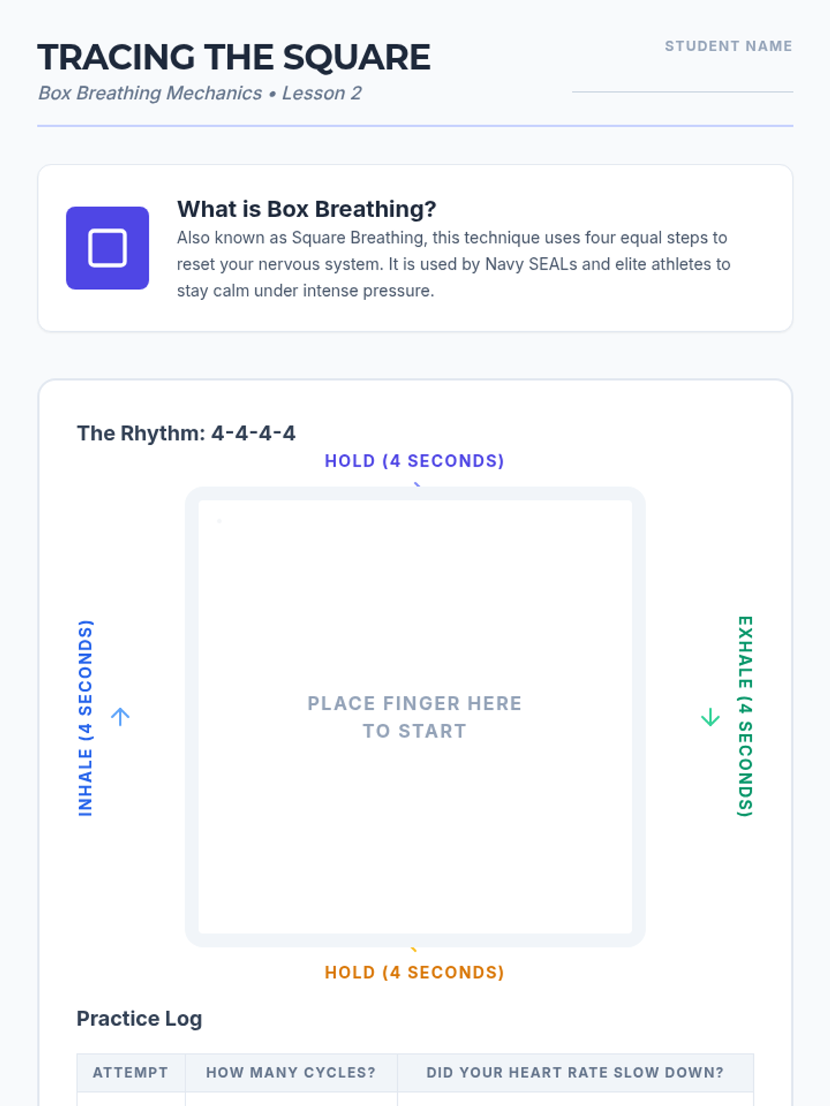 A comprehensive sequence for 10th-grade students to master deep breathing as a regulation tool. It covers the physiology of the nervous system and three specific techniques: Box Breathing, 4-7-8, and Diaphragmatic Breathing, ending with a personalized regulation menu.