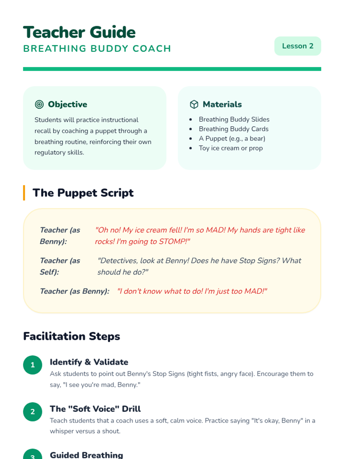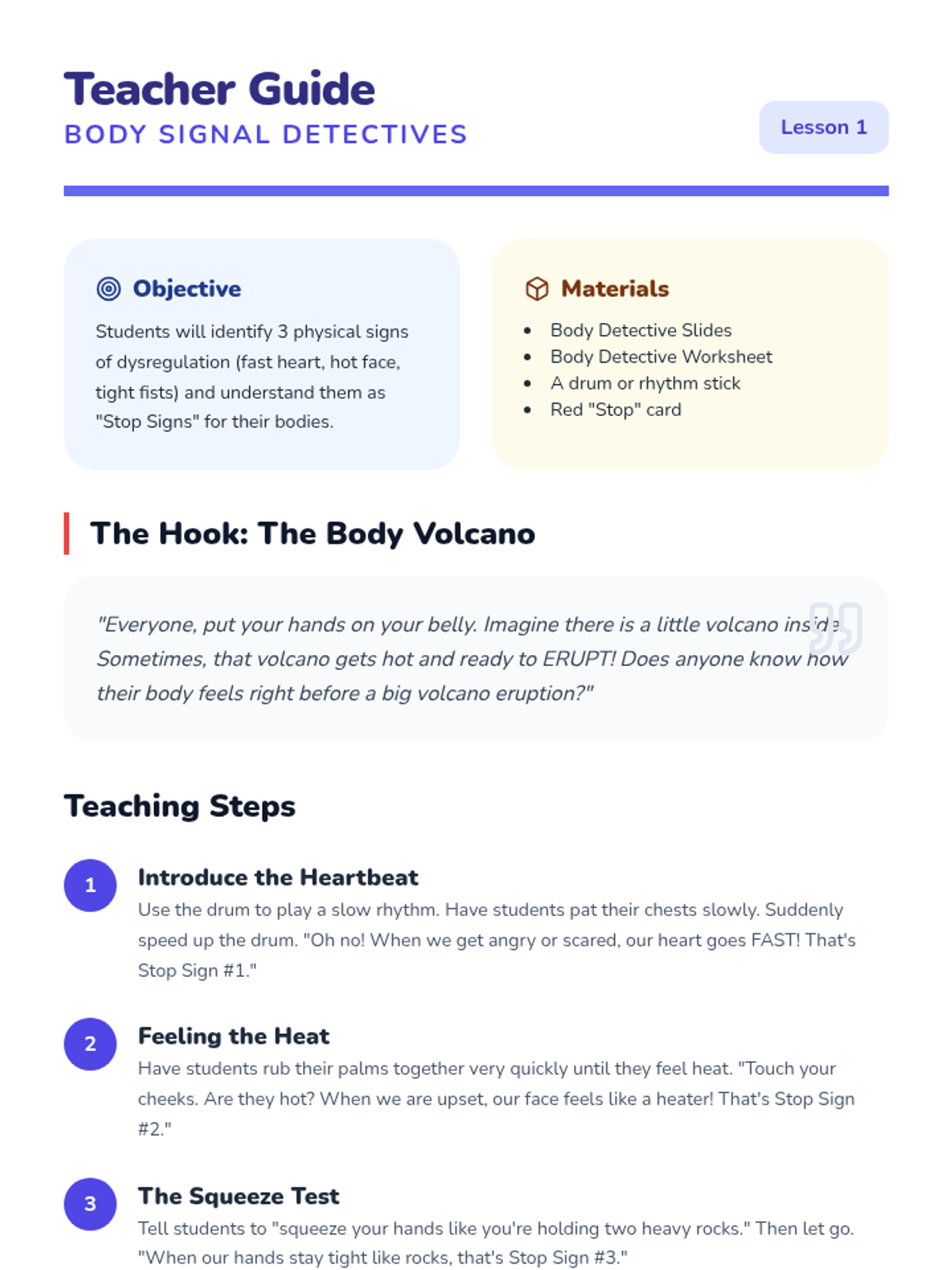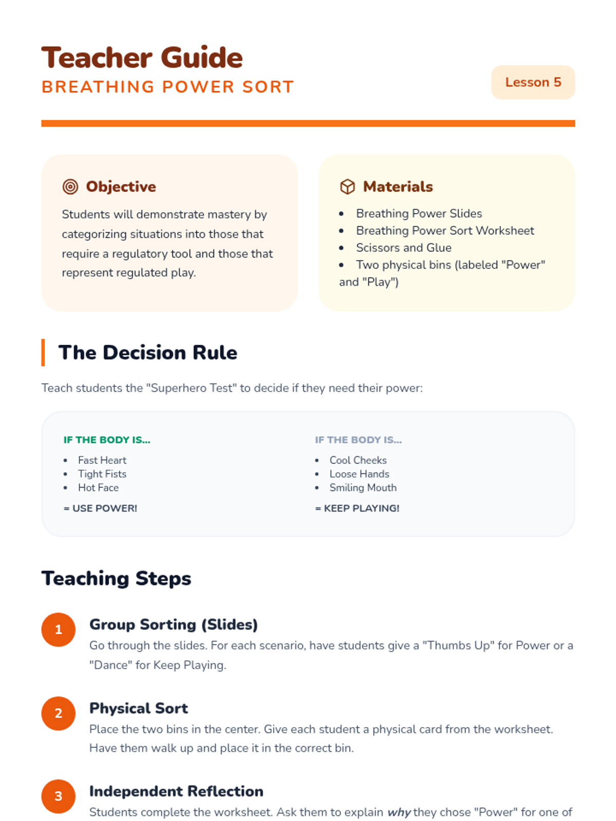 This sequence focuses on teaching Pre-K students to recognize physical signs of dysregulation and apply deep breathing techniques as 'superpowers' for emotional regulation. Through puppet play, routines, and sorting games, students move from external observation to internal body awareness.