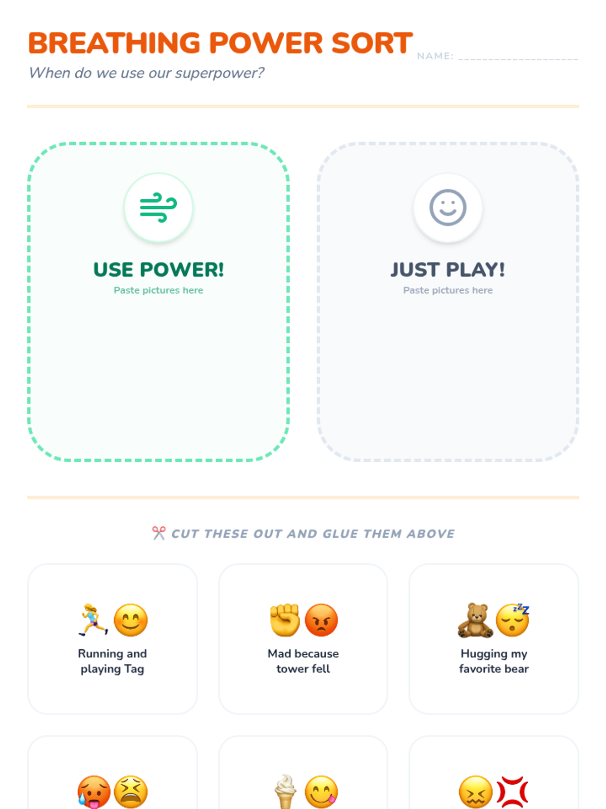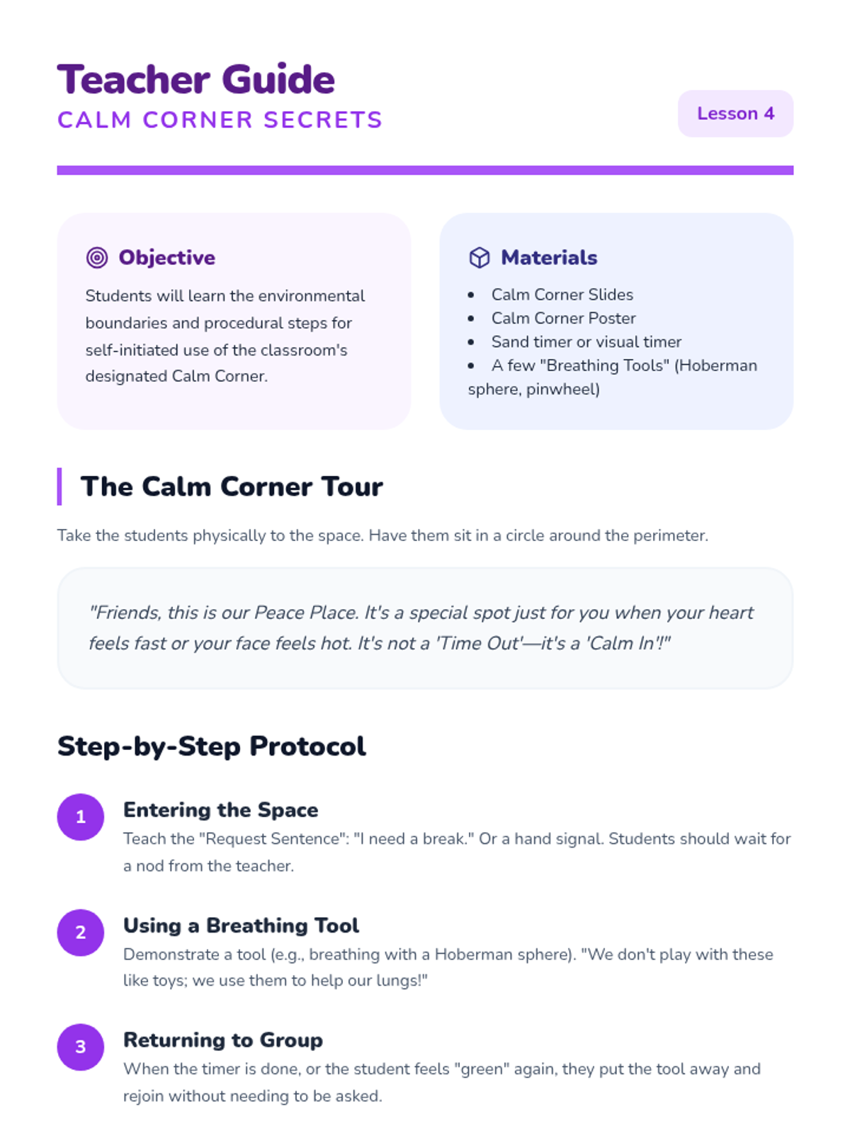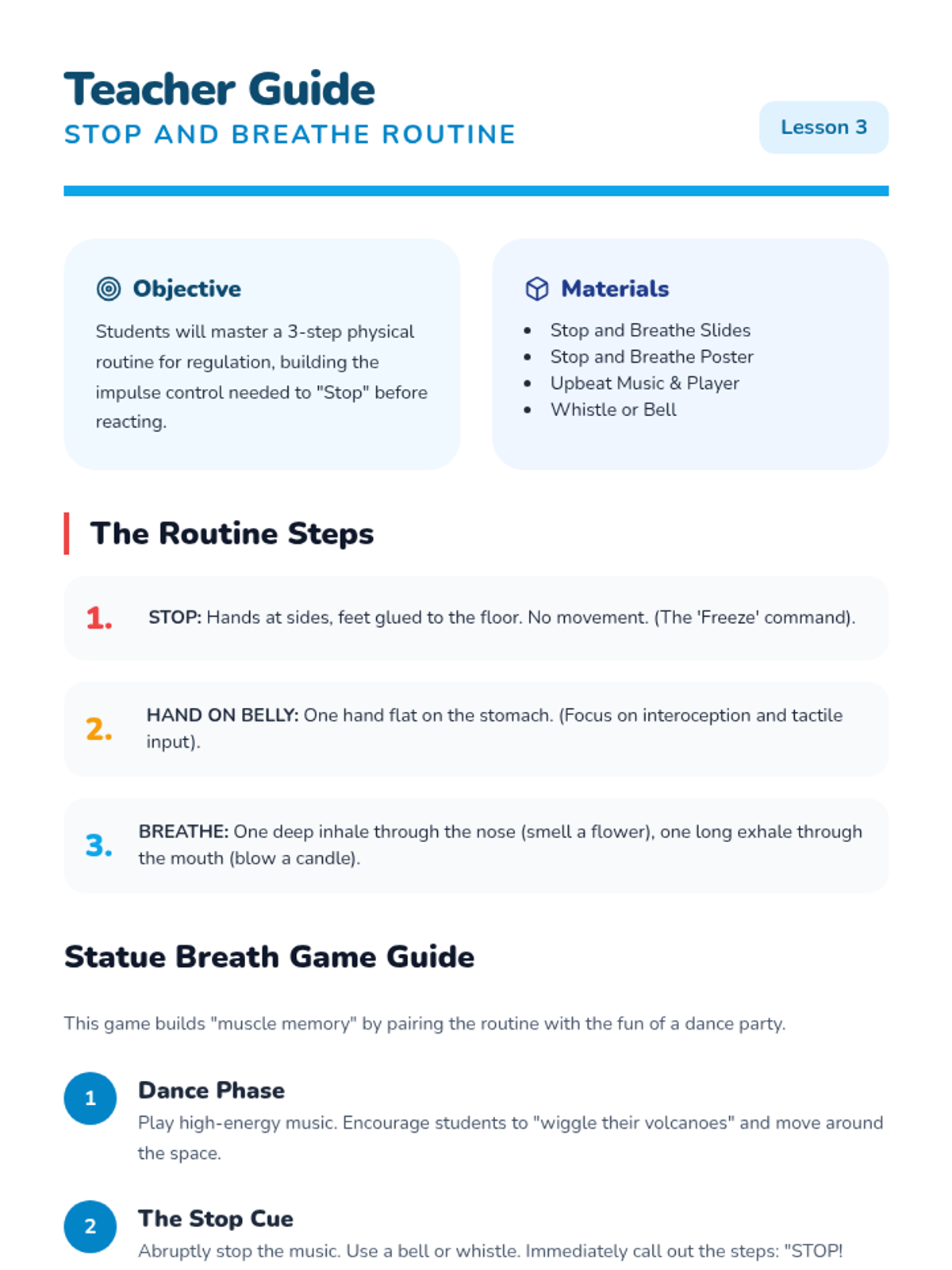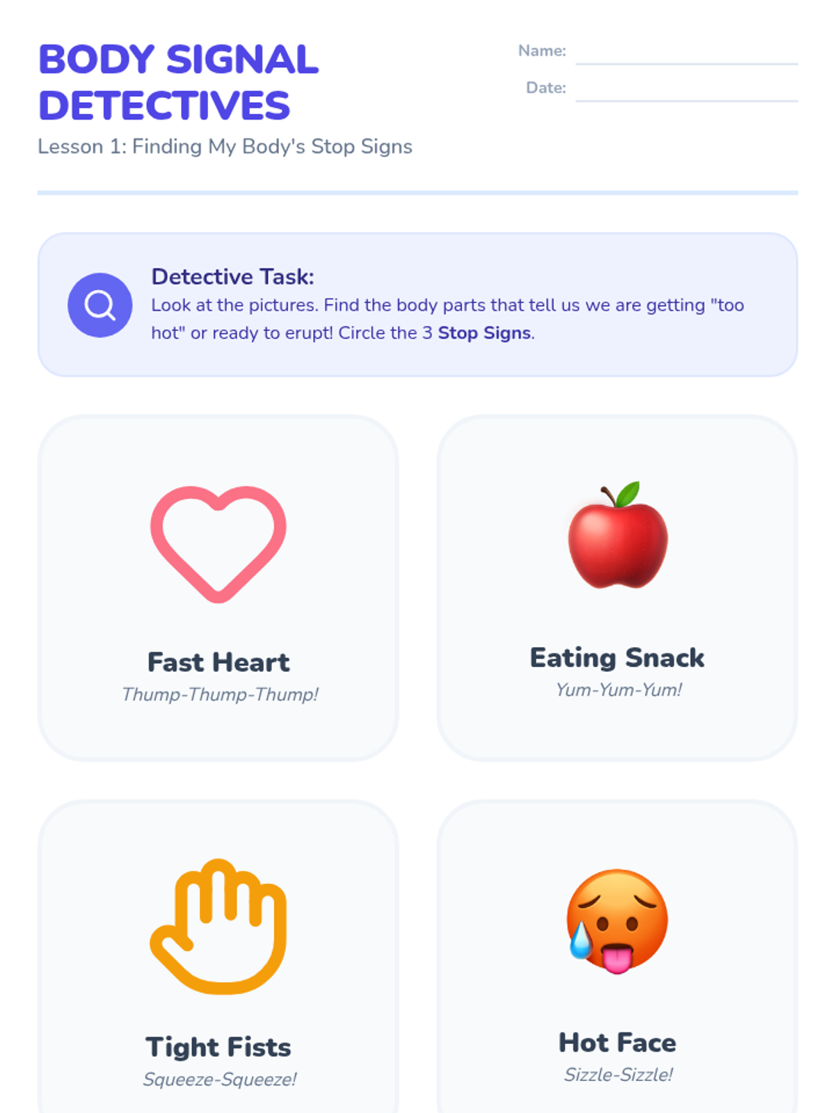 This sequence focuses on teaching Pre-K students to recognize physical signs of dysregulation and apply deep breathing techniques as 'superpowers' for emotional regulation. Through puppet play, routines, and sorting games, students move from external observation to internal body awareness.