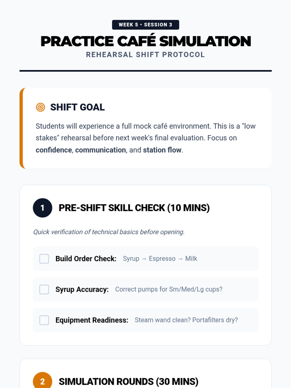 A comprehensive training program for aspiring cafe professionals, focusing on operational roles, communication, and drink preparation accuracy. Students progress from basic role understanding to master professional communication and precision in every pour.