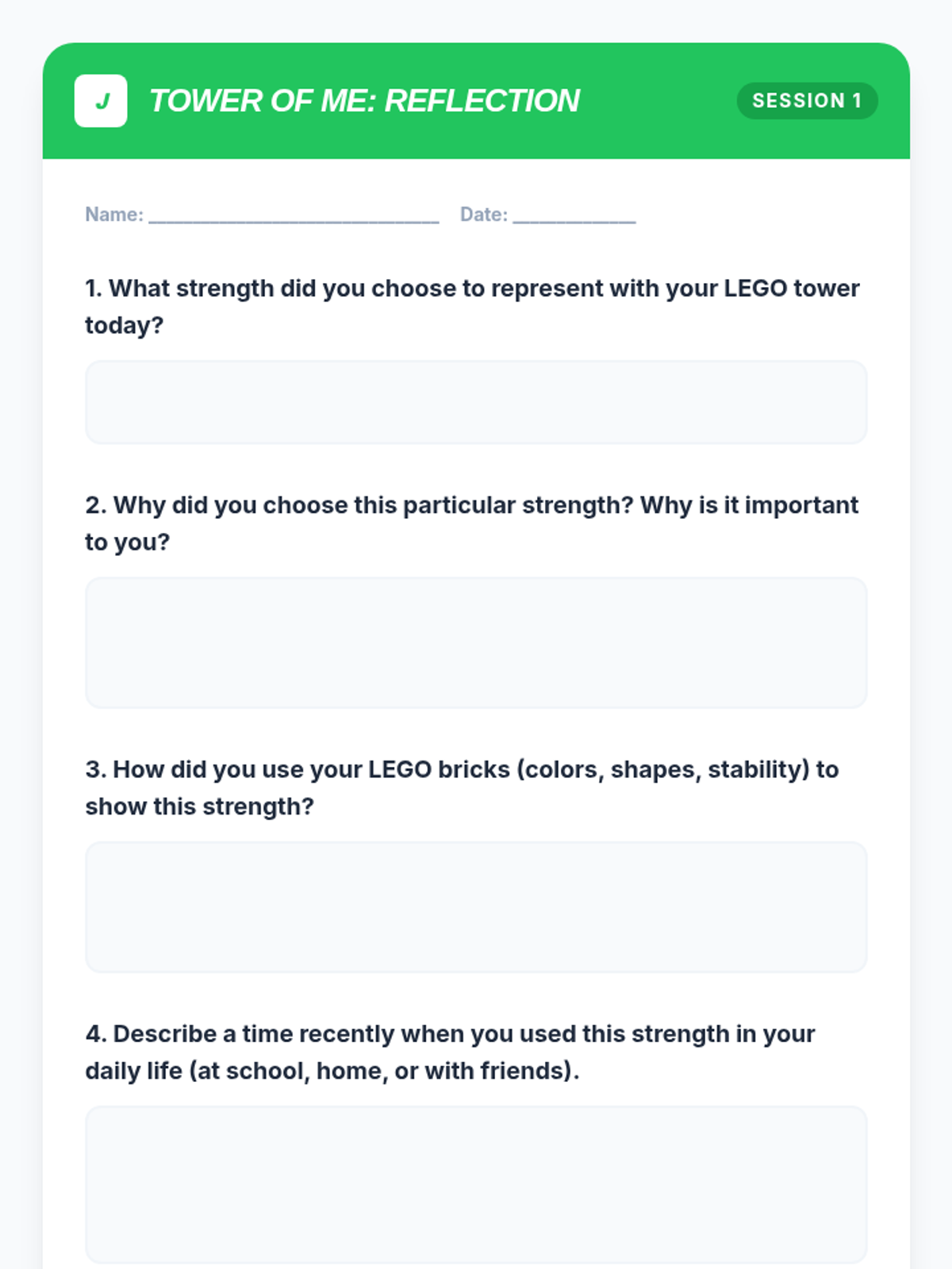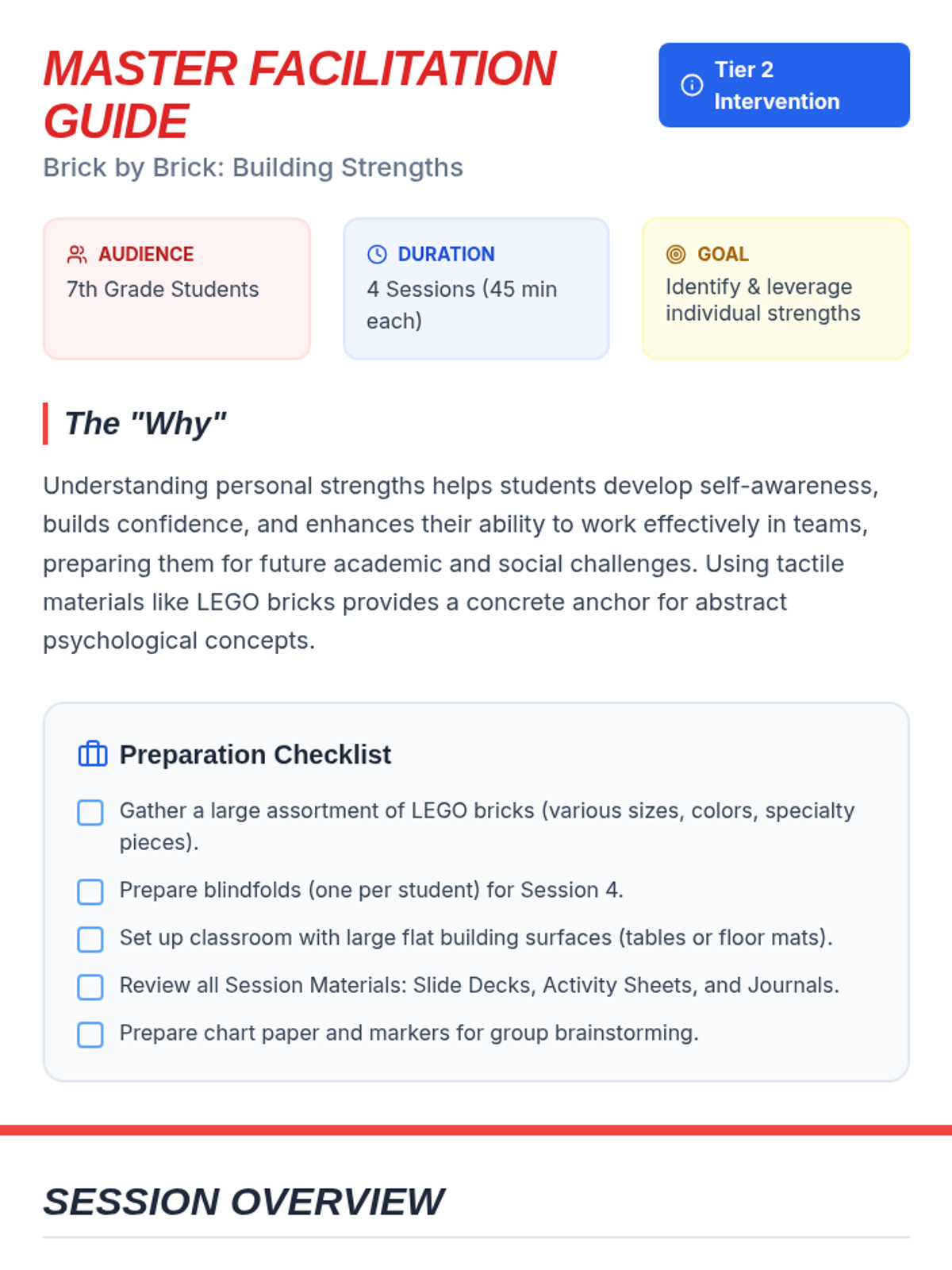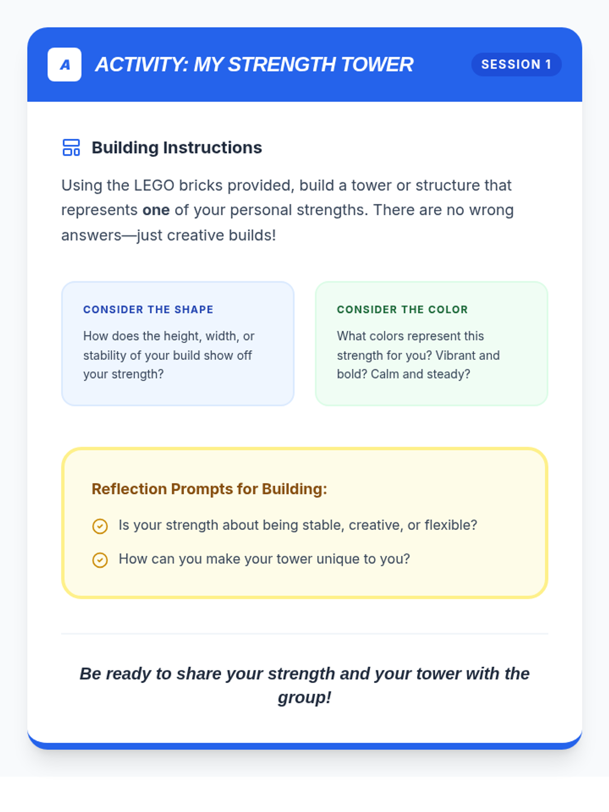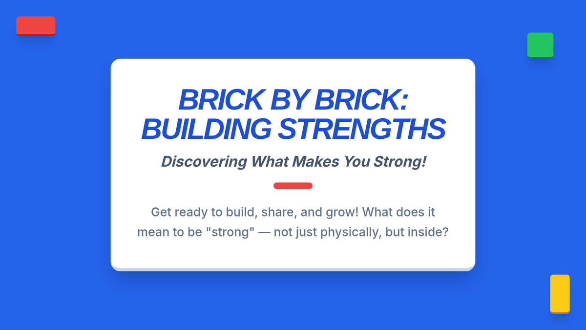 A 4-session LEGO-based intervention for 7th graders to identify personal strengths and develop collaborative teamwork skills. Through hands-on building challenges, students learn to articulate their value and contribute effectively to a team.