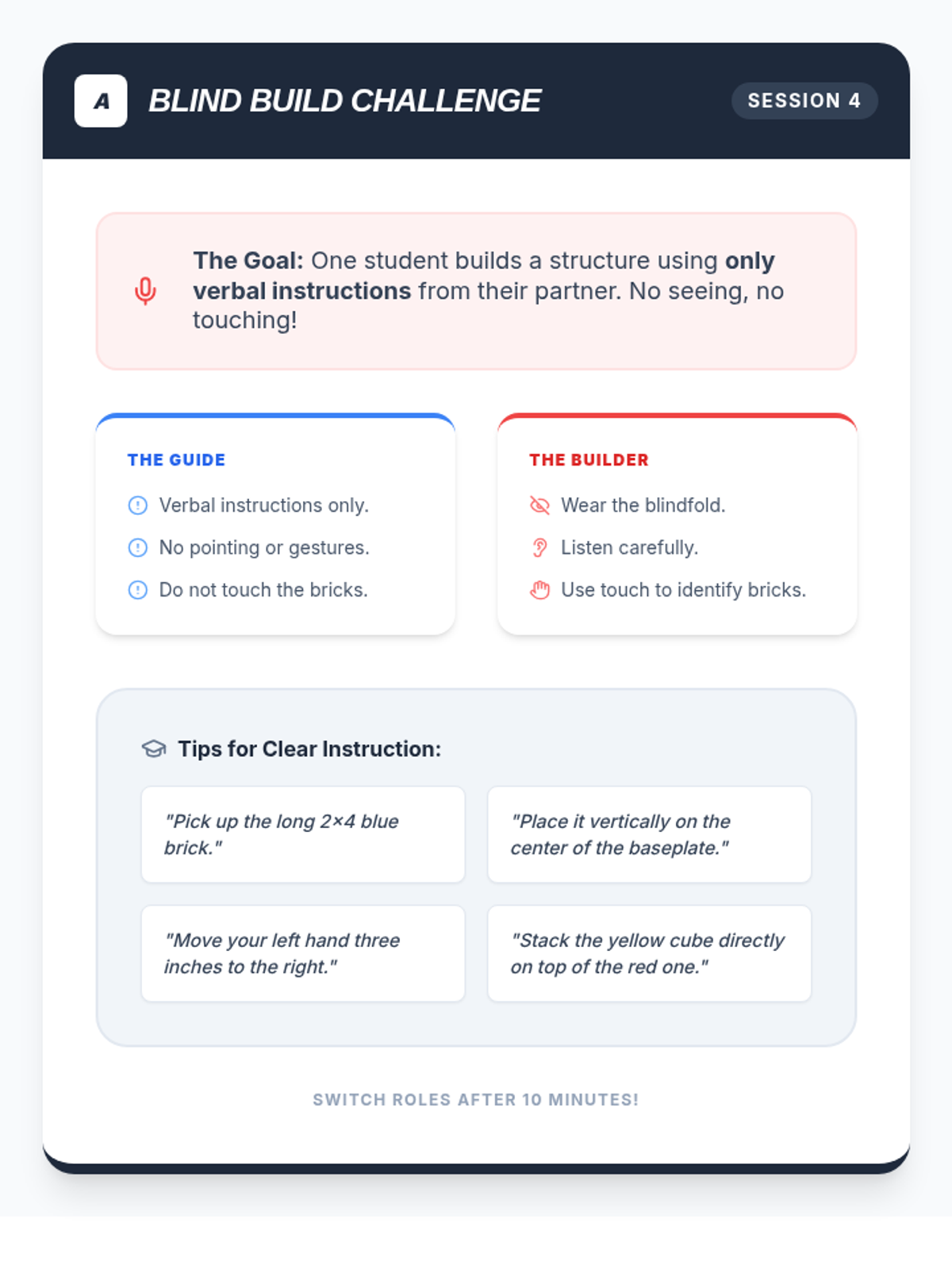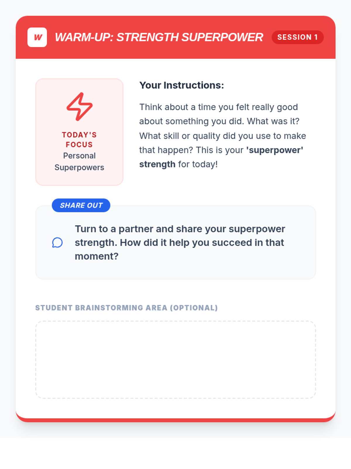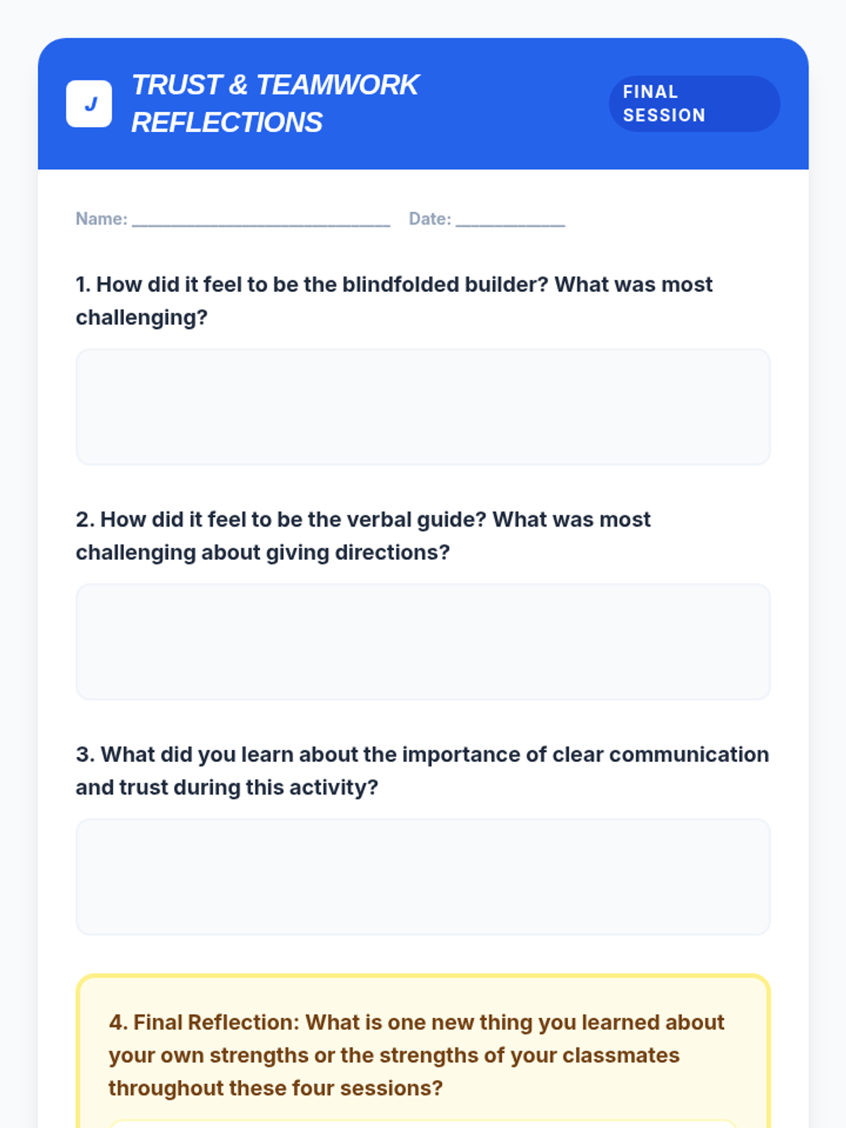 A 4-session LEGO-based intervention for 7th graders to identify personal strengths and develop collaborative teamwork skills. Through hands-on building challenges, students learn to articulate their value and contribute effectively to a team.