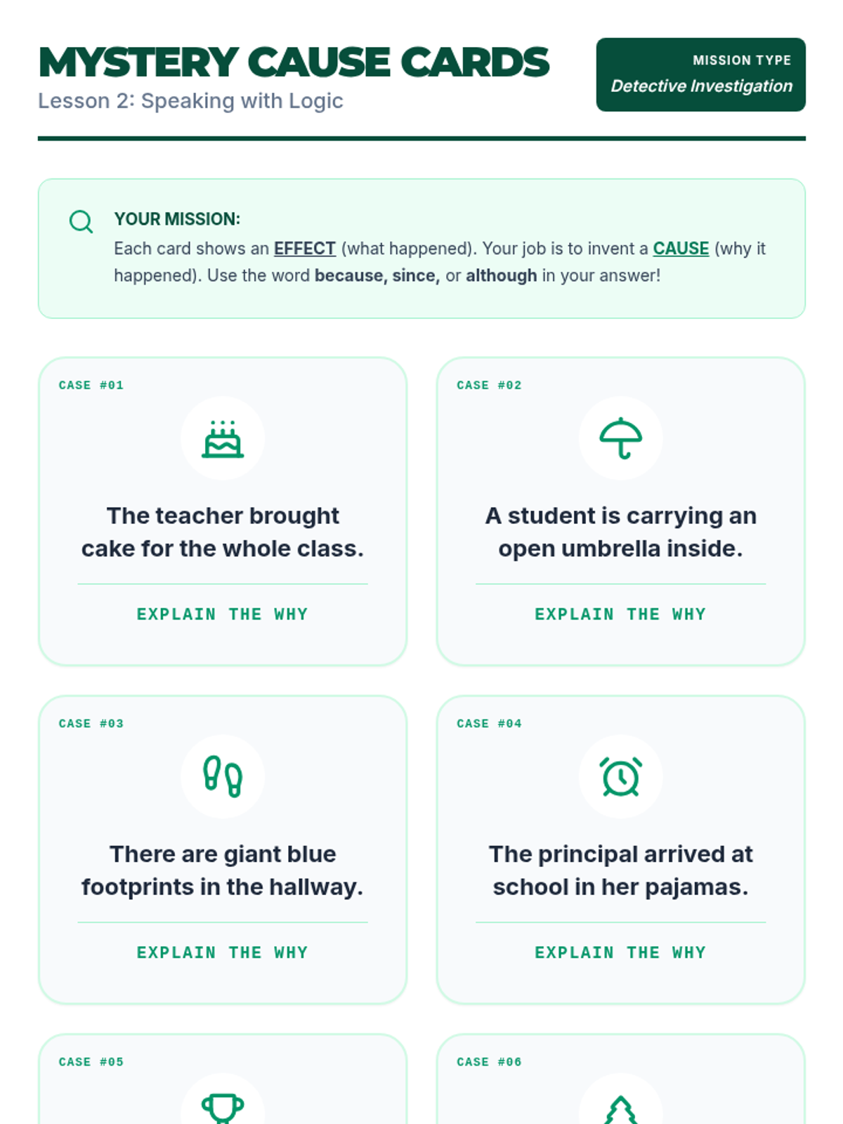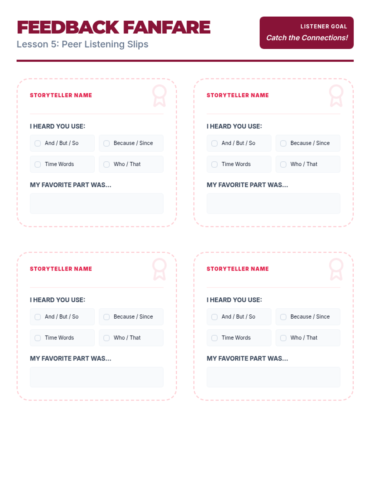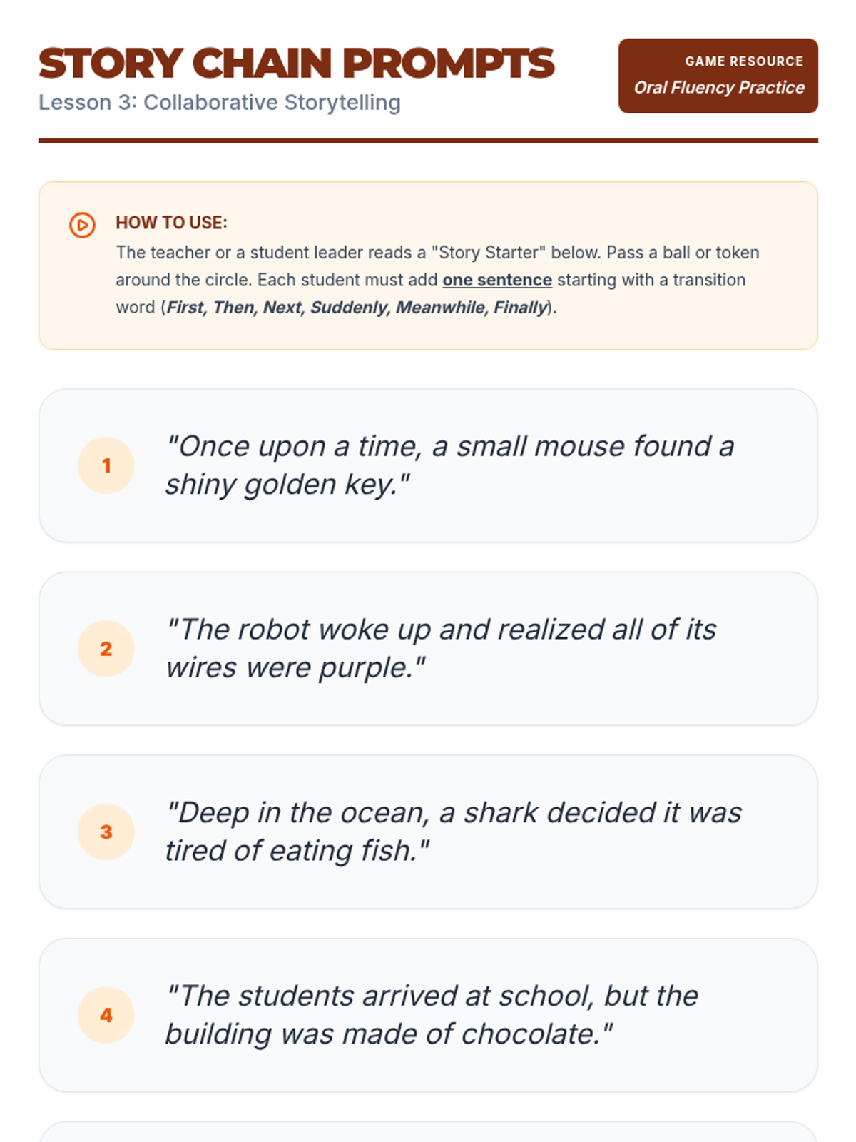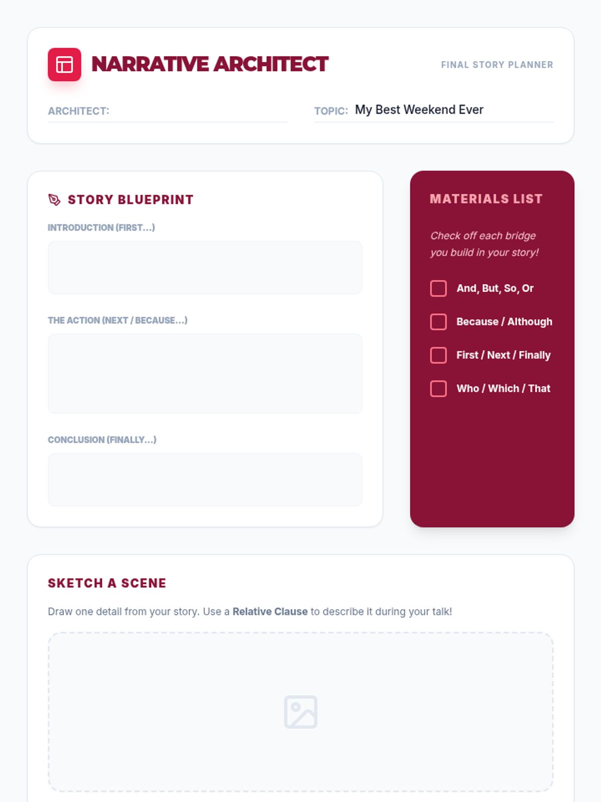 A sequence for intermediate ESL students to master complex sentence structures in oral storytelling. Students transition from choppy, simple sentences to fluid narratives using conjunctions, transitions, and relative clauses.