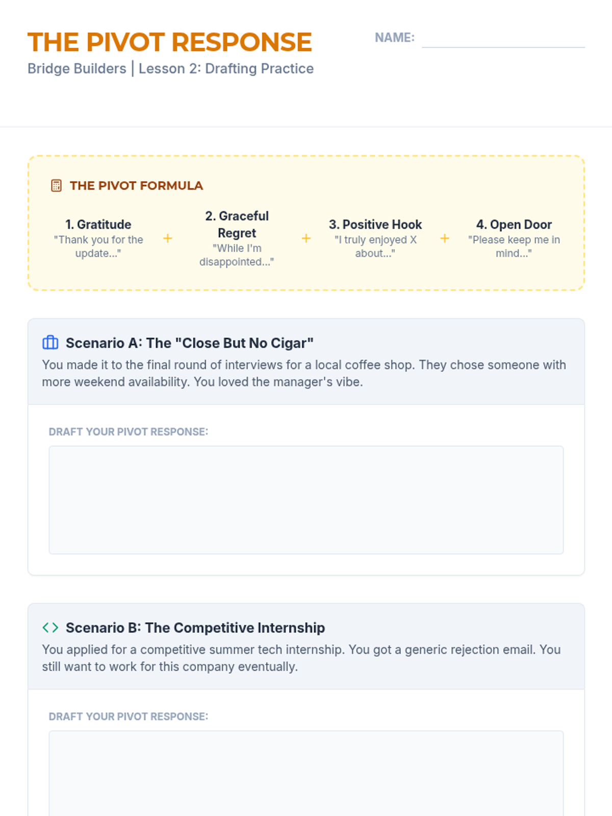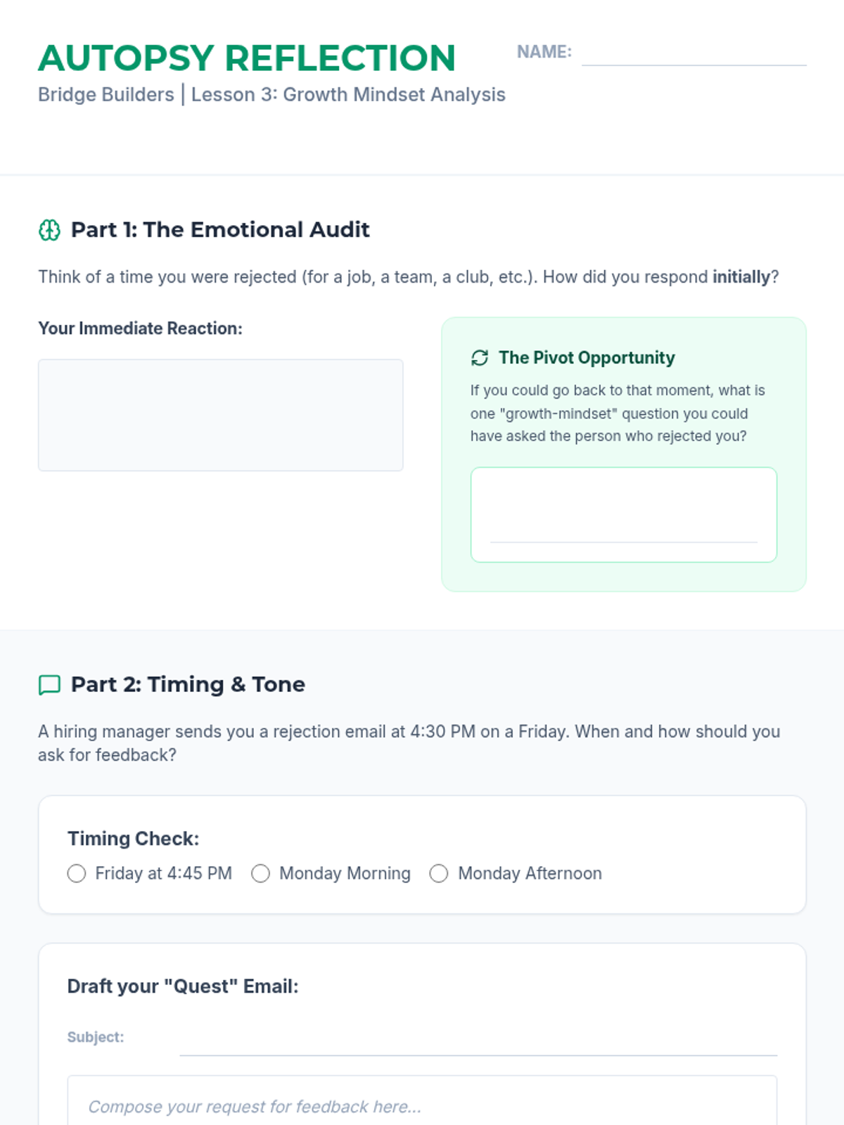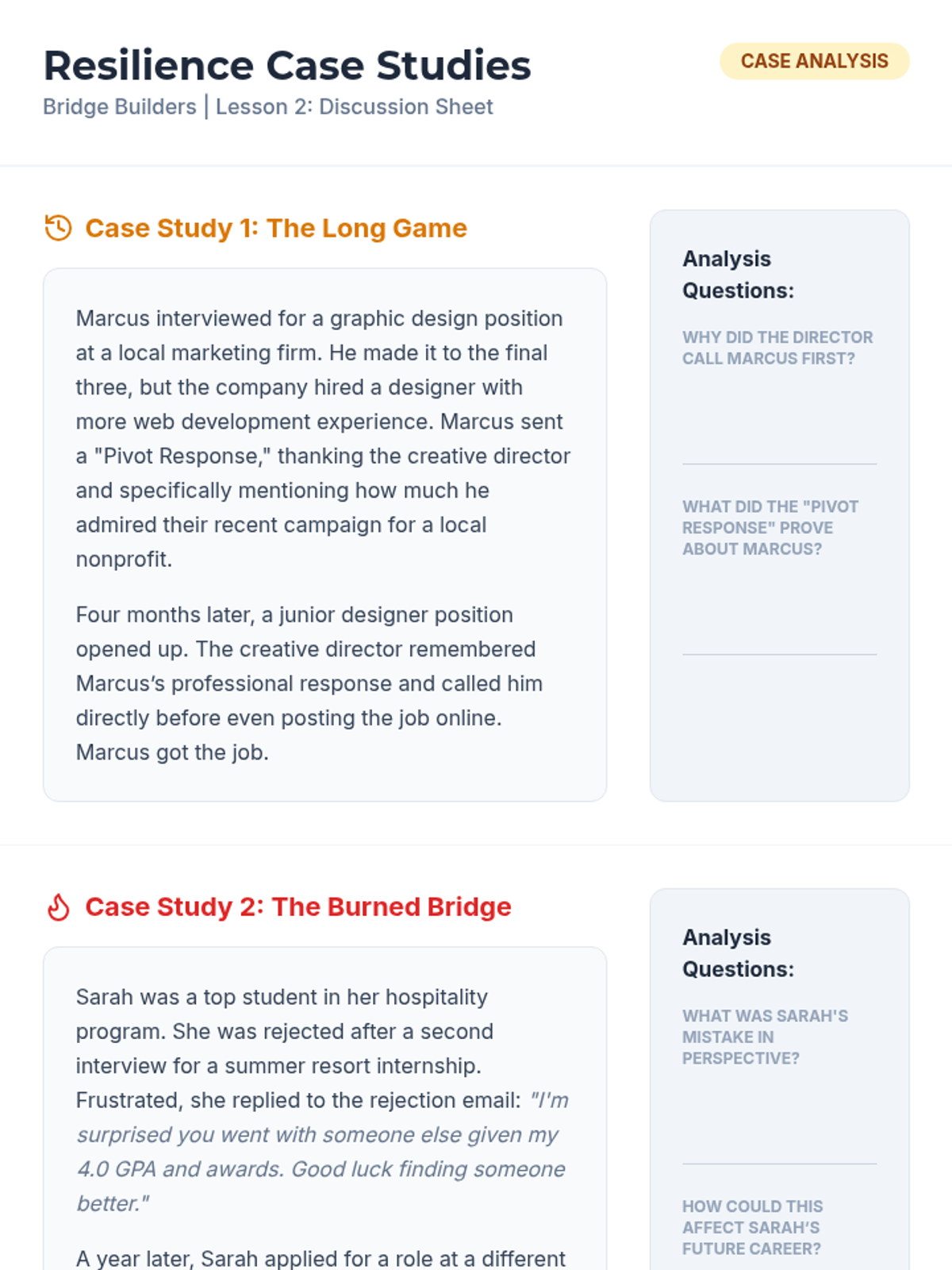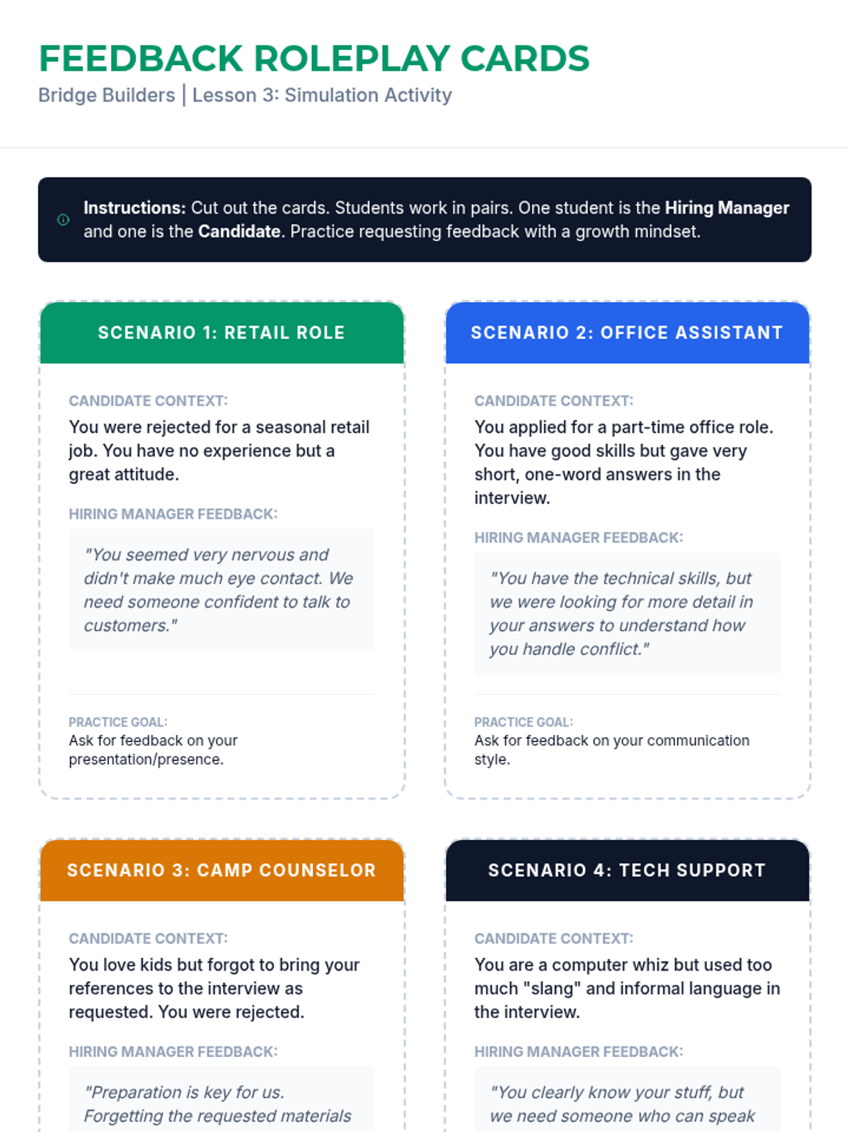 A 12th-grade sequence focused on the psychological and communicative aspects of interview outcomes. Students learn to navigate rejection, solicit feedback, analyze offers, and communicate professionally regardless of the result.