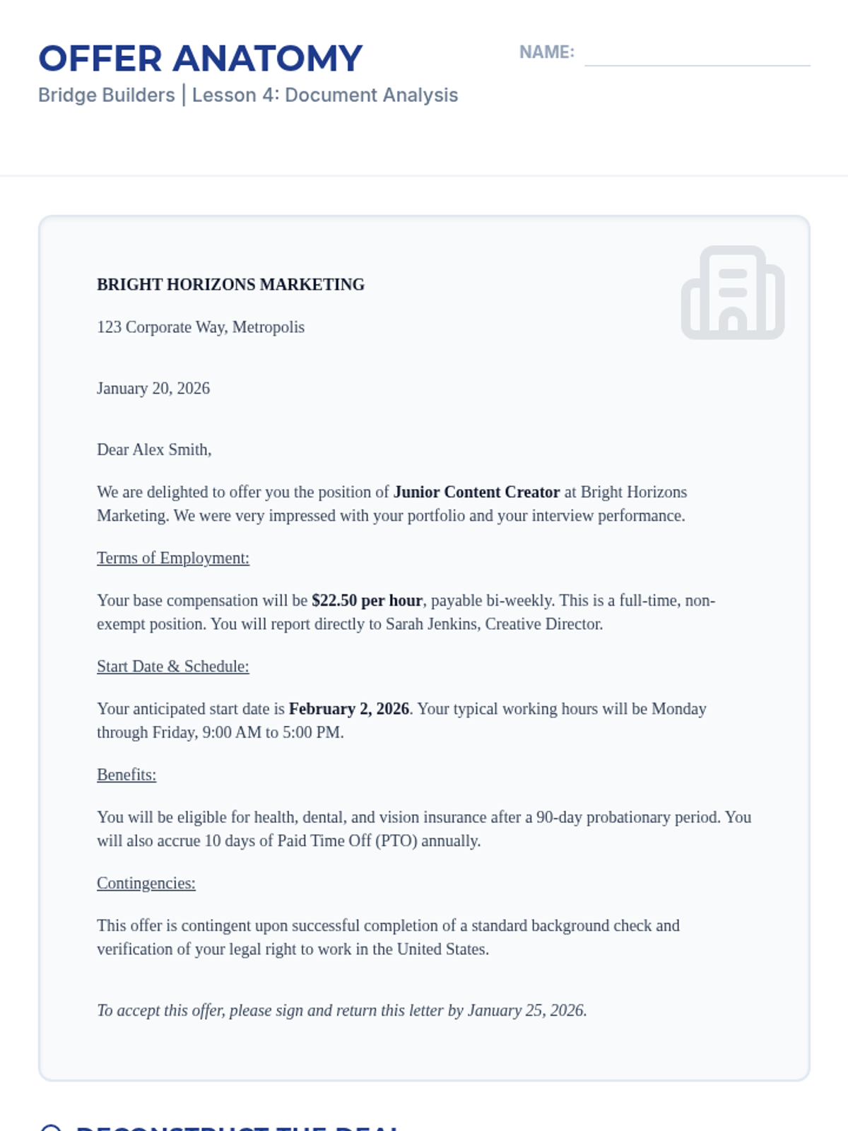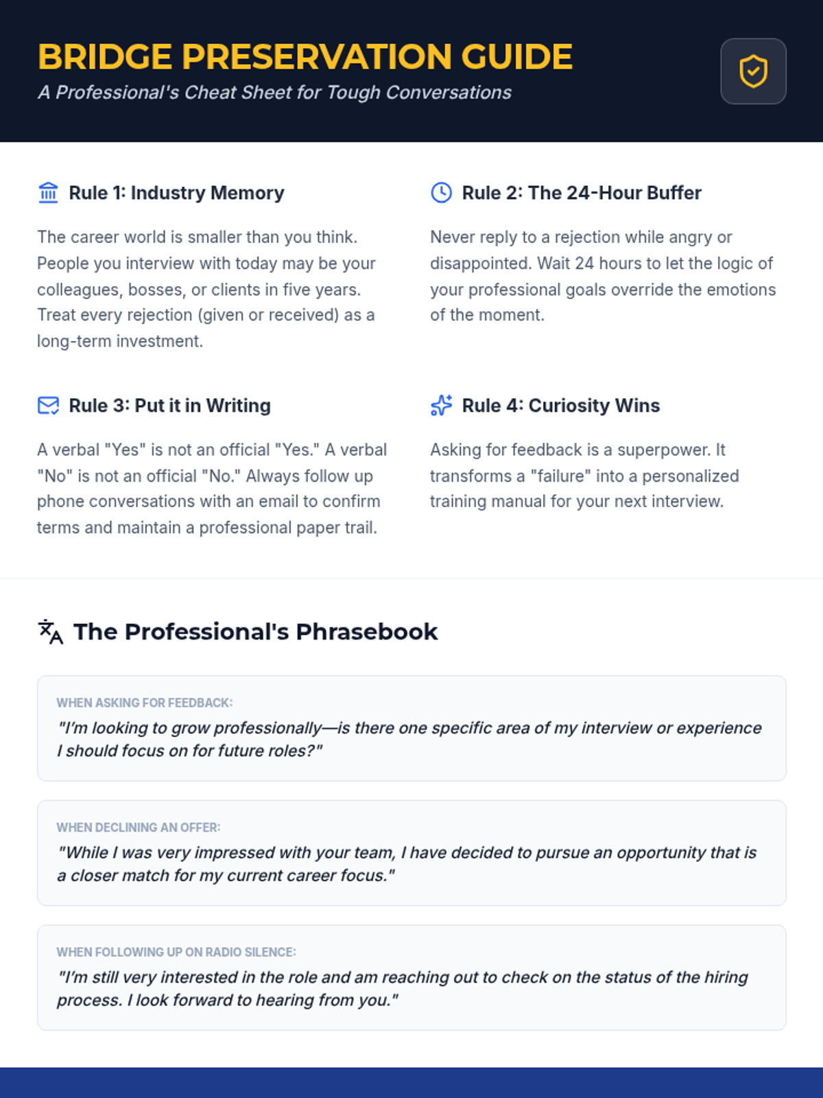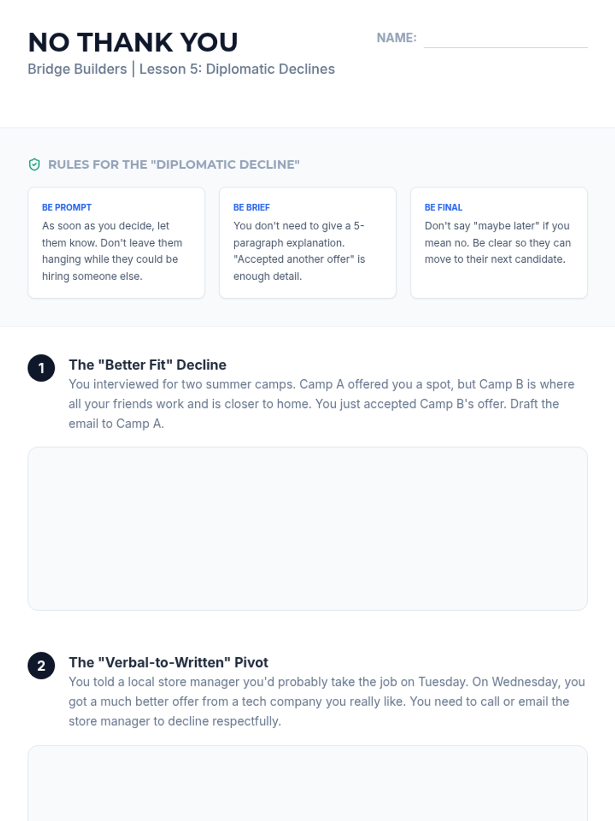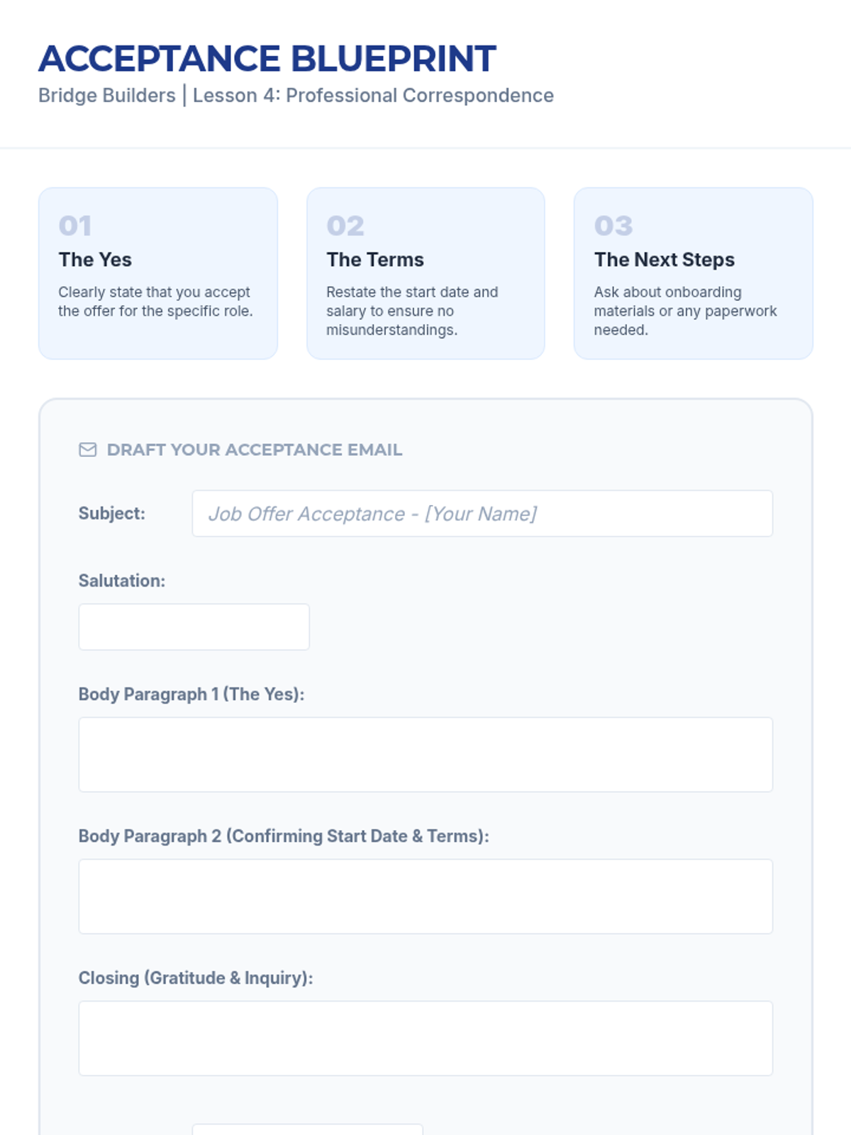 A 12th-grade sequence focused on the psychological and communicative aspects of interview outcomes. Students learn to navigate rejection, solicit feedback, analyze offers, and communicate professionally regardless of the result.