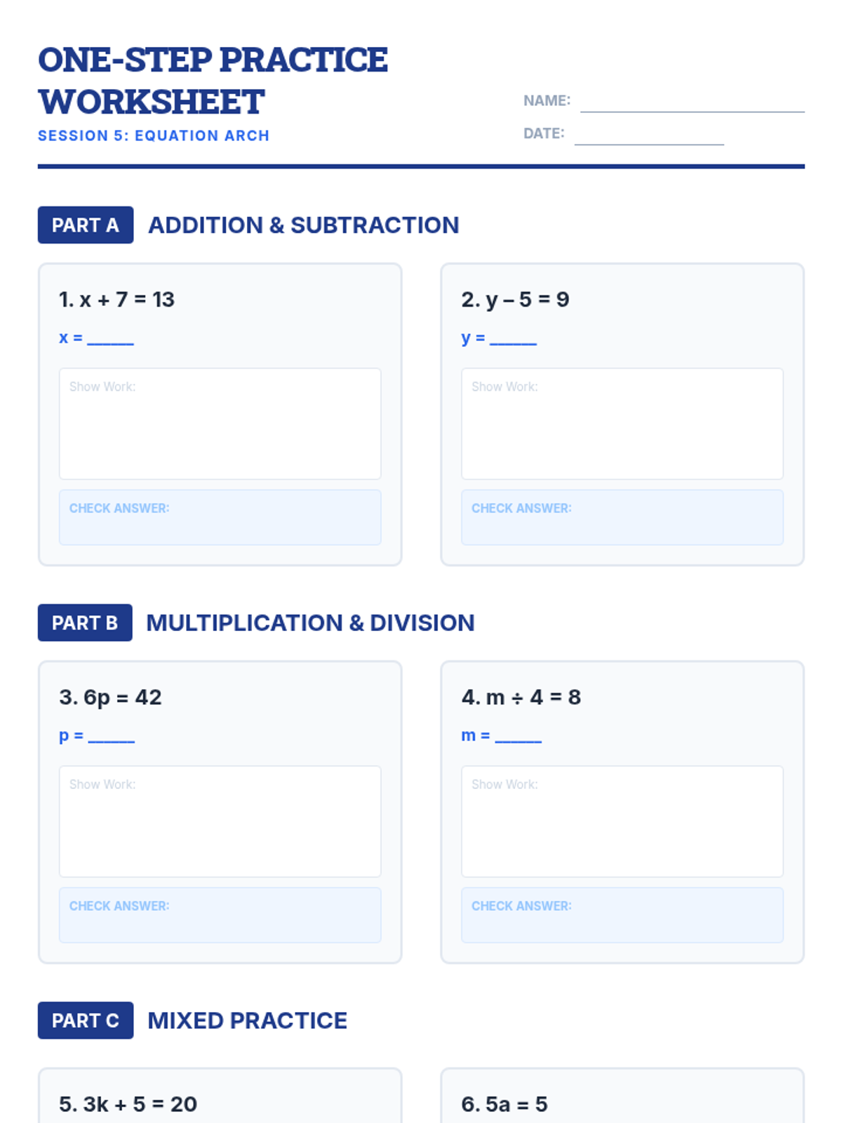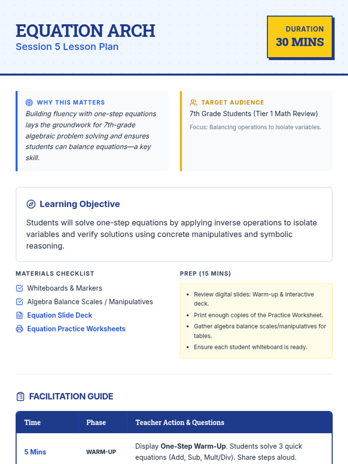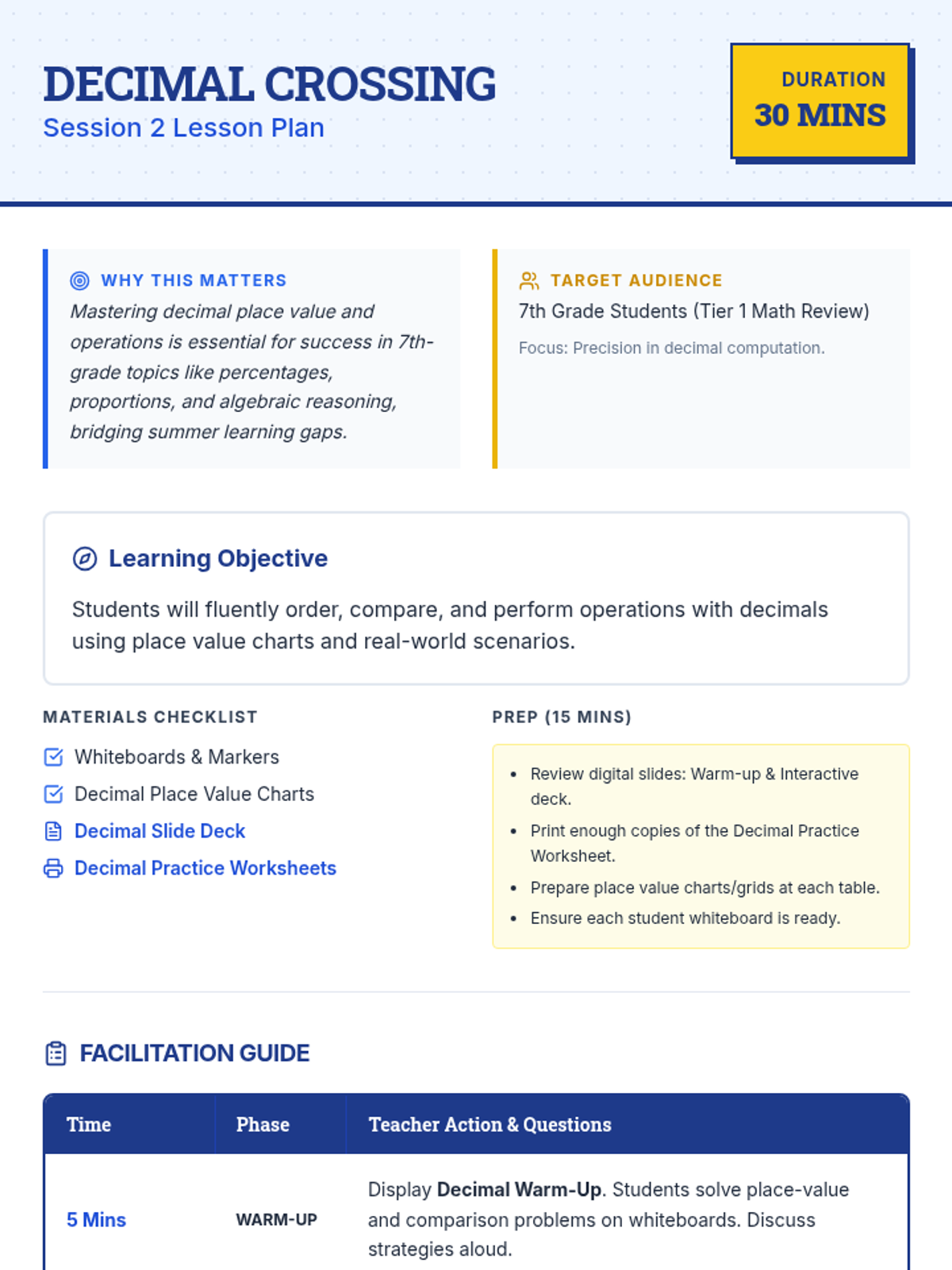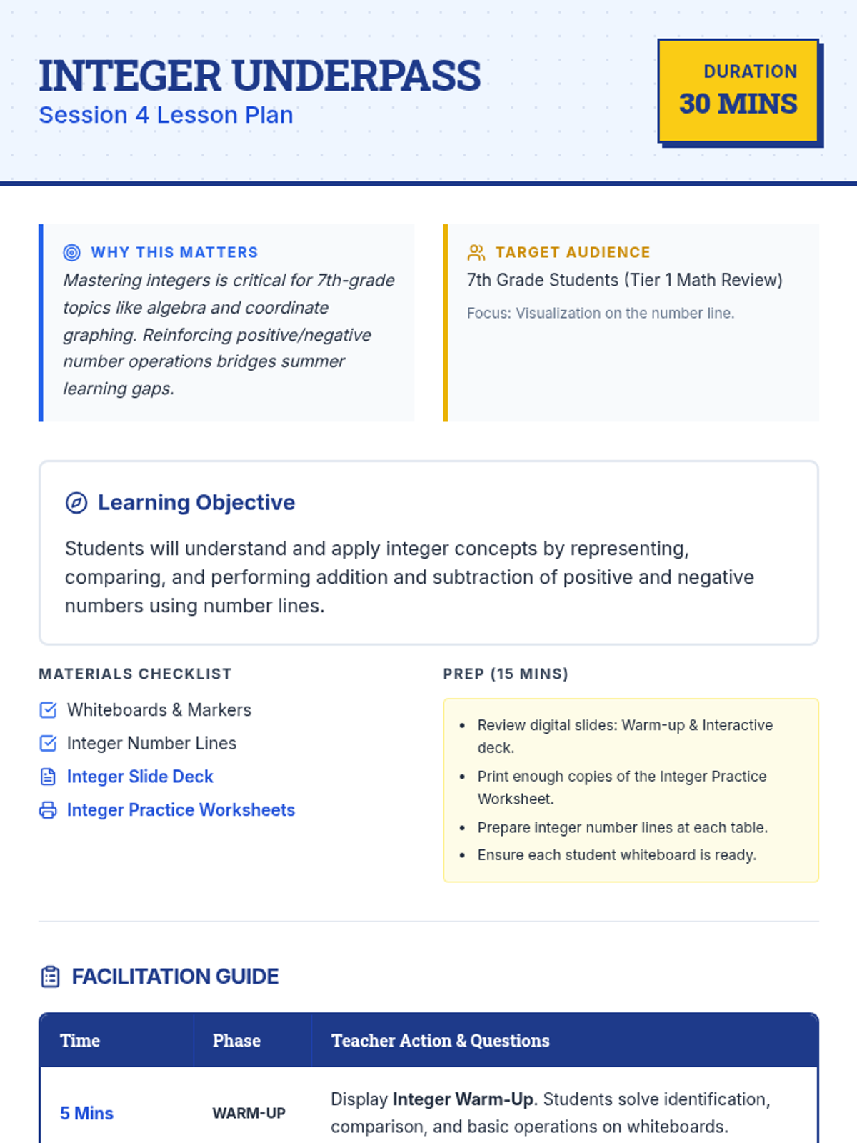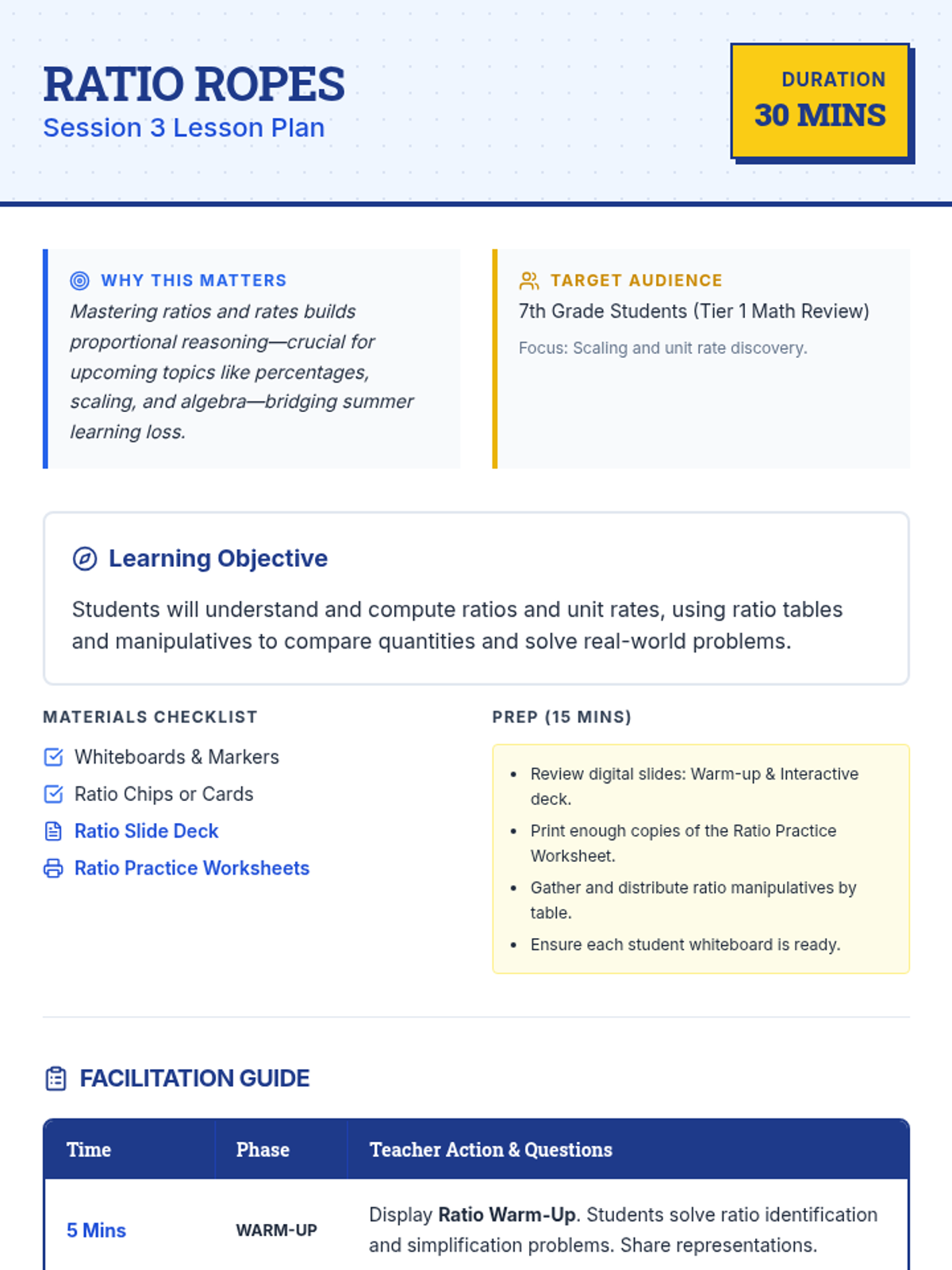 A 5-day math review sequence for rising 7th graders, covering fractions, decimals, ratios, integers, and one-step equations to prevent summer learning loss.