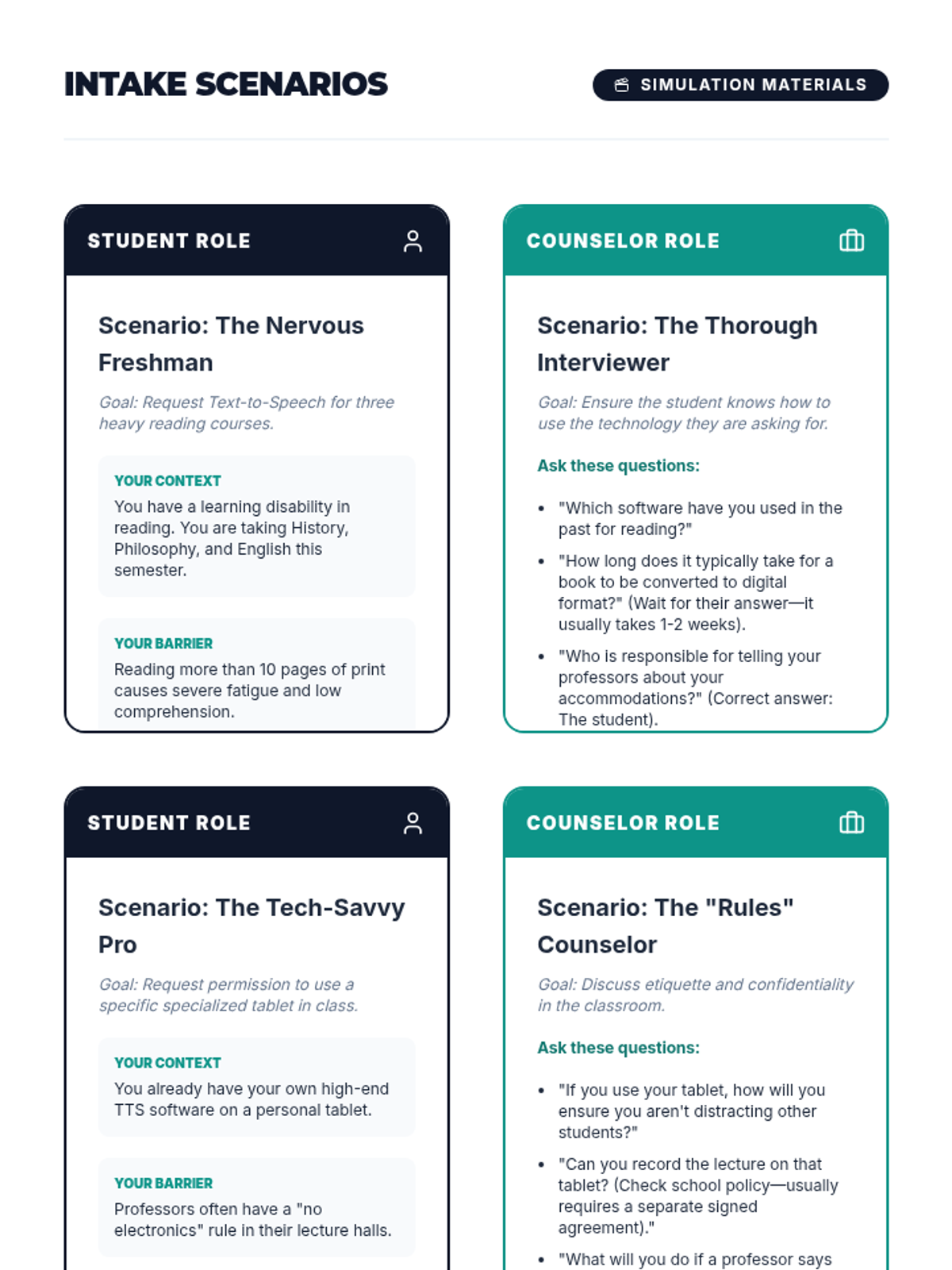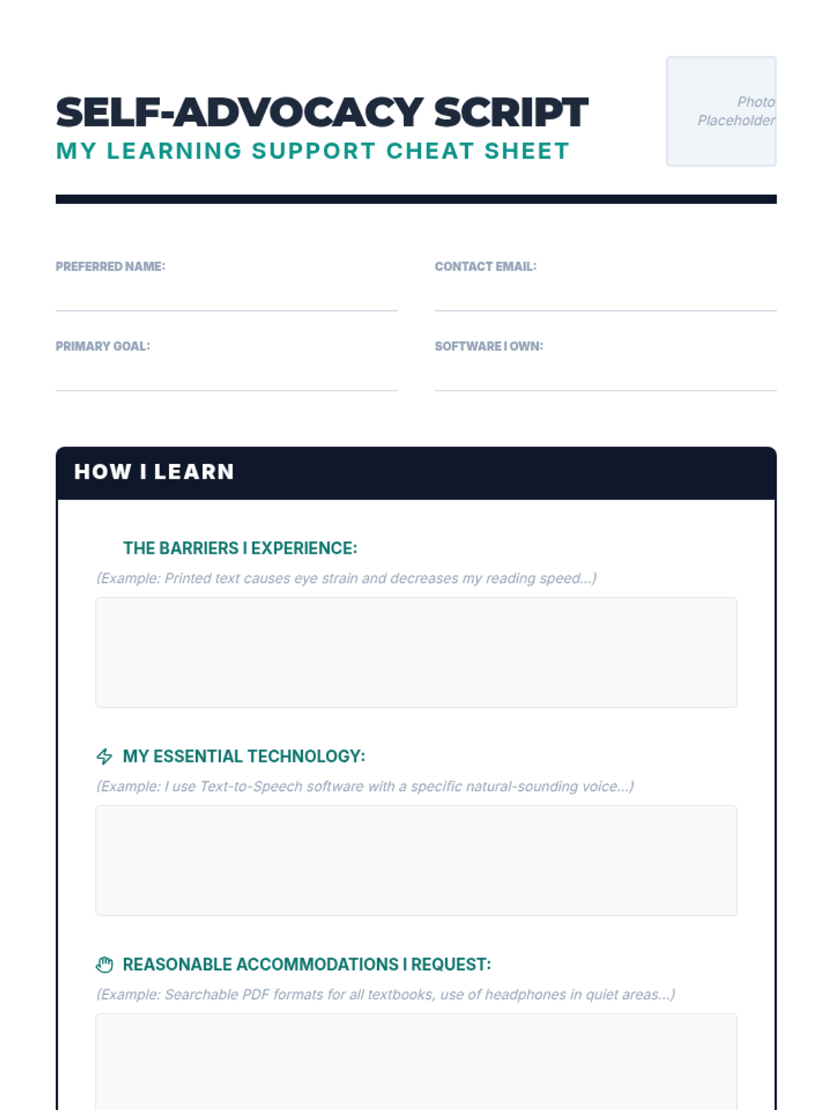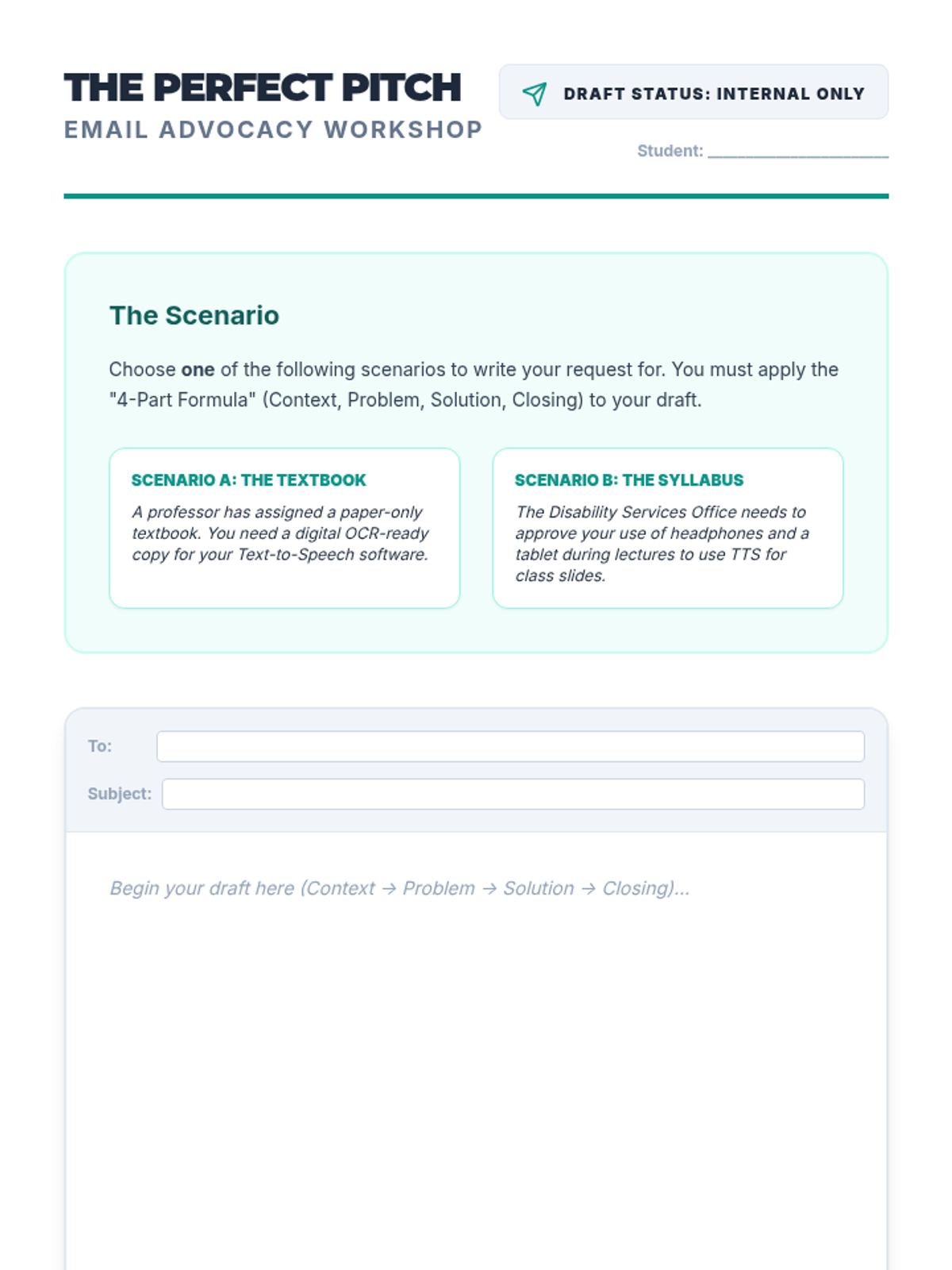 A comprehensive transition sequence for 12th-grade students focusing on the legal, professional, and practical aspects of using Text-to-Speech (TTS) and other assistive technologies in higher education and the workplace. Students learn to advocate for their rights under the ADA and Section 504 through role-play, professional writing, and portfolio building.