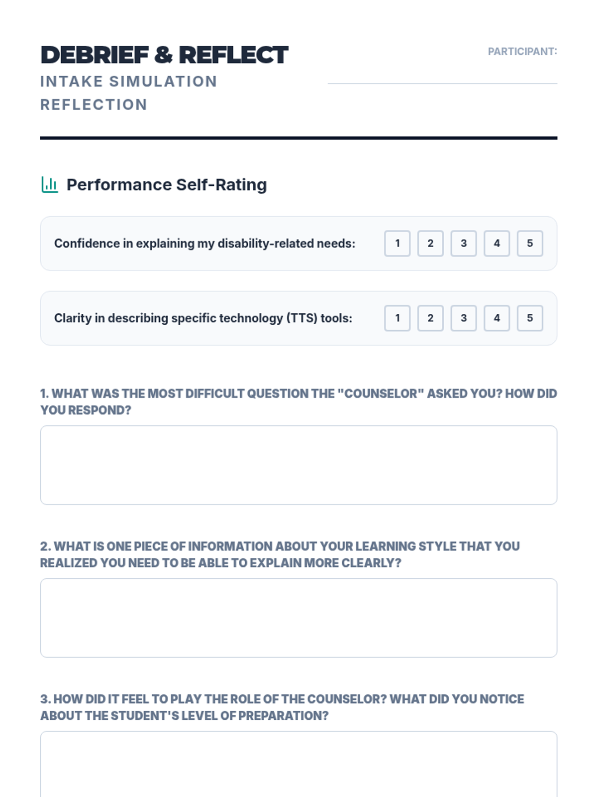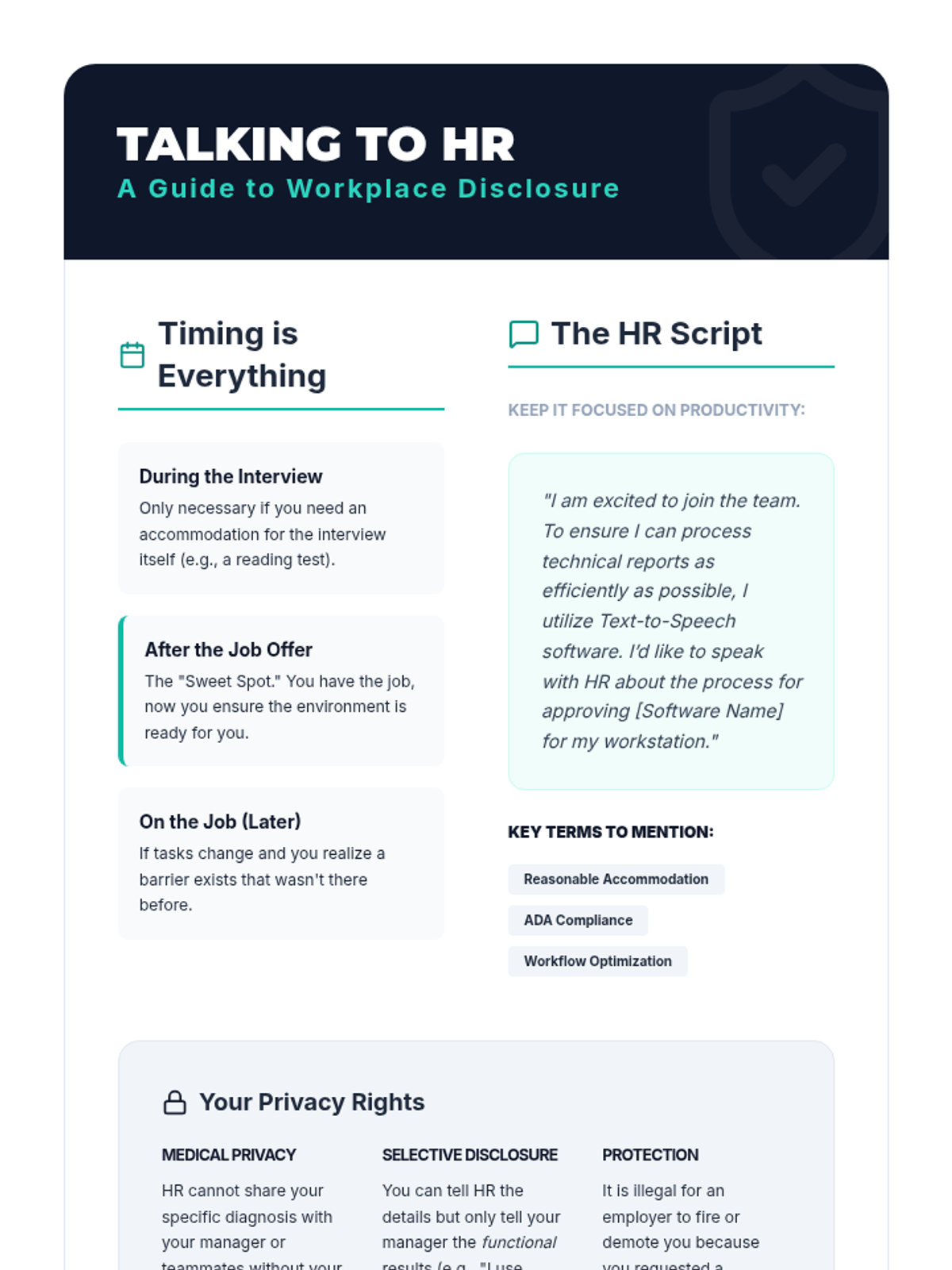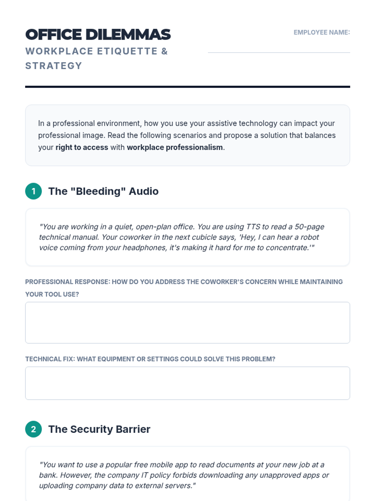 A comprehensive transition sequence for 12th-grade students focusing on the legal, professional, and practical aspects of using Text-to-Speech (TTS) and other assistive technologies in higher education and the workplace. Students learn to advocate for their rights under the ADA and Section 504 through role-play, professional writing, and portfolio building.