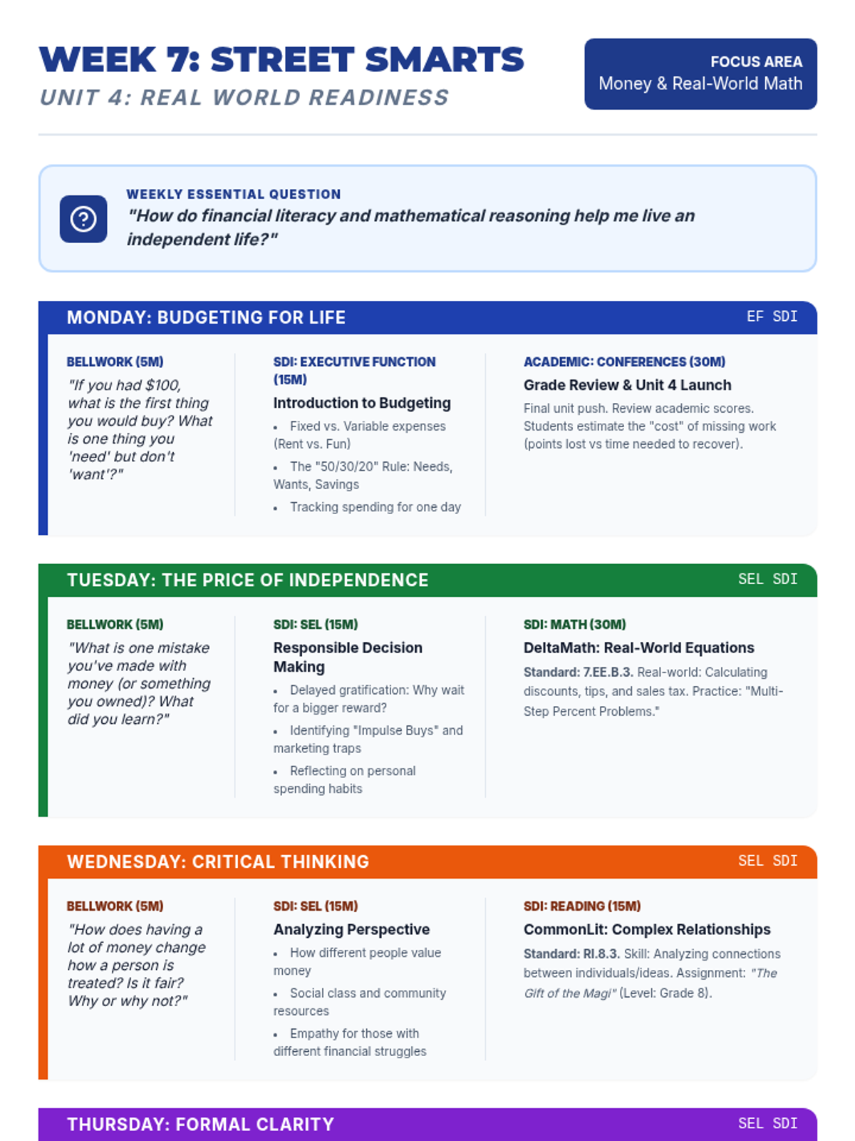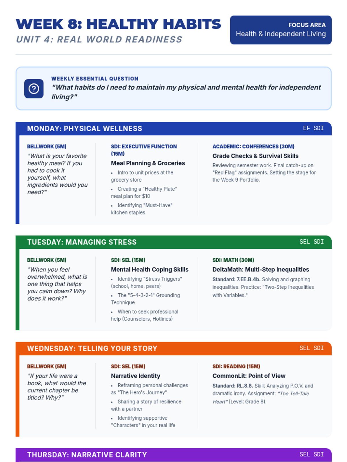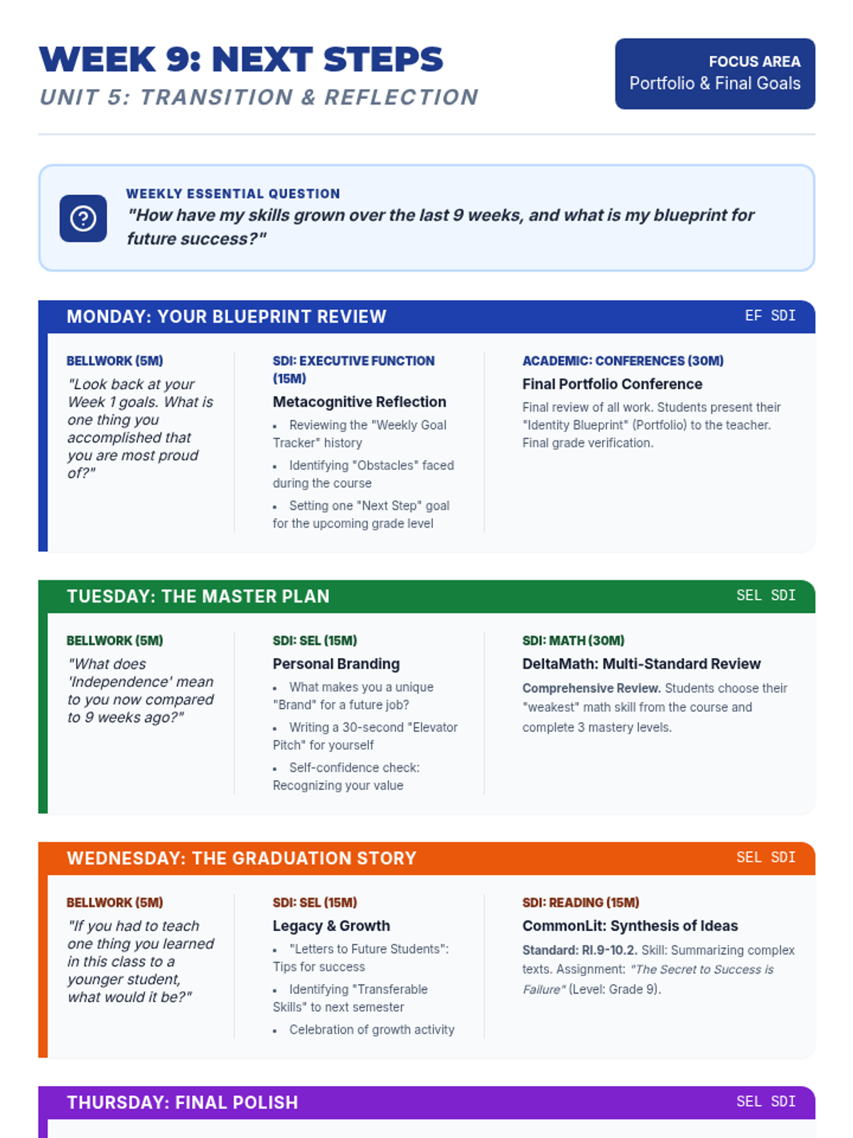 A comprehensive 9-week curriculum designed for special education students (grades 7-9) transitioning to adult life. The course integrates foundational reading, writing, and math skills (supported by CommonLit, NoRedInk, and DeltaMath) with essential SEL, executive function, and organizational training.