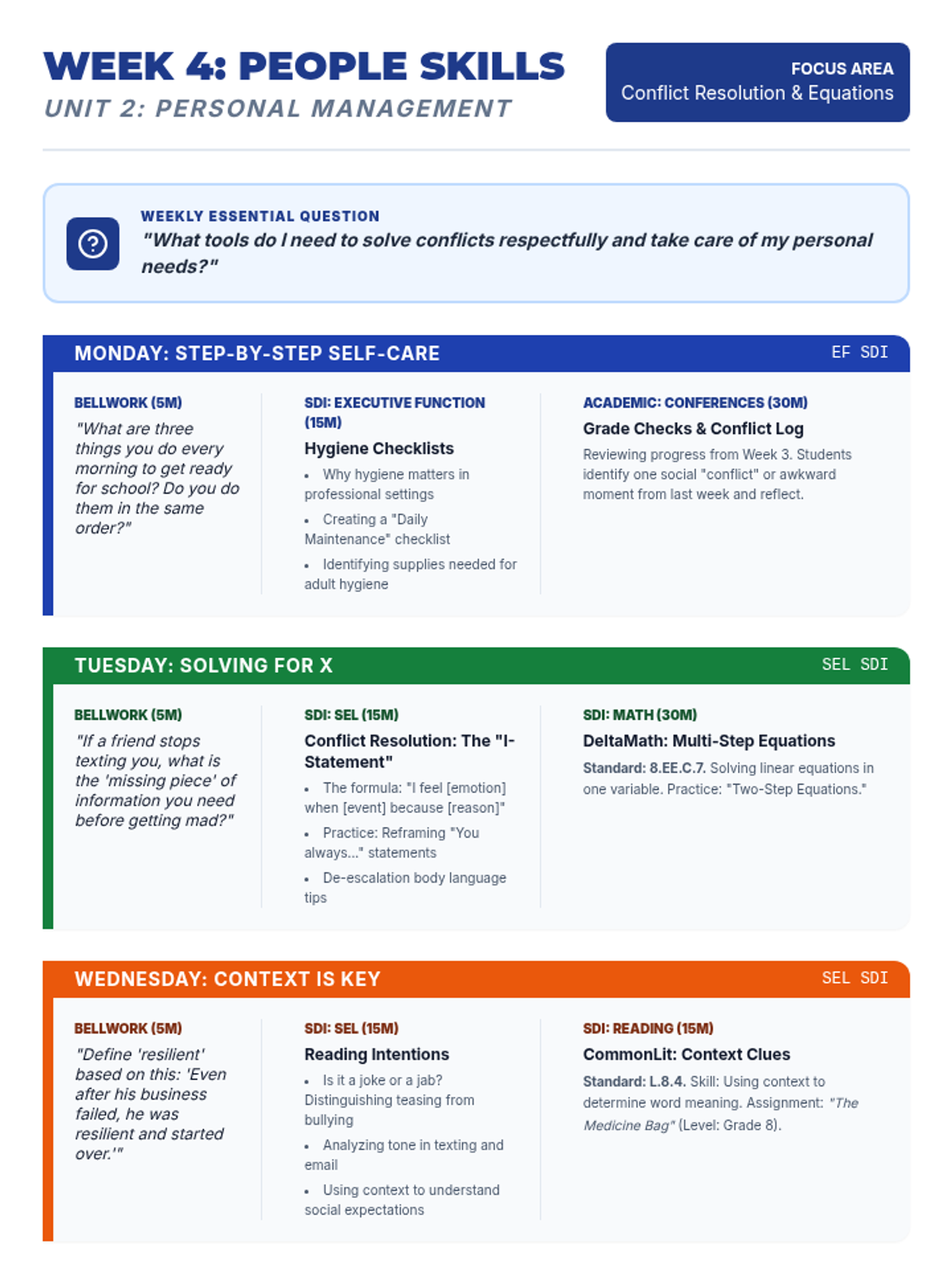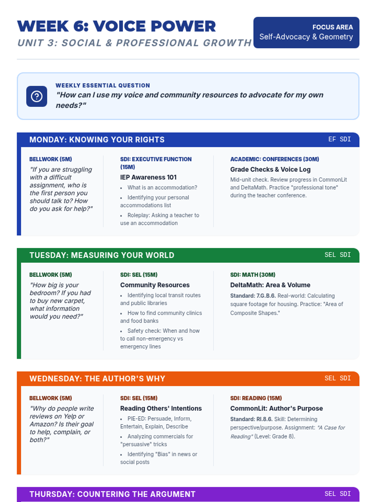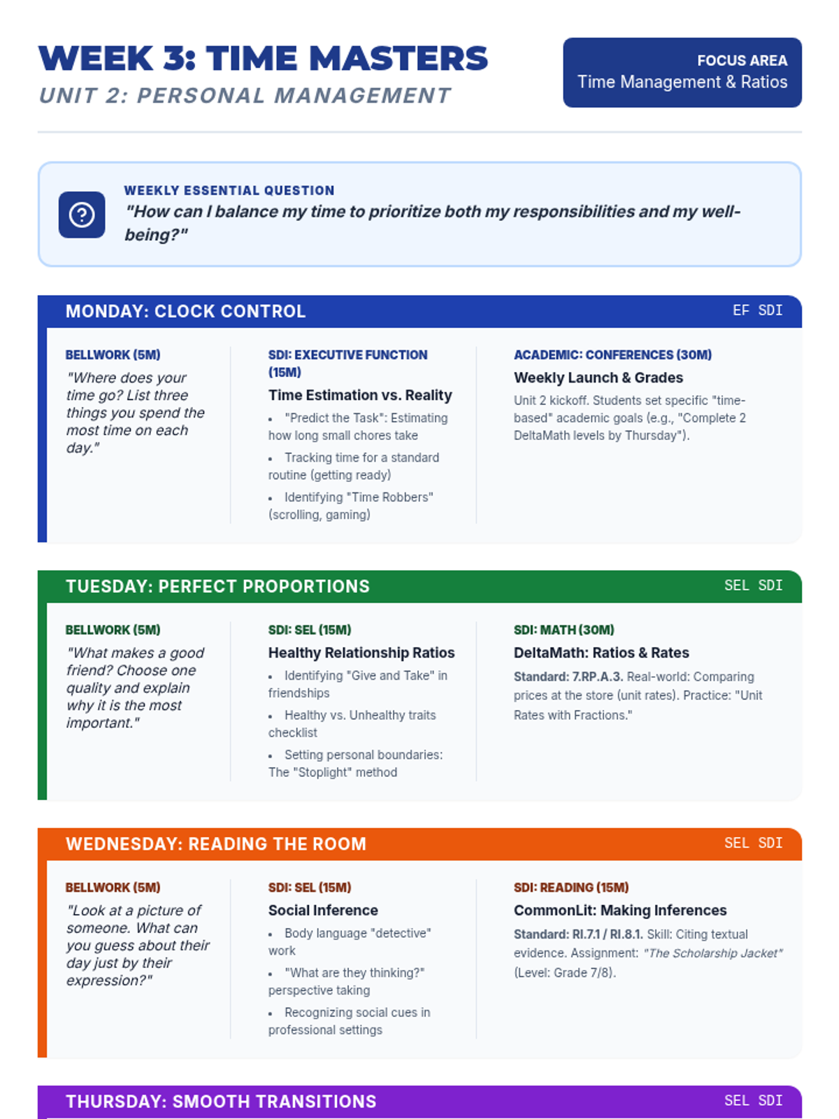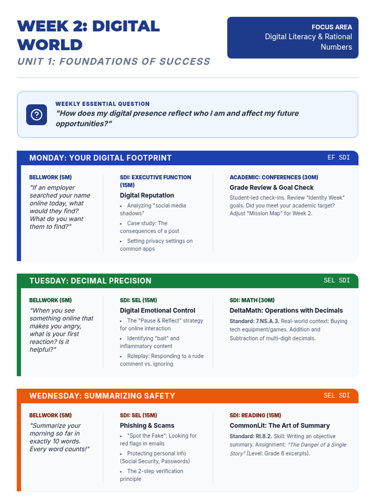 A comprehensive 9-week curriculum designed for special education students (grades 7-9) transitioning to adult life. The course integrates foundational reading, writing, and math skills (supported by CommonLit, NoRedInk, and DeltaMath) with essential SEL, executive function, and organizational training.