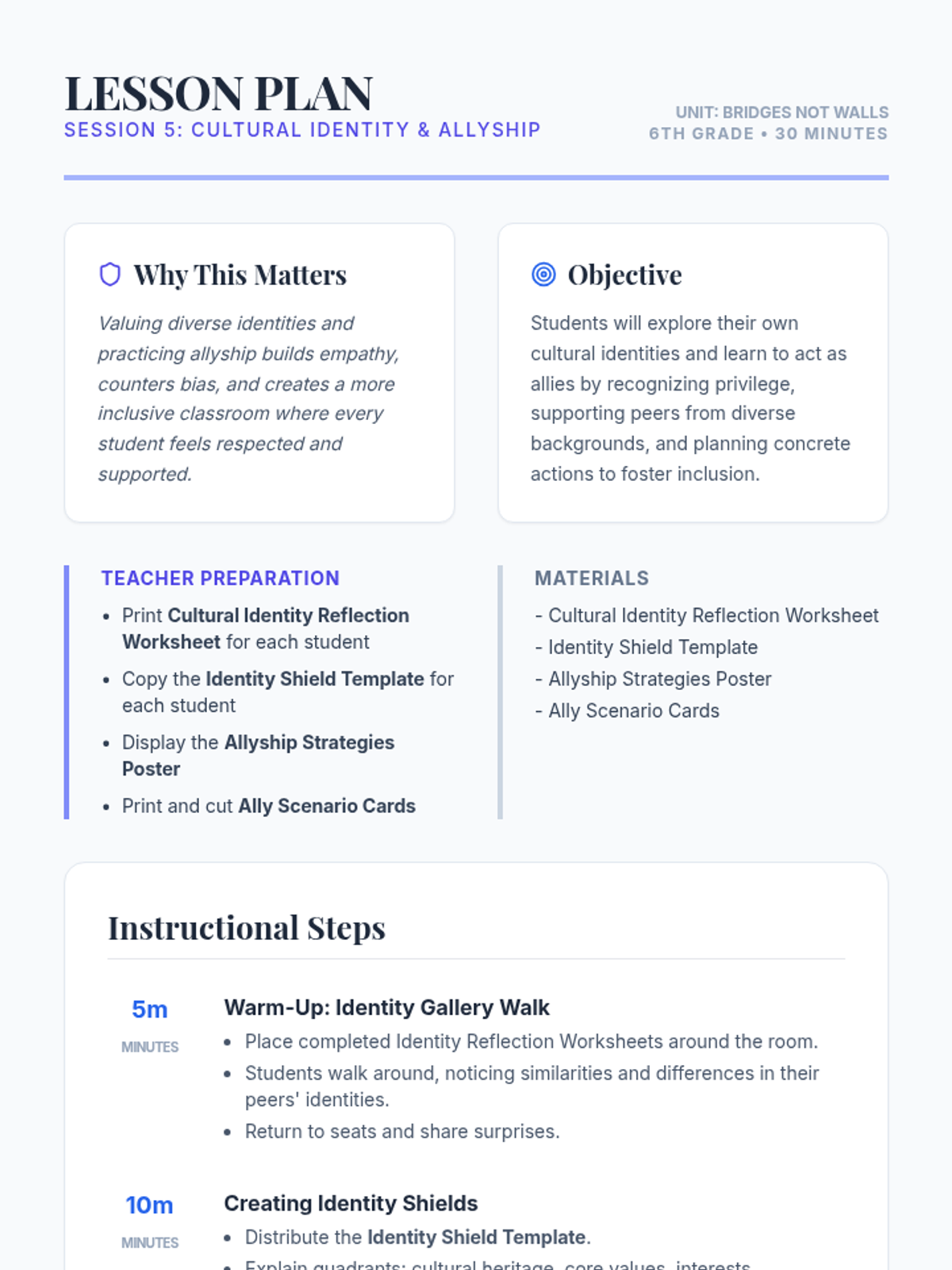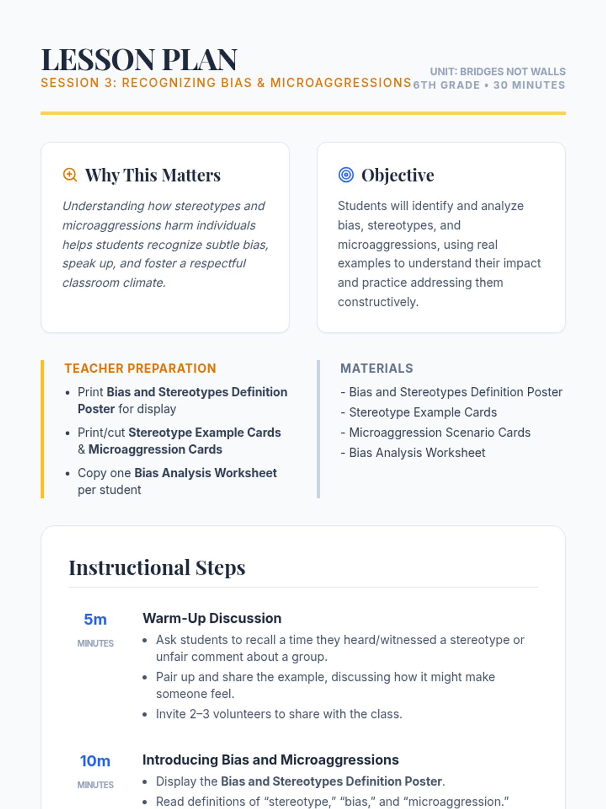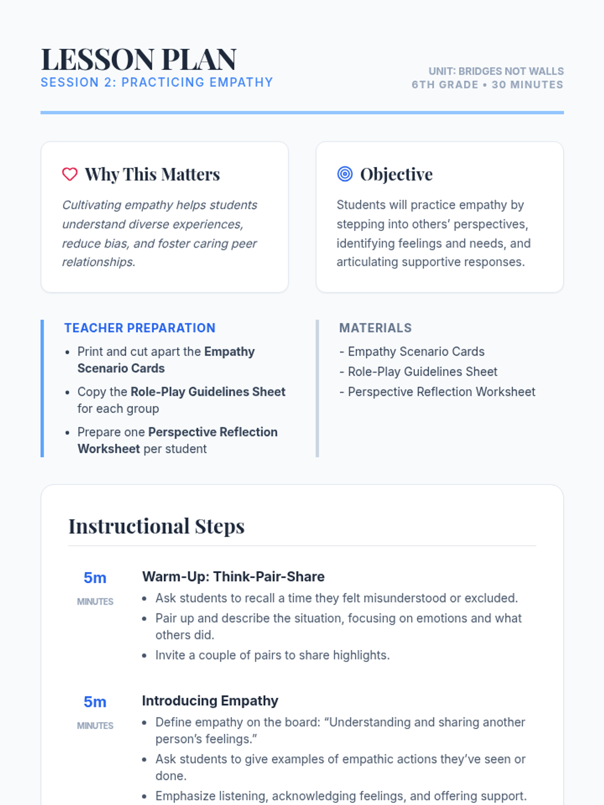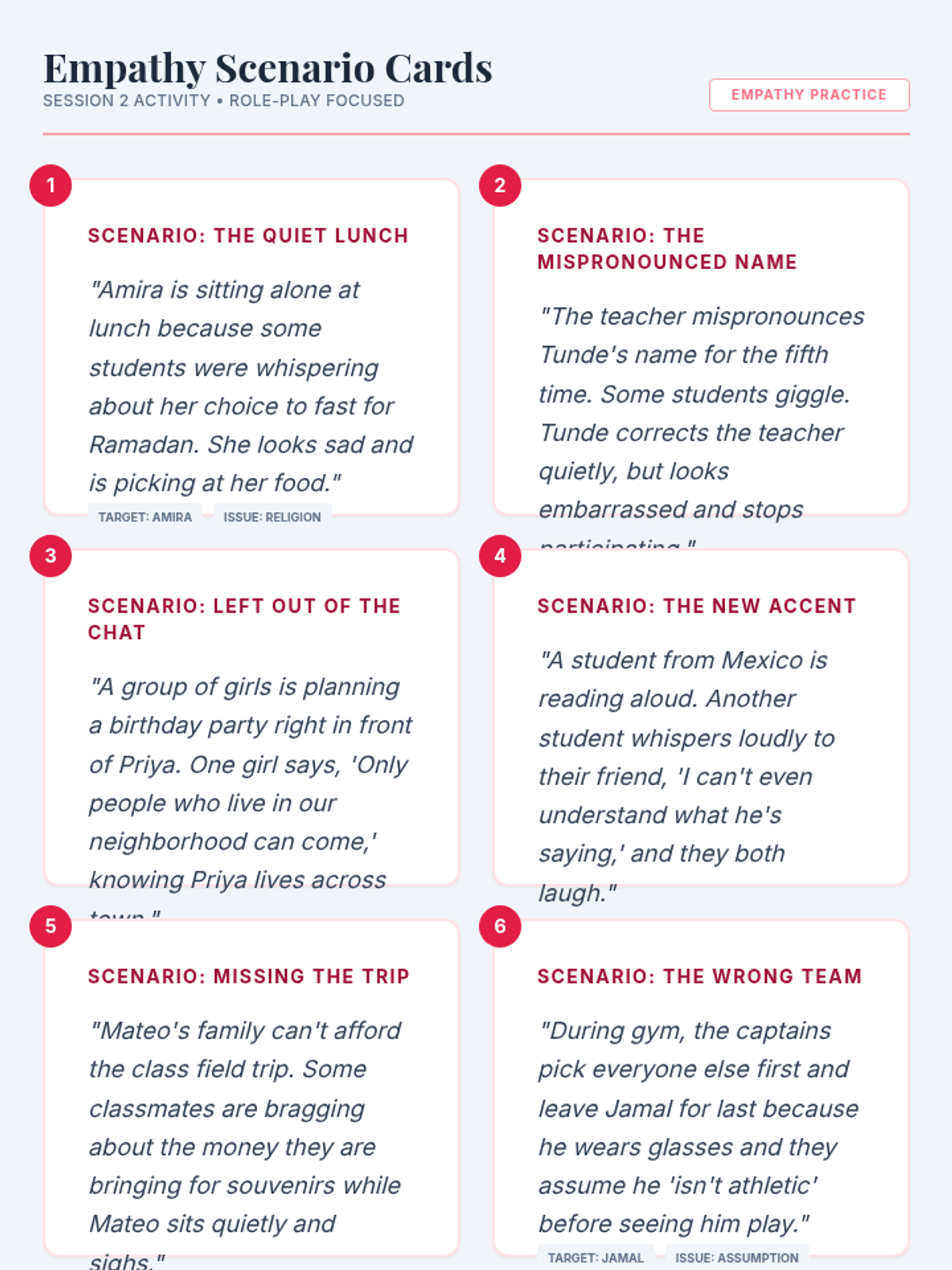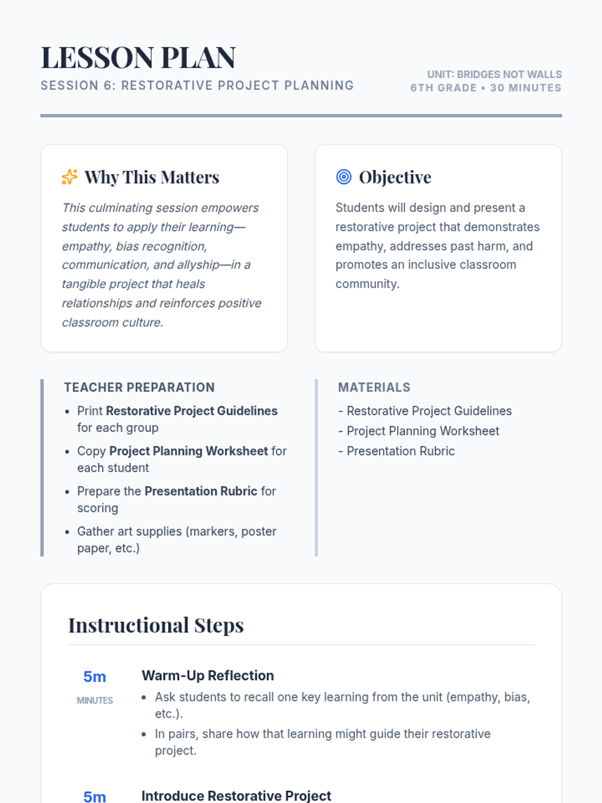 A six-session unit for 6th graders to explore empathy, diversity, and restorative practices after incidents of bullying tied to religion and race. Students learn to identify bias, practice healthy communication, and build inclusive communities.