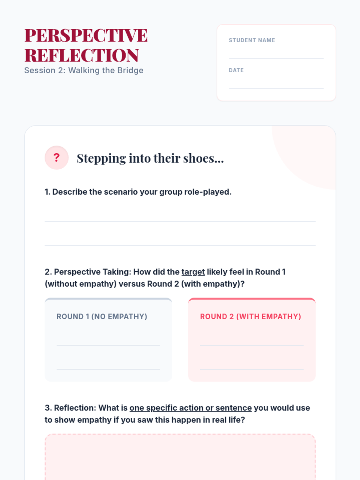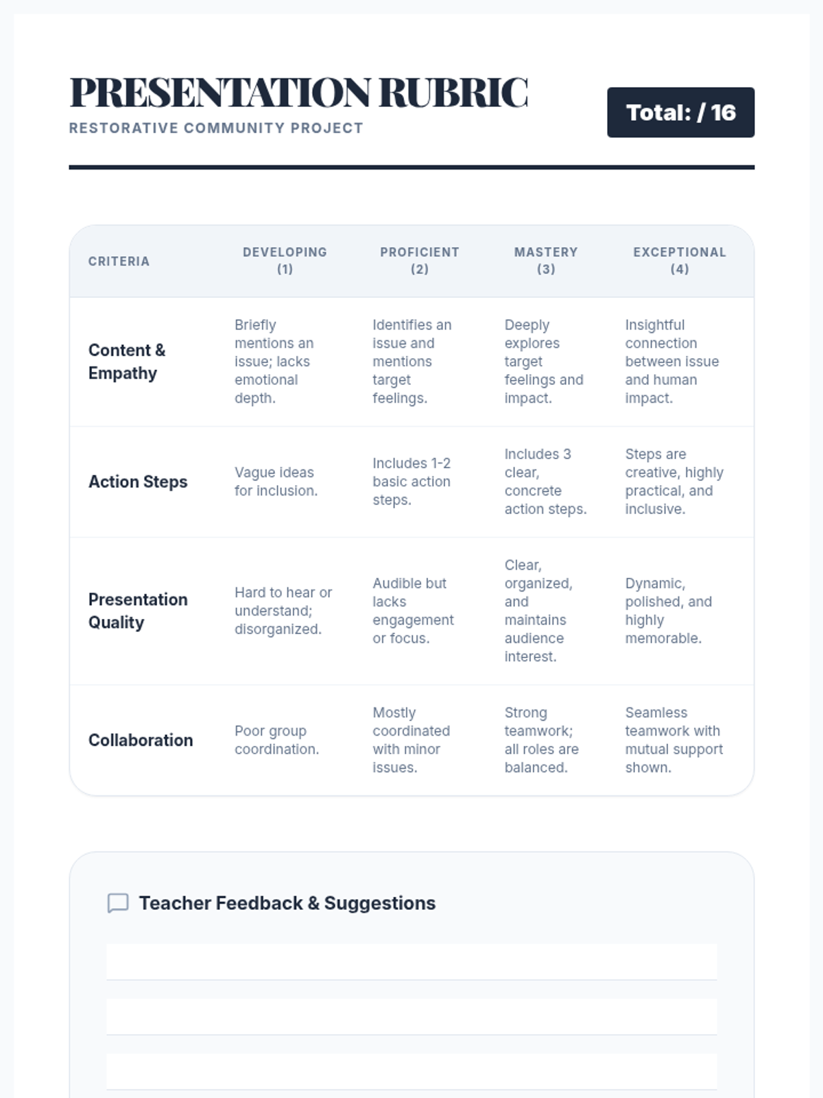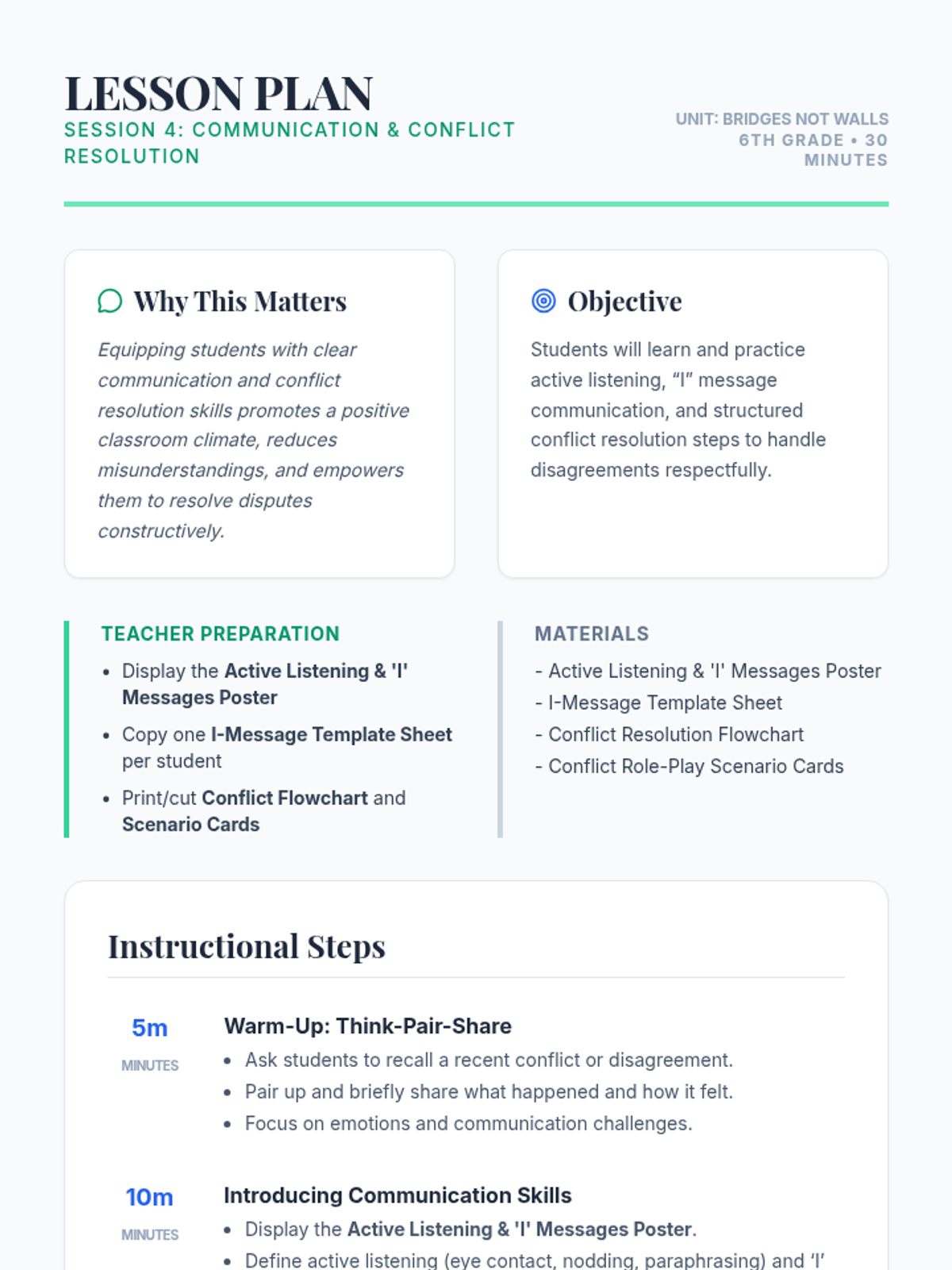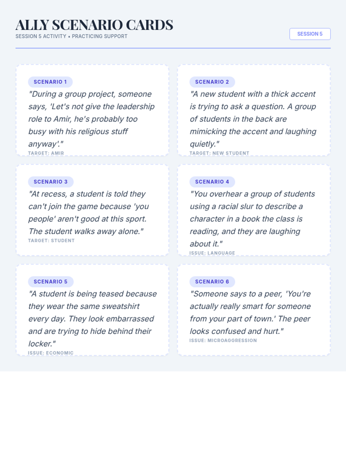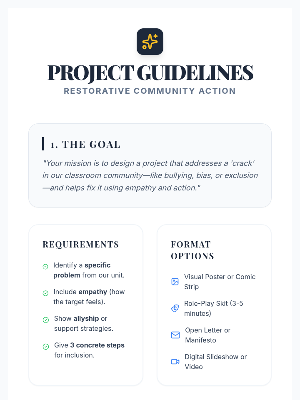 A six-session unit for 6th graders to explore empathy, diversity, and restorative practices after incidents of bullying tied to religion and race. Students learn to identify bias, practice healthy communication, and build inclusive communities.