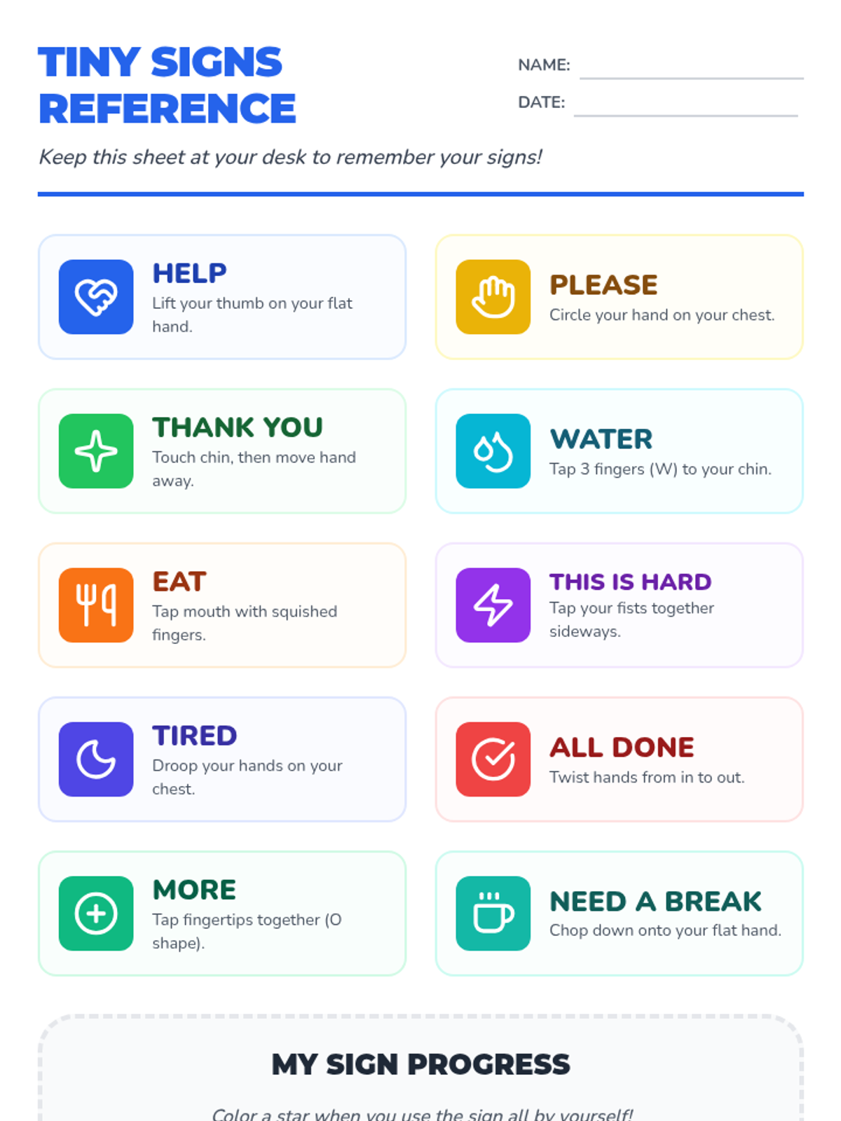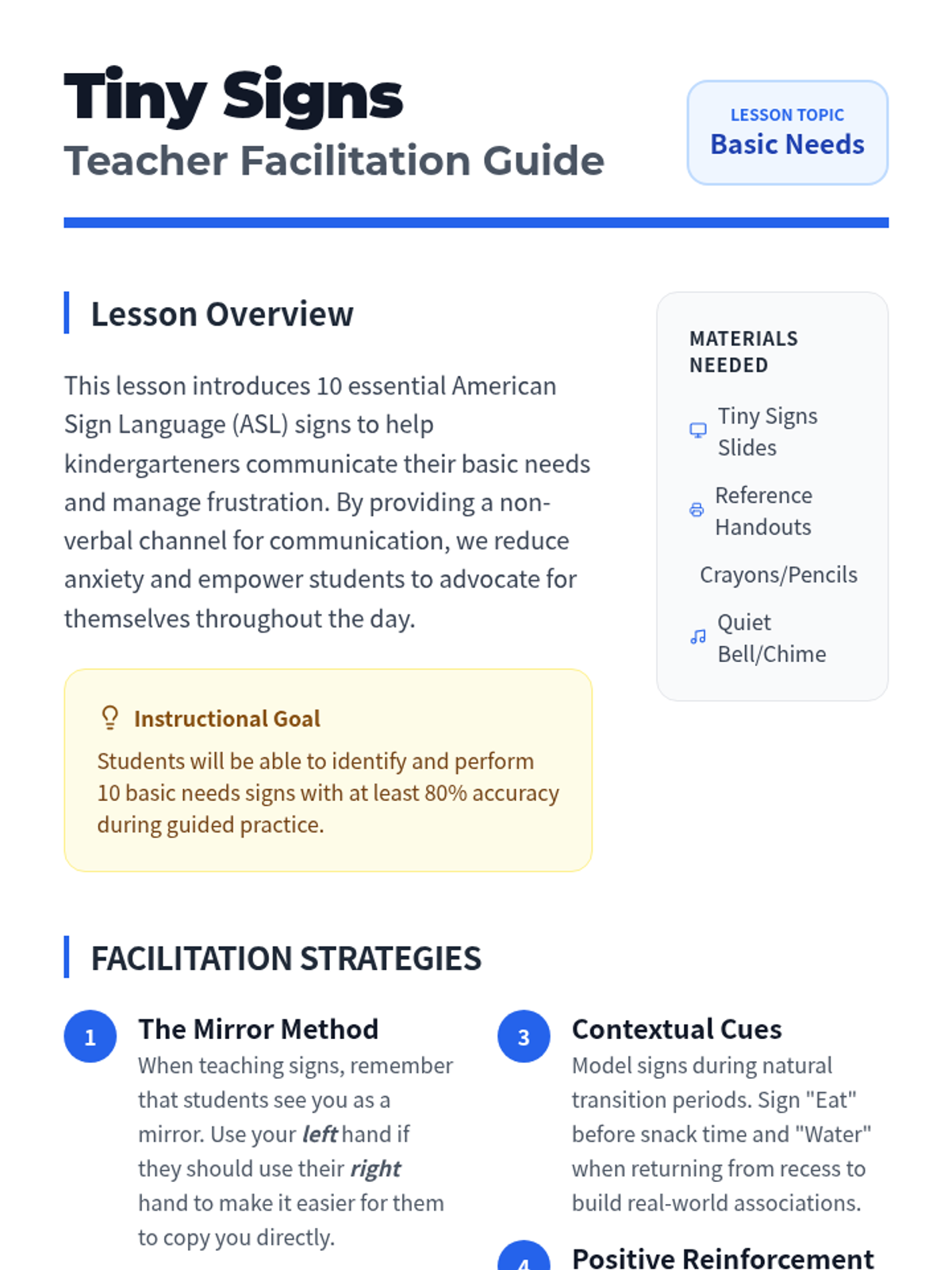 A sequence of lessons introducing young learners to American Sign Language for daily communication and social-emotional expression.