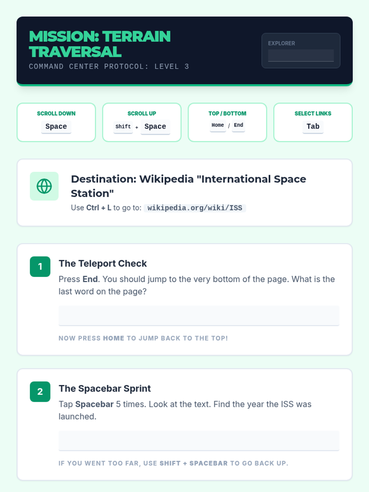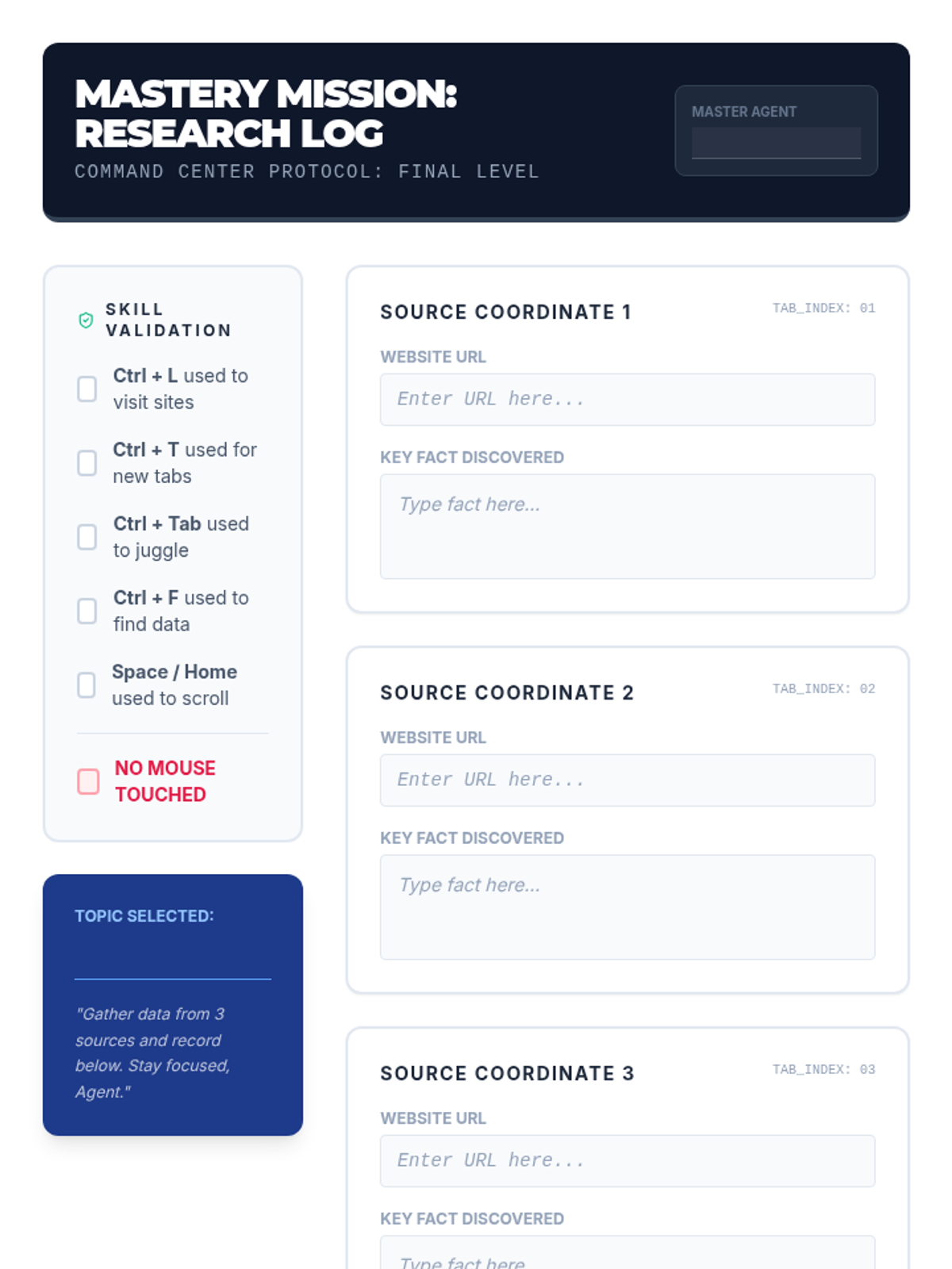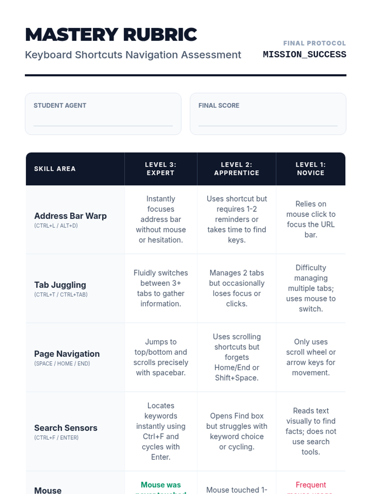A 5-lesson sequence designed for 6th-grade students, focusing on assistive technology through browser-based keyboard shortcuts. Students progress from basic interface navigation to complex, mouse-free research workflows.