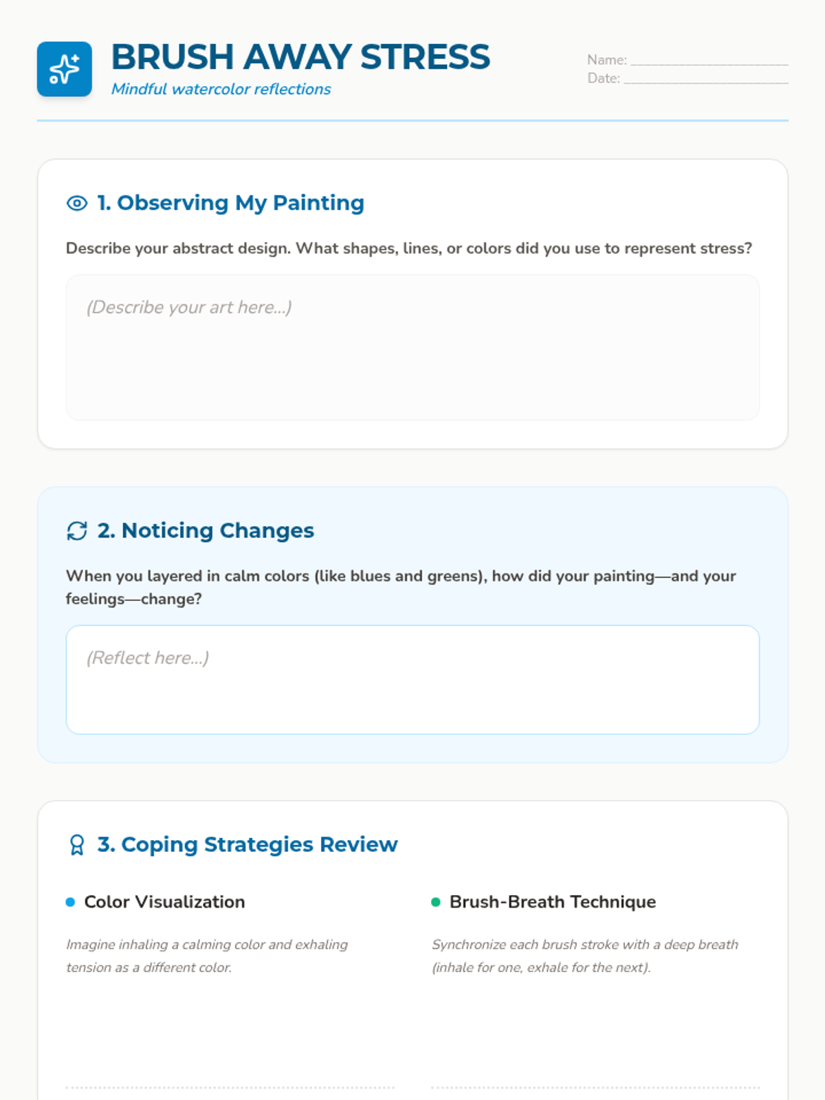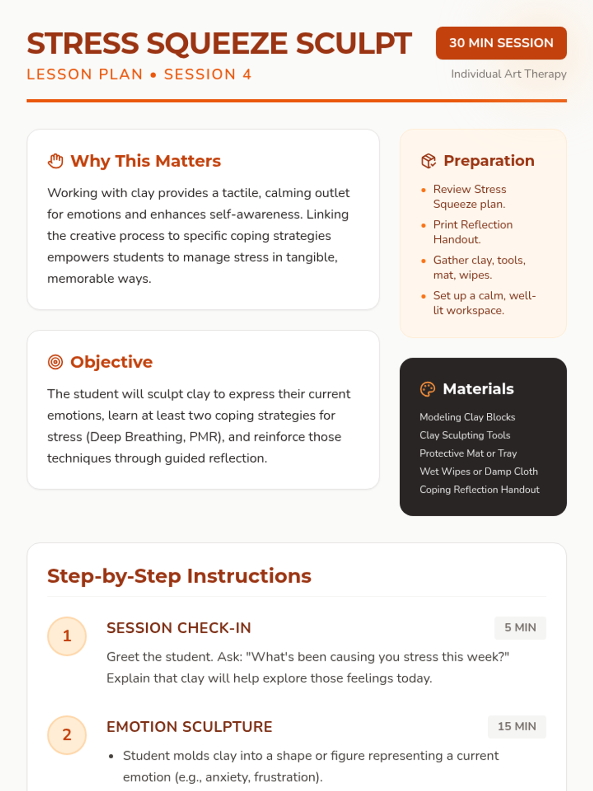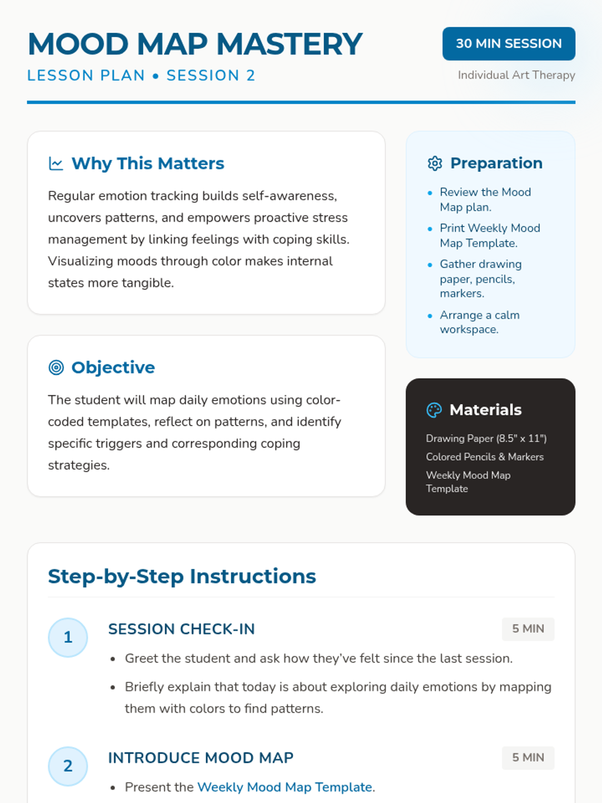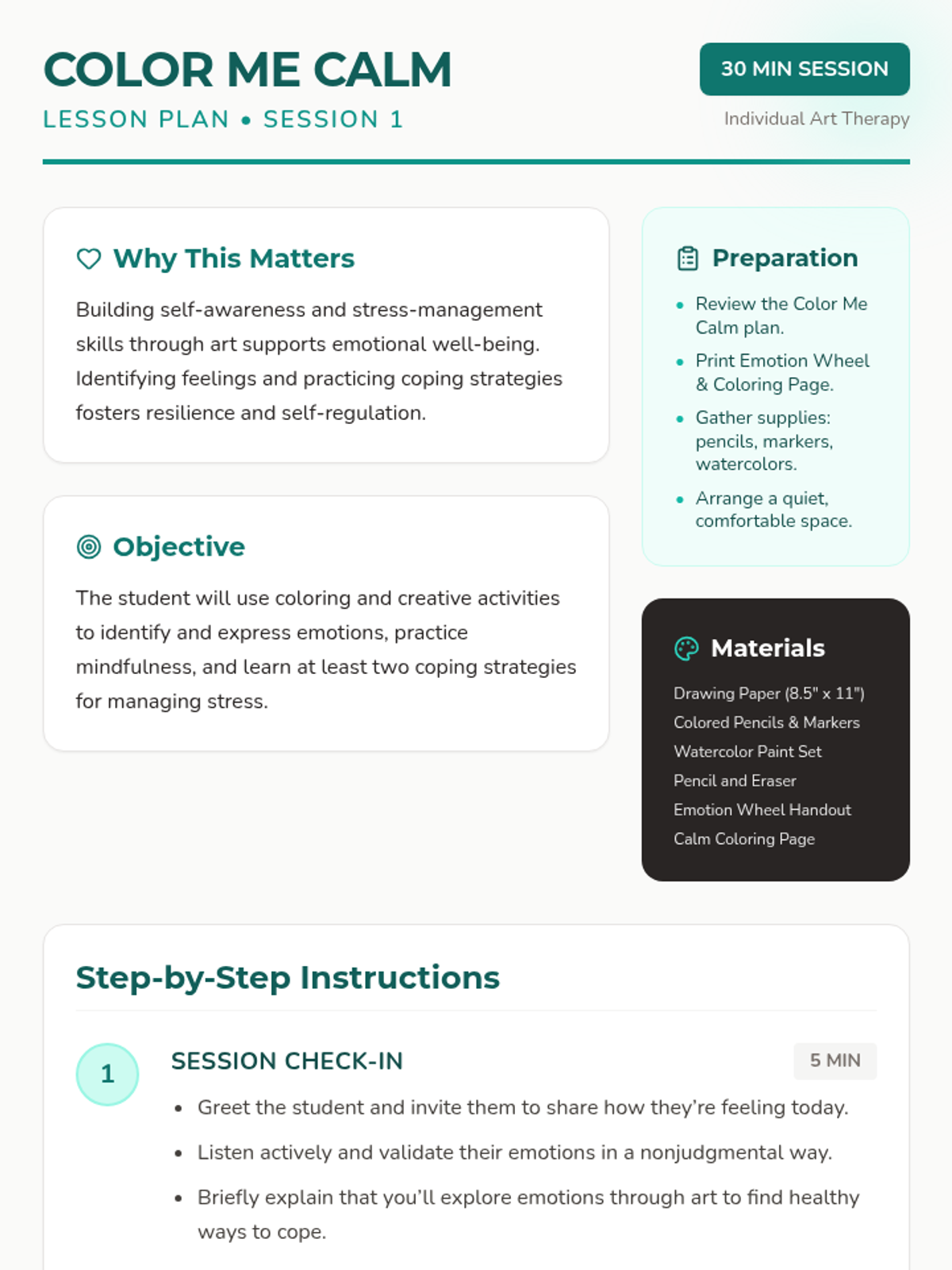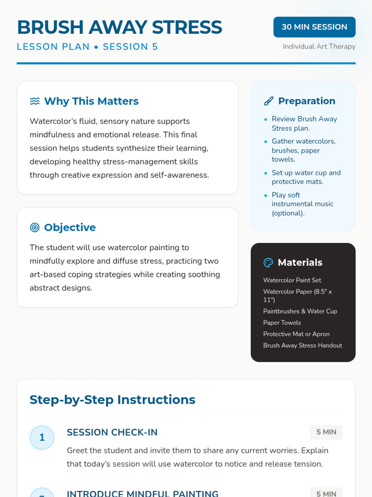 A sequence of five 30-minute individual art therapy sessions designed for 6th-grade students to explore emotions, build self-awareness, and develop coping strategies through creative expression.